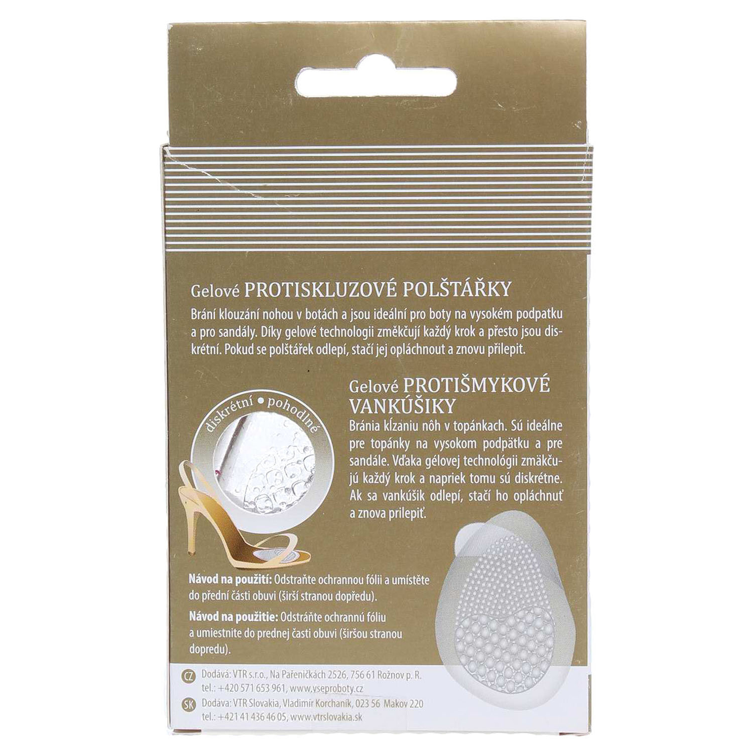 Gelové protiskluzové polštářky - brání klouzání nohou v obuvi a jsou ideální pro obuv na vysokém podpatku a pro sandály. Polštářky jsou velice diskrétní a díky gelové technologii změkčují každý krok. Polštářek je samolepící, lze jej znovu použít do jiné obuvi po opláchnutí vlažnou vodou. Návod na použití: odstraňte ochrannou fólii a umístěte do přední části obuvi (širší stranou dopředu).