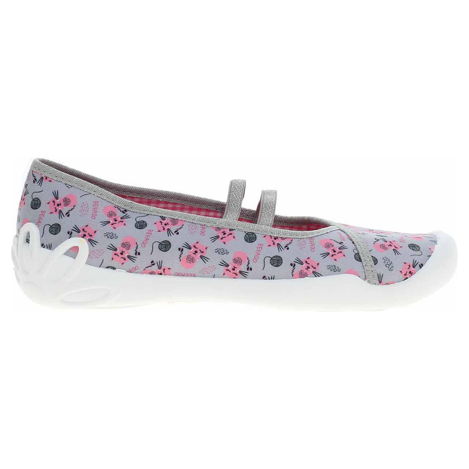 Boty Befado - dívčí domácí bačkory s textilním svrškem, podšívkou i stélkou. Obuv je vybavená vyměkčenou stélkou Soft-B systém a dýchající podešví. Gumičky přes nárt zajišťují pohodlné nazouvání a stabilitu nohy v obuvi. Dětská obuv - je vzhledem ke způsobu užívání vystavena většímu mechanickému poškození - okopání. Mechanické poškození není důvodem k reklamaci.