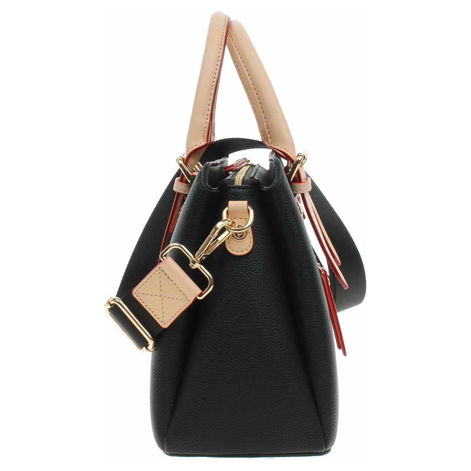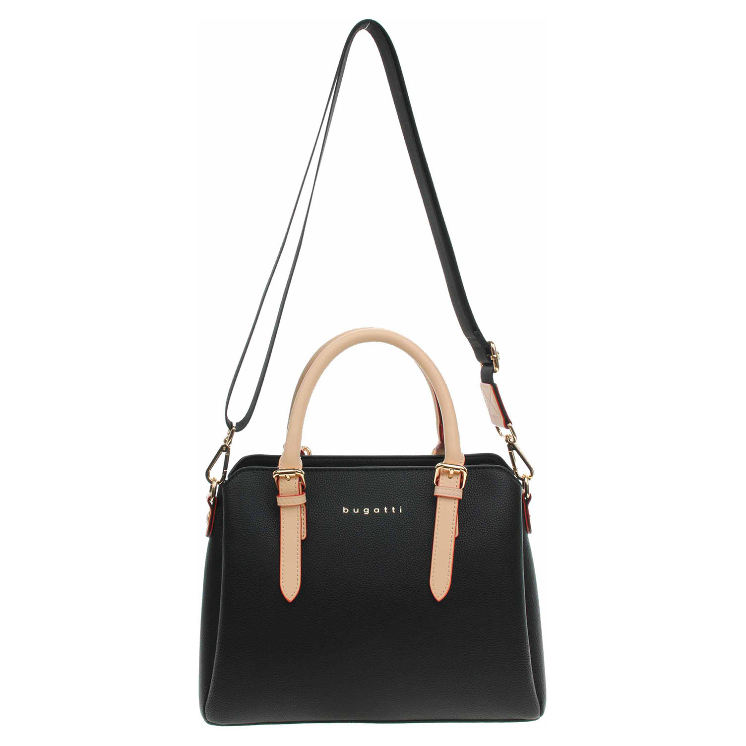 Bugatti - dámská kabelka se zapínáním na zip je vyrobená z polyuretanu a podšívka je z polyesteru. Pod zipem je na přední i na zadní straně komory kapsa bez zapínání. Kabelku je možno nosit v ruce (výška ucha 11 cm) nebo přes rameno na odepínatelném popruhu s karabinkami. Rozměry kabelky: 30 x 23 x 12 cm. Na zadní straně je kapsa se zipem. Přezky, karabinky, zipy jsou ve zlaté barvě. Vnitřní výbava: dvě kapsičky na drobnosti bez zapínání a jedna kapsa se zipem.