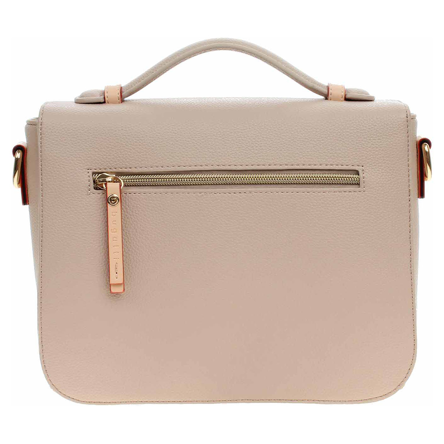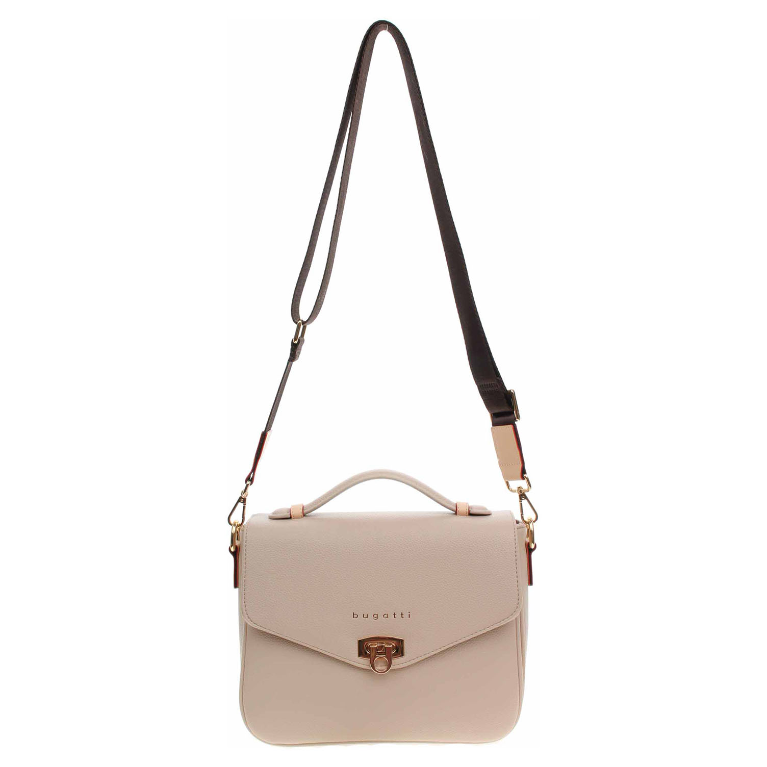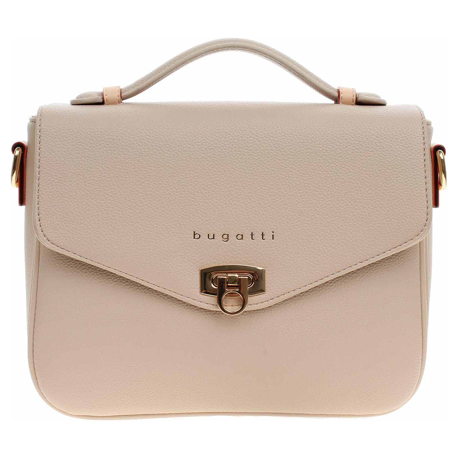 Bugatti - dámská jednokomorová, klopnová kabelka se zapínáním na otočný zámeček je vyrobená z polyuretanu s textilní podšívkou a má rozměry - 29 x 22 x 10 cm. Hlavní komora se zapíná na zip. Pod klopnou je kapsa bez zapínání. Na zadní straně kabelky je kapsa se zipem. Kabelku je možno nosit přes rameno na odepínatelném, regulovatelném popruhu s karabinkami nebo v ruce za krátké ucho. Zámeček, kroužky, zipy a karabinky jsou ve zlaté barvě. Vnitřní výbava: 1x kapsa se zipem, 1x kapsa bez zapínání.