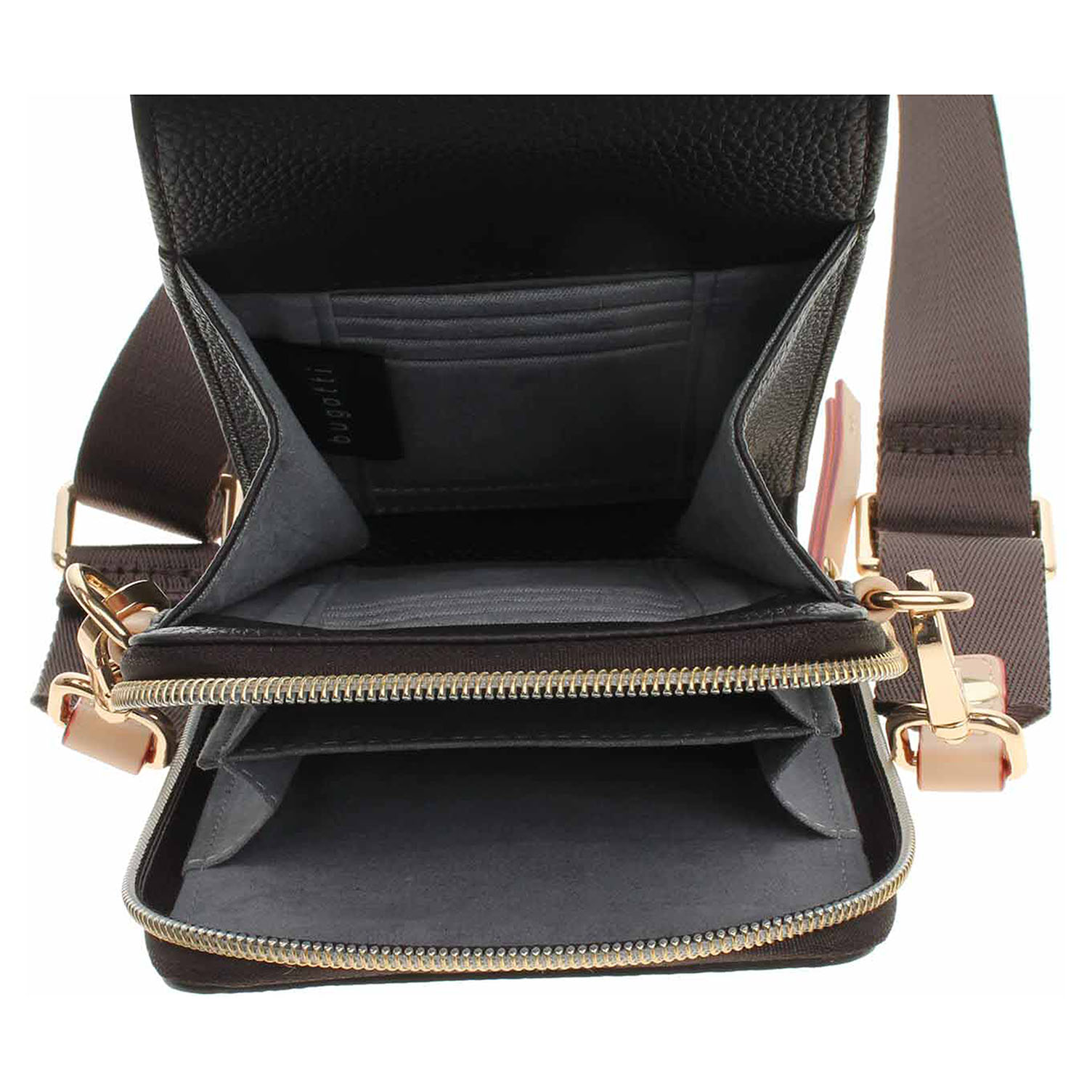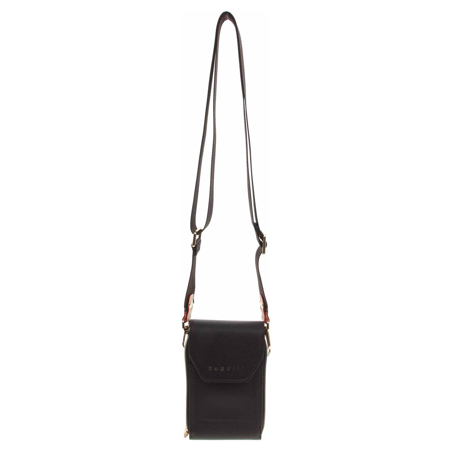Bugatti - dámská, dvoukomorová crossbody na mobil ze 100% polyuretanu s klopnou, která se zapíná na patent, má rozměry 11 x 19 x 4 cm. Kabelku na mobil je možné nosit crossbody na regulovatelném, odepínatelném pásku s karabinkami nebo po odepnutí popruhu jen v ruce jako pouzdro. Pod klopnou je malá kapsička bez zapínání a dvě komory. První komora na mobil se zapíná na zip a je rozdělená na dva oddíly. Druhá komora je bez zapínání a je vybavená kapsičkami na platební karty.