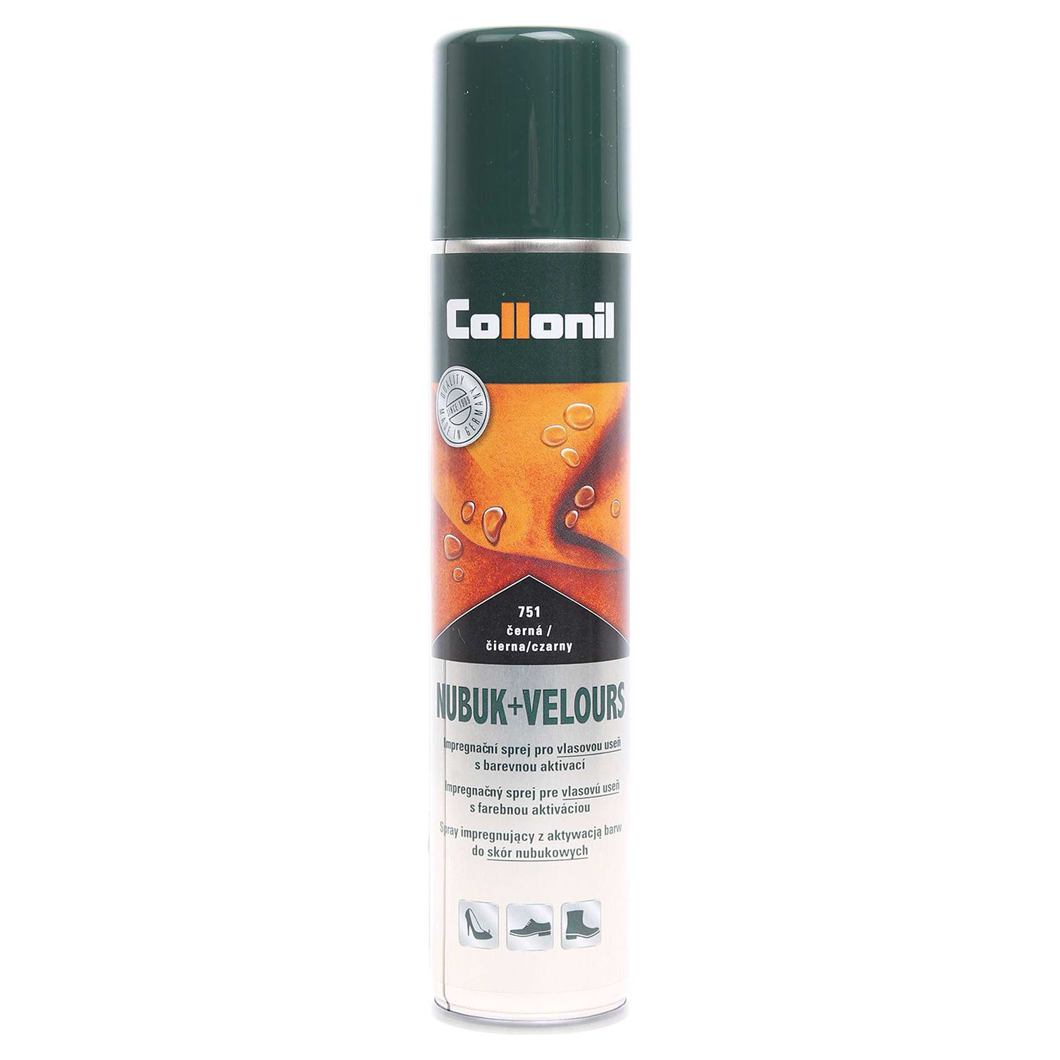 Collonil Nubuk + Velours - černý - 200 ml - prostředek na impregnaci a ošetřování výrobků ze semiše a nubuku. V barevném provedení impregnuje a zvlášť intenzivně oživuje barvy. Barevný sprej není vhodný pro kožené oděvy a galanterii. Nástřik provádíme ze vzdál. cca 20 cm a podle potřeby opakujeme. Po zaschnutí povrch obuvi vykartáčujeme krepovým kartáčkem. Vhodný i na textilní obuv. Možnost použití i na výrobky s GORE-TEXovou membránou.