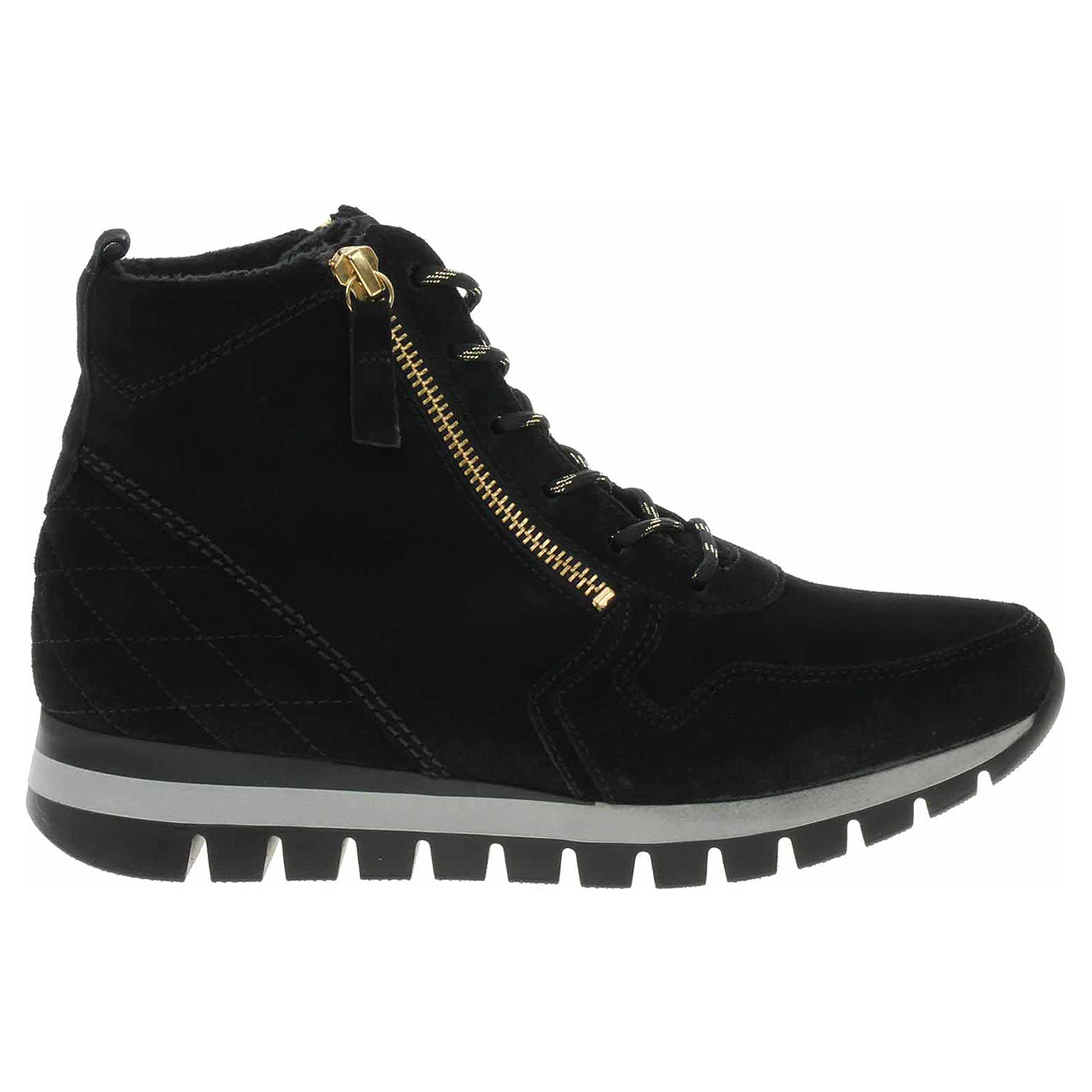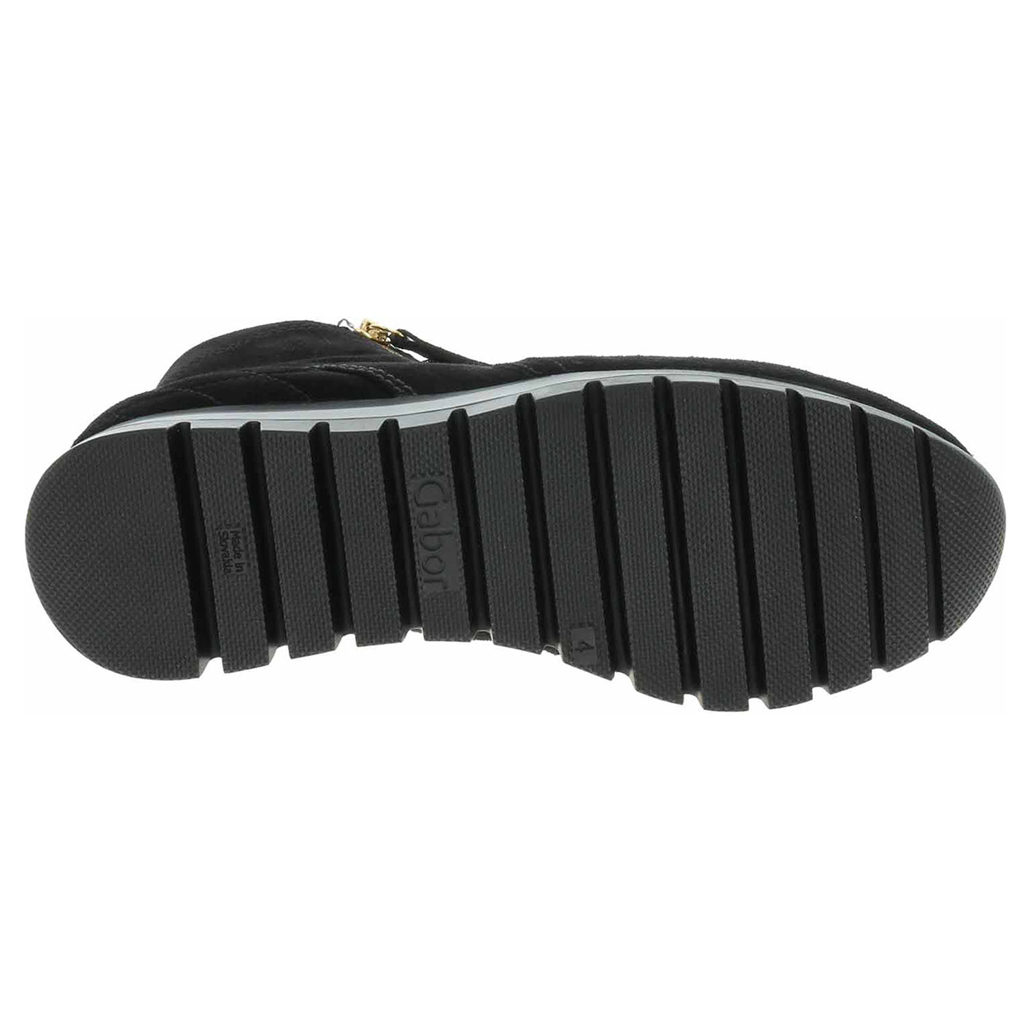 Boty Gabor Comfort - lepená dámská kotníková obuv nadměrné šíře H se svrškem z usně (velur) s textilní podšívkou s chloupkem je pro pohodlné nazouvání vybavená na vnější i na vnitřní straně nártu zipem a šněrováním.Vyndavací stélku OptiFit s textilní nášlapnou vrstvou je možné vyndat za účelem provětrání a omytí. Značnou výhodu nabízejí vyměnitelné vložky do bot také těm uživatelům, kteří používají ortopedické vkládací stélky. Jedná se o obuv obzvláště pohodlné šířky H. U výrobků řady "Comfort" nabízí Gabor obuv šířky H (větší šířka). To znamená, že tato obuv poskytuje ještě více prostoru pro prsty, bříška palců a oblast nártu a tím i více nezbytného pohodlí. Klínek je vysoký 3,5 cm a platforma je vysoká 2,- cm. Lepená obuv - pevnost lepeného spoje může být negativně ovlivněna promáčením nebo propocením, event. opakovaným používáním nedostatečně vysušené obuvi. Při neopatrné chůzi může dojít k mechanickému uvolnění lepeného spoje - ukopnutí.