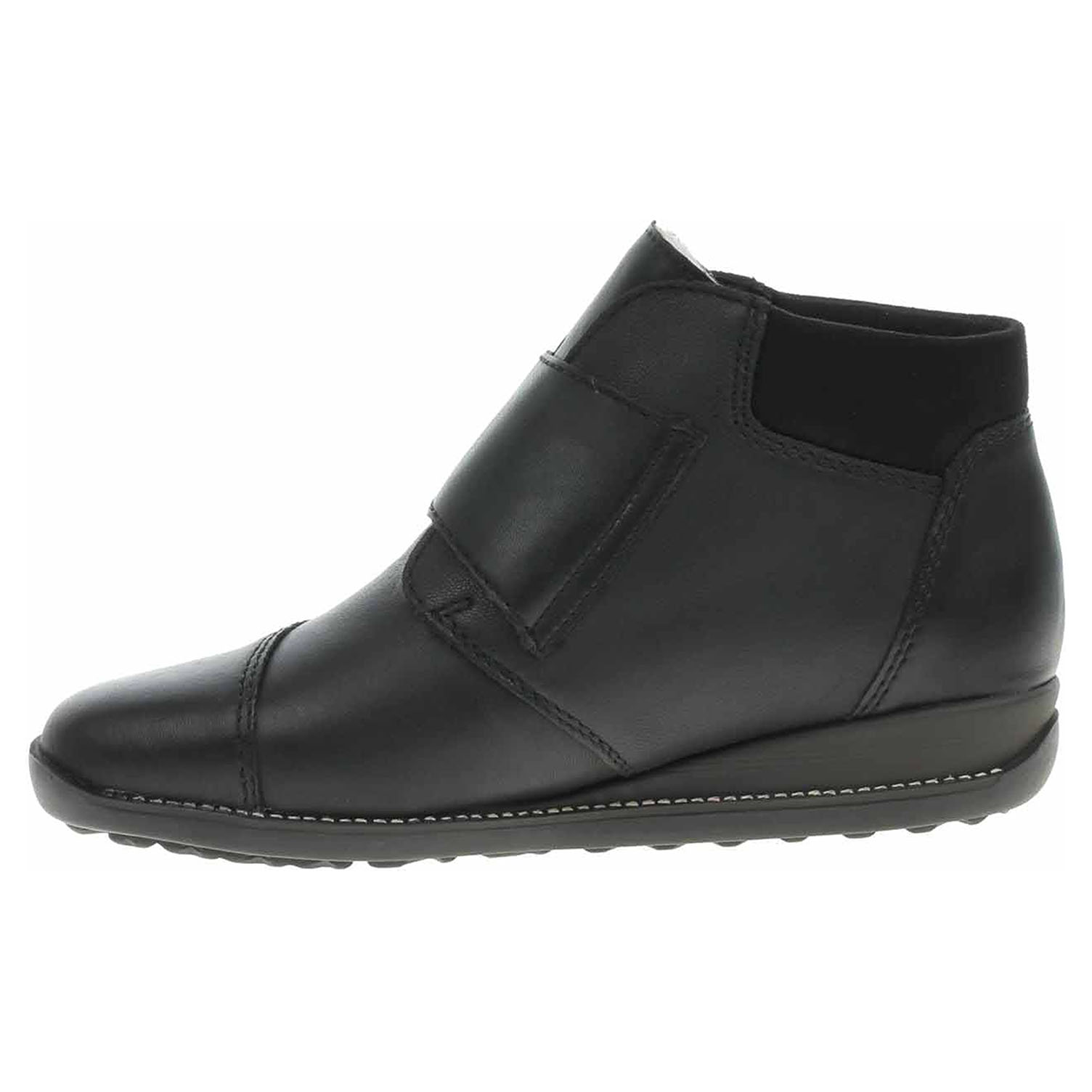 Boty Rieker - lepená dámská kotníková obuv s vodoodpudivou membránou RiekerTex má svršek z usně, textilní stélku a je vyteplená podšívkou ze střižní ovčí vlny s jemným chloupkem. Pohodlné nazouvání zajišťuje pásek přes nárt, který se zapíná na suchý zip. Klínek je vysoký 3,- cm. Podešev je flexibilní a díky systému Antistress skvěle tlumí nárazy a otřesy. Lepená obuv - pevnost lepeného spoje může být negativně ovlivněna promáčením nebo propocením, event. opakovaným používáním nedostatečně vysušené obuvi. Při neopatrné chůzi může dojít k mechanickému uvolnění lepeného spoje - ukopnutí.