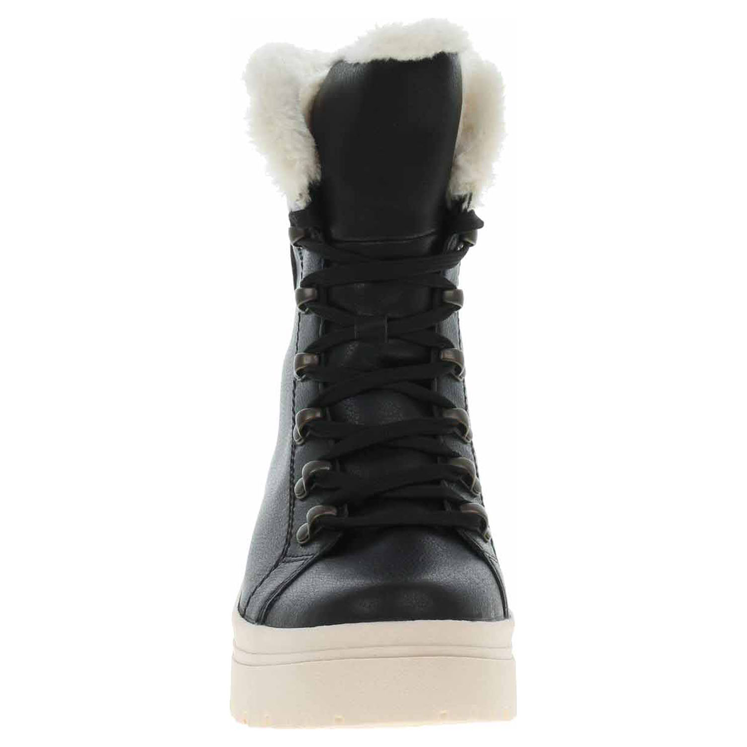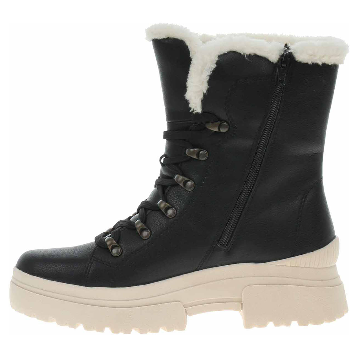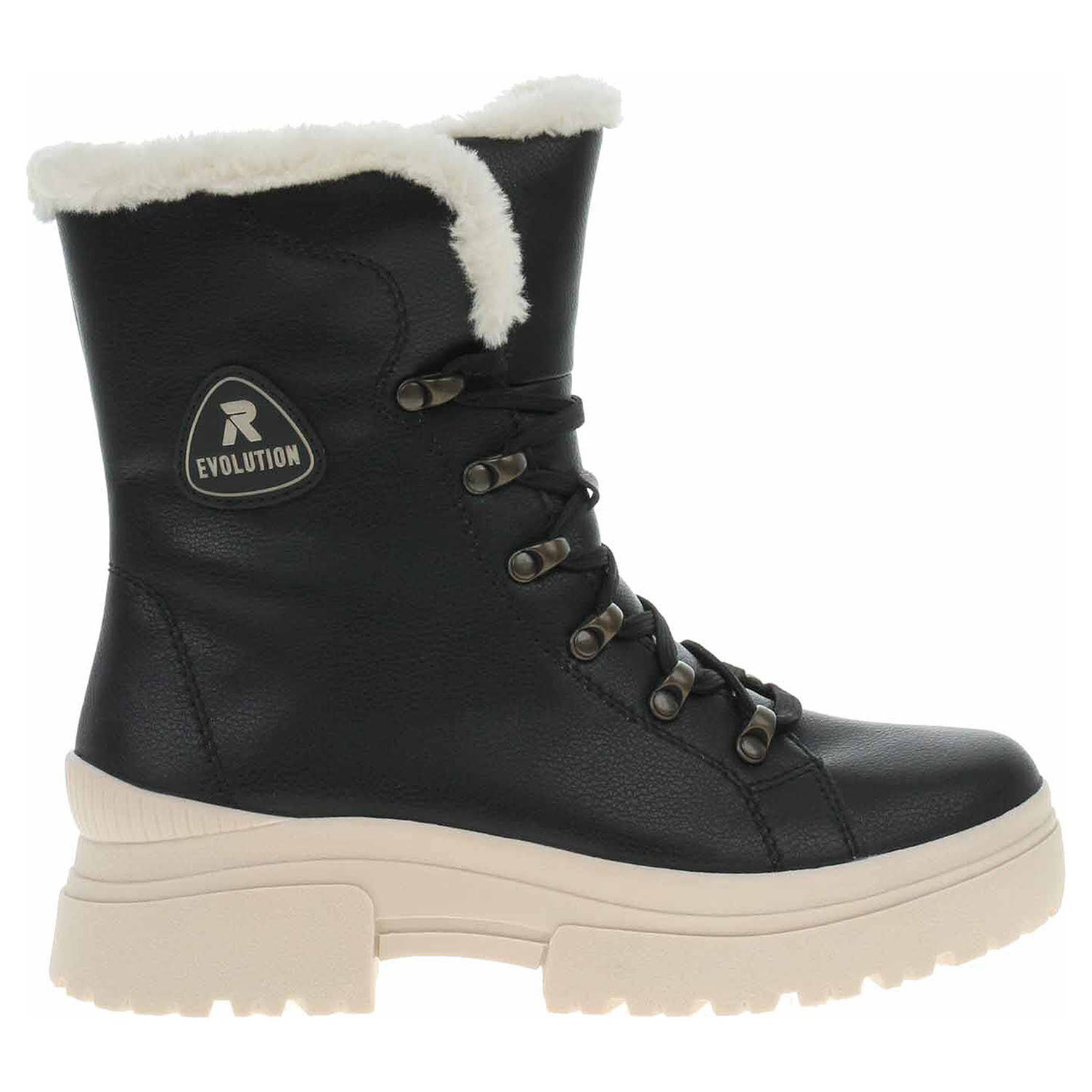 Boty Rieker - lepená dámská kotníková obuv řady R-EVOLUTION se svrškem z usně a s podšívkou kombinovanou jehněčí kožešina/střižní ovčí vlna je vybavená vyndavací stélkou Walk Warm z paměťové pěny (složení: vlněná nášlapná vrstva, termoizolační fólie a patní absorbér), kterou můžete vyjmout, vyměnit nebo vyvětrat. Pohodlné nazouvání zajišťuje zip na vnitřní straně a šněrování na nártu. Rieker REVOLUTION je nová řada moderní sportovní obuvi s obrovským důrazem na použité technologie a na komforní pohodlí i při celodenním nošení. Podešev je flexibilní a díky systému Antistress skvěle tlumí nárazy a otřesy. Podpatek je vysoký 4,- cm a platforma je vysoká 2,5 cm. Lepená obuv - pevnost lepeného spoje může být negativně ovlivněna promáčením nebo propocením, event. opakovaným používáním nedostatečně vysušené obuvi. Při neopatrné chůzi může dojít k mechanickému uvolnění lepeného spoje - ukopnutí.