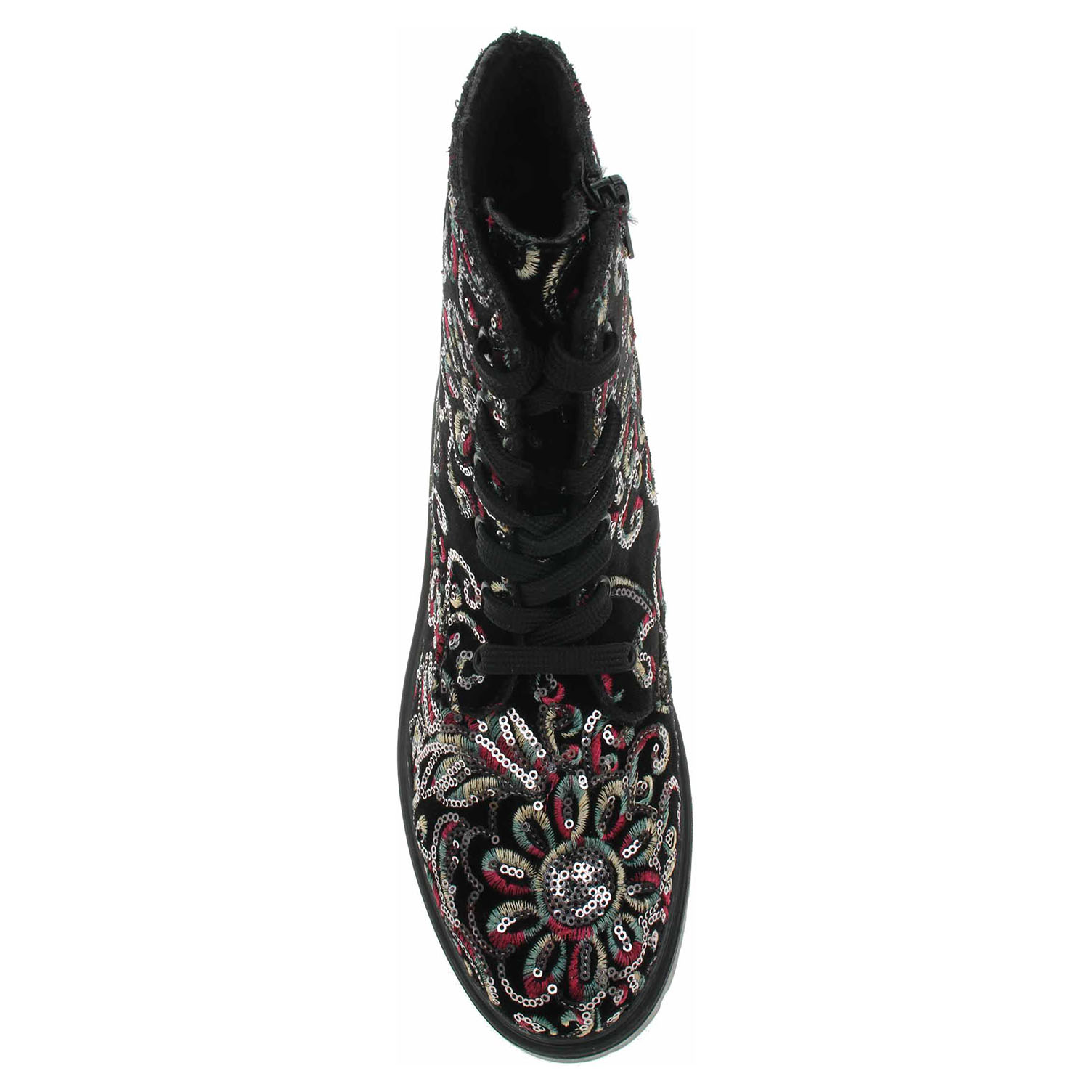 Boty Rieker - módní dámská kotníková obuv s vyšívaným, textilním svrškem je vybavená vyndavací stélkou s textilní nášlapnou vrstvou. Pohodlné nazouvání zajišťuje šněrování a zip na vnitřní straně. Podpatek je vysoký 3,7 cm. Podešev je flexibilní a díky systému Antistress skvěle tlumí nárazy a otřesy. Módní obuv - je určena pro krátkodobé nošení v nenáročných podmínkách. Prvořadá je módnost nikoliv životnost. Obuv není vhodná pro každodenní používání.