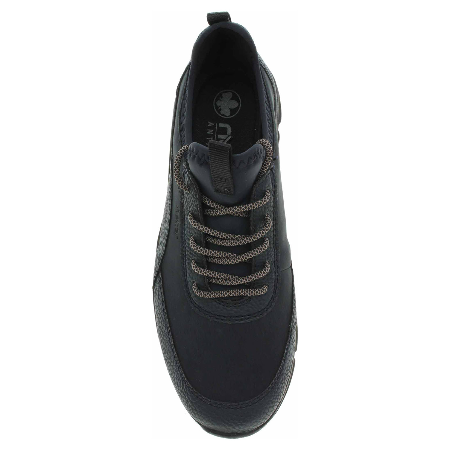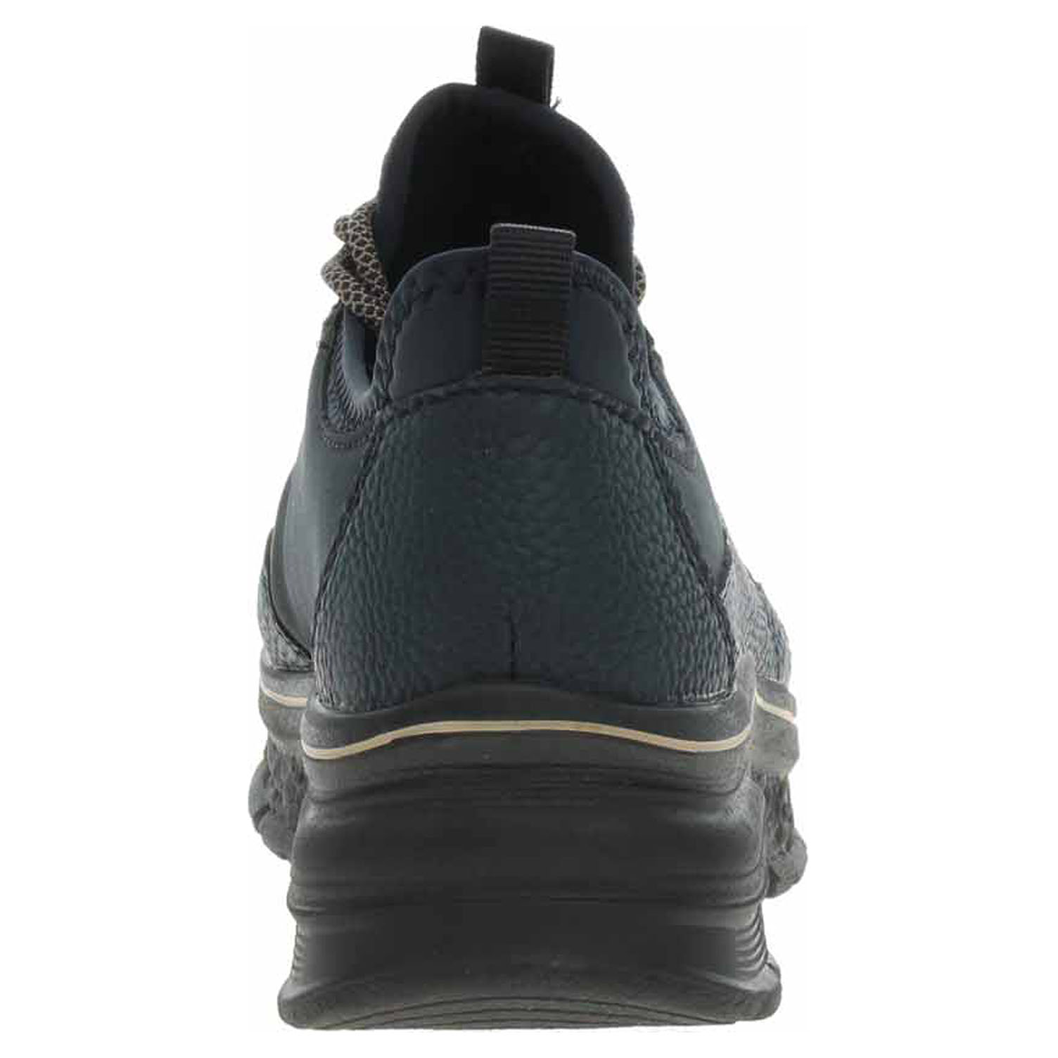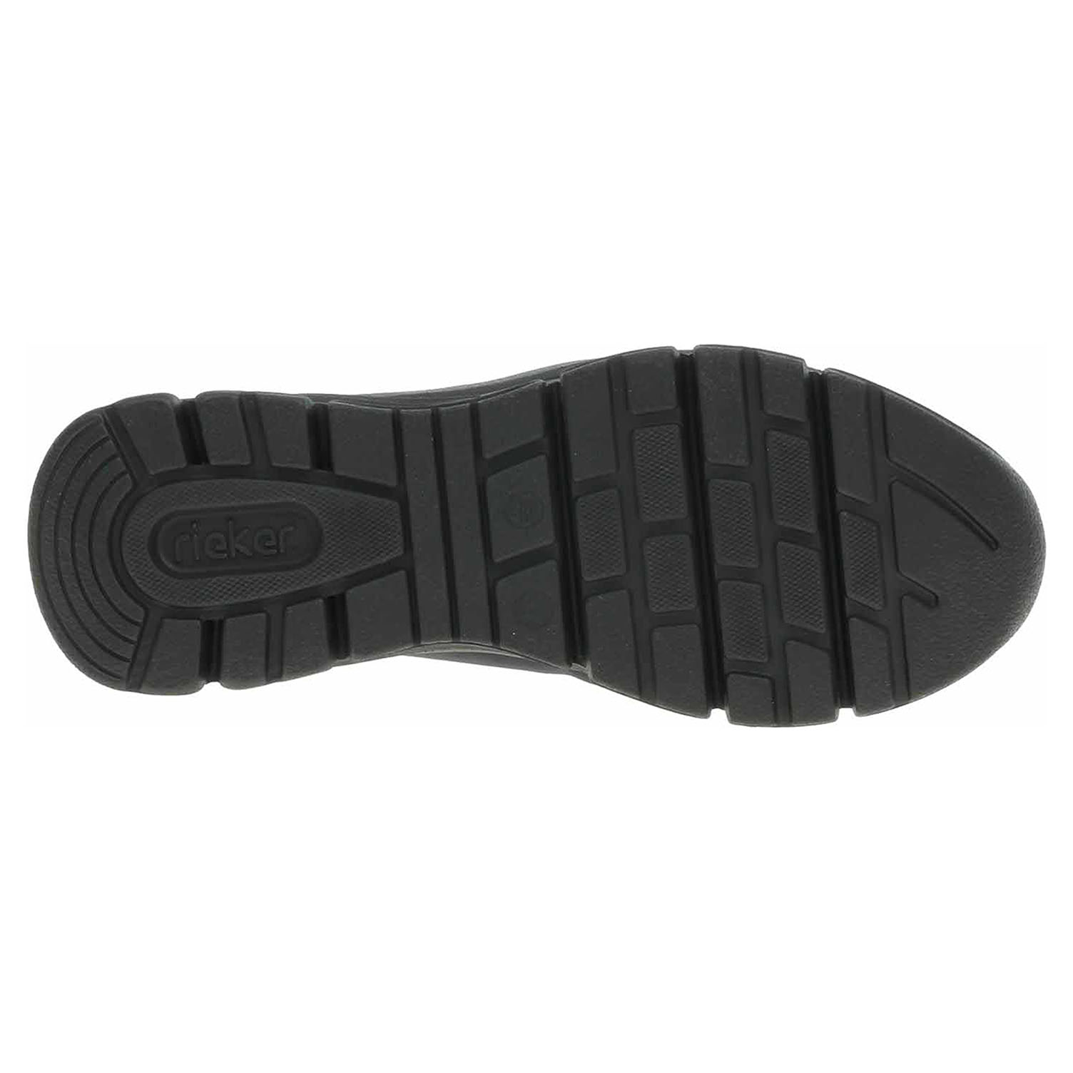 Boty Rieker - lepená dámská vycházková obuv se svrškem kombinovaným syntetika/textil a s textilní podšívkou je vybavená ultralehkou podešví Rieker-Lite a paměťovou stélkou MemoSoft, která maximálně změkčuje došlap a zvyšuje pohodlí v obuvi. Pohodlné nazouvání zajišťuje textilní ponožkový nástup do obuvi. Klínek je vysoký 4,- cm a platrforma je vysoká 2,5 cm. Lepená obuv - pevnost lepeného spoje může být negativně ovlivněna promáčením nebo propocením, event. opakovaným používáním nedostatečně vysušené obuvi. Při neopatrné chůzi může dojít k mechanickému uvolnění lepeného spoje - ukopnutí.