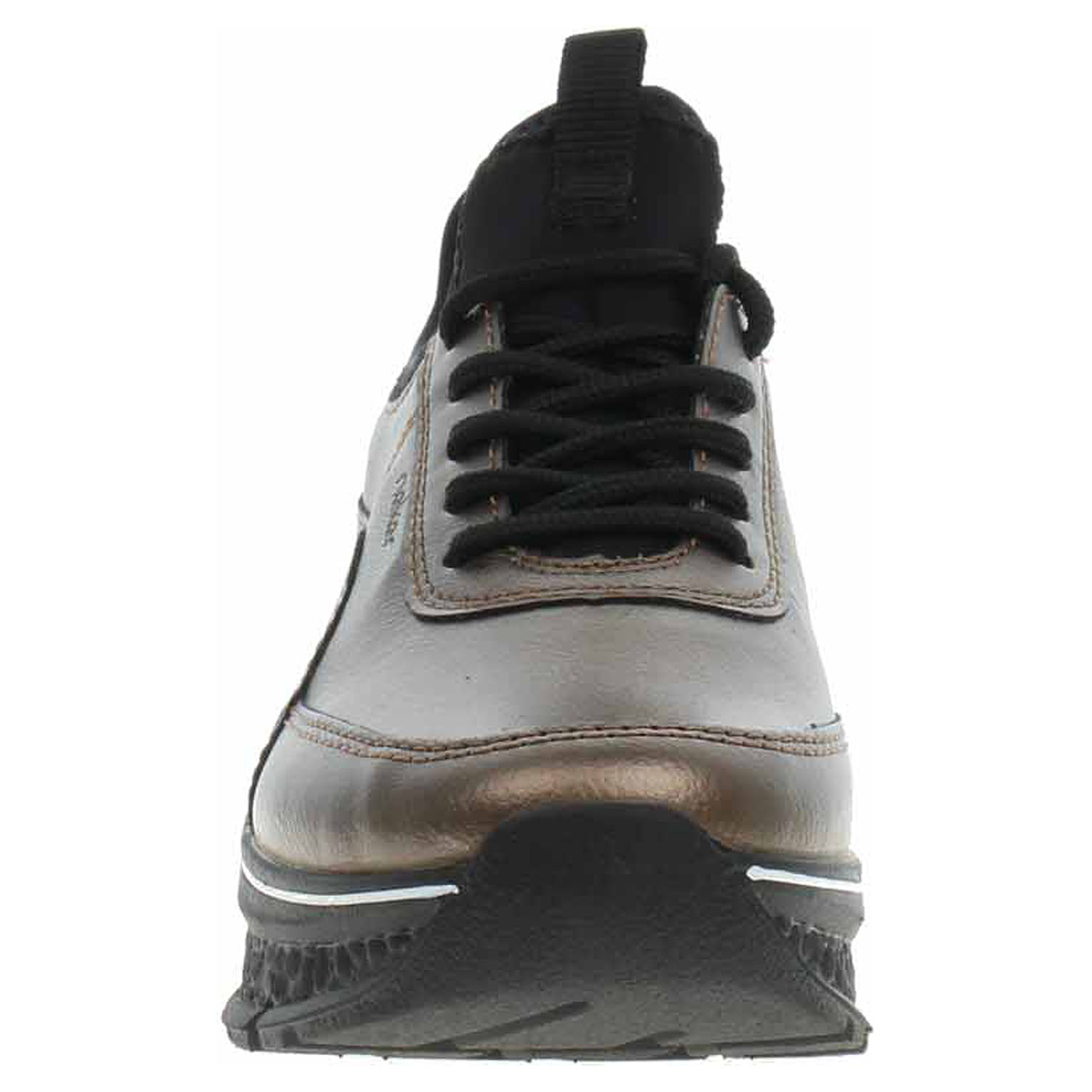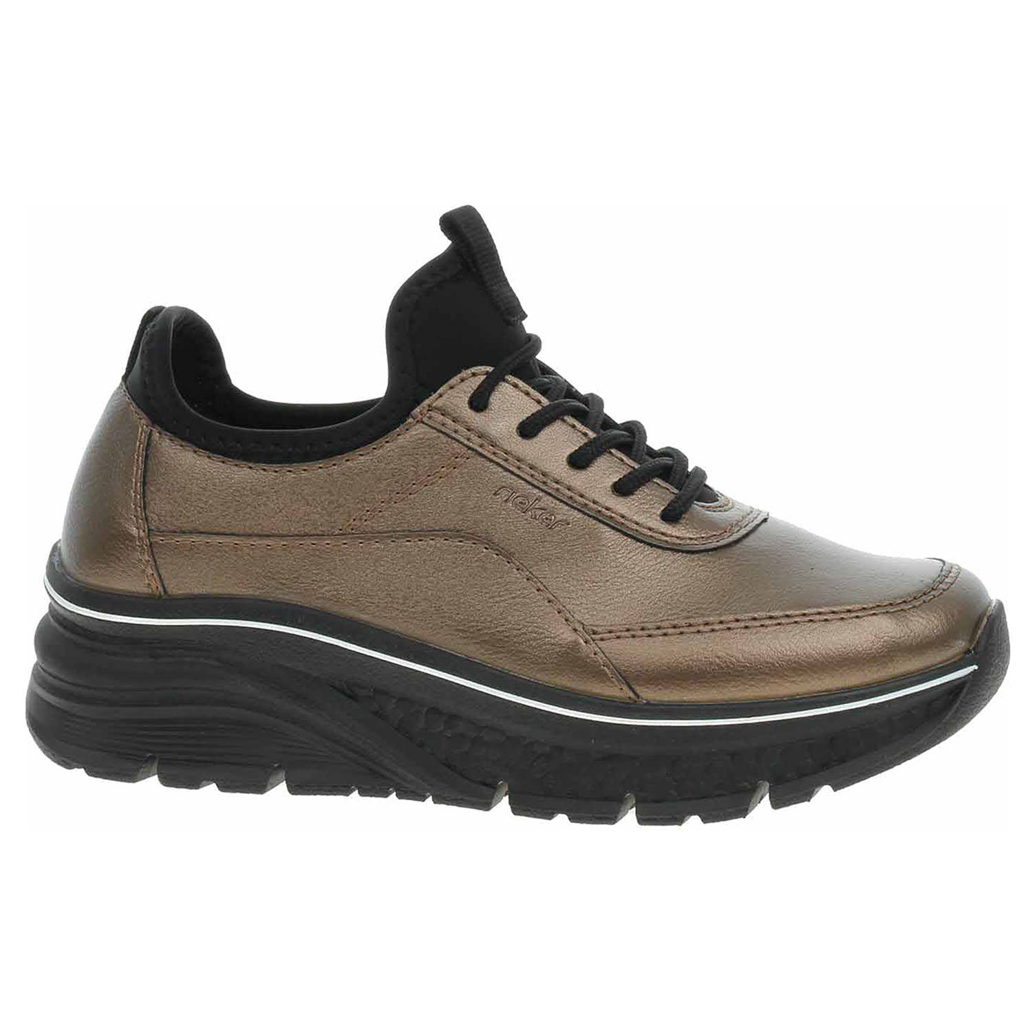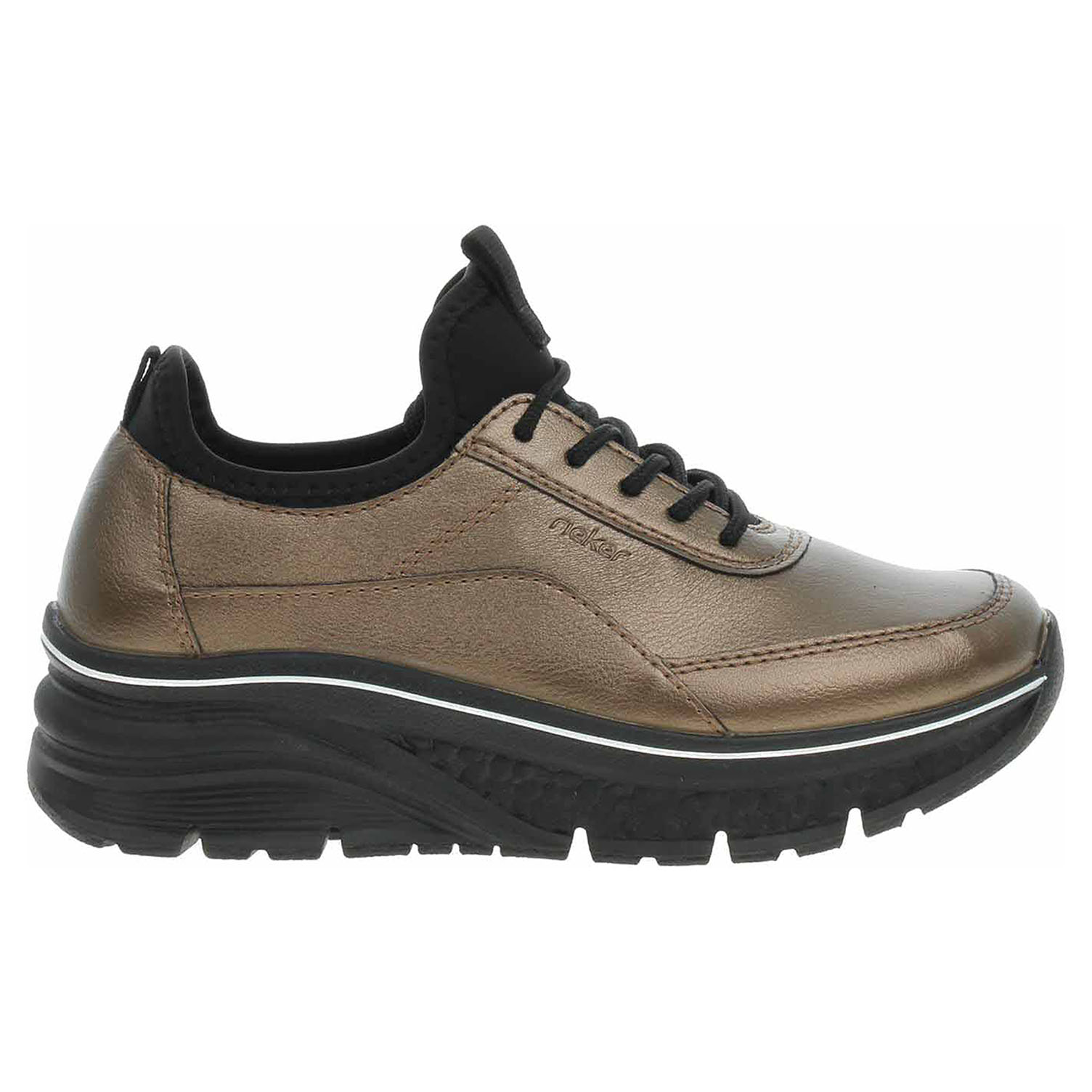 Boty Rieker - lepená dámská vycházková obuv se svrškem v bronzové barvě kombinovaným syntetika/textil a s textilní podšívkou je vybavená ultralehkou podešví Rieker-Lite a paměťovou stélkou MemoSoft, která maximálně změkčuje došlap a zvyšuje pohodlí v obuvi. Pohodlné nazouvání zajišťuje textilní ponožkový nástup do obuvi. Klínek je vysoký 4,- cm a platrforma je vysoká 2,5 cm. Lepená obuv - pevnost lepeného spoje může být negativně ovlivněna promáčením nebo propocením, event. opakovaným používáním nedostatečně vysušené obuvi. Při neopatrné chůzi může dojít k mechanickému uvolnění lepeného spoje - ukopnutí.