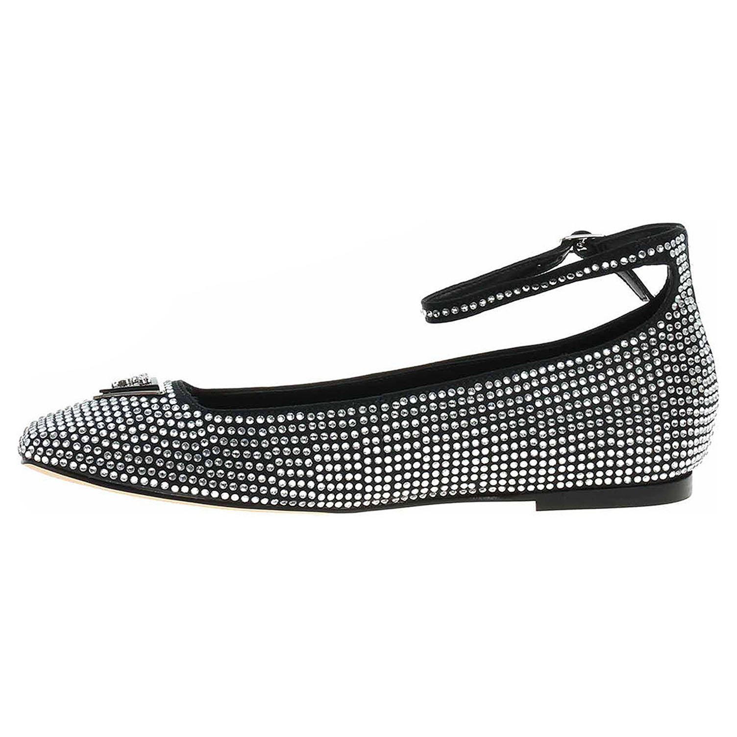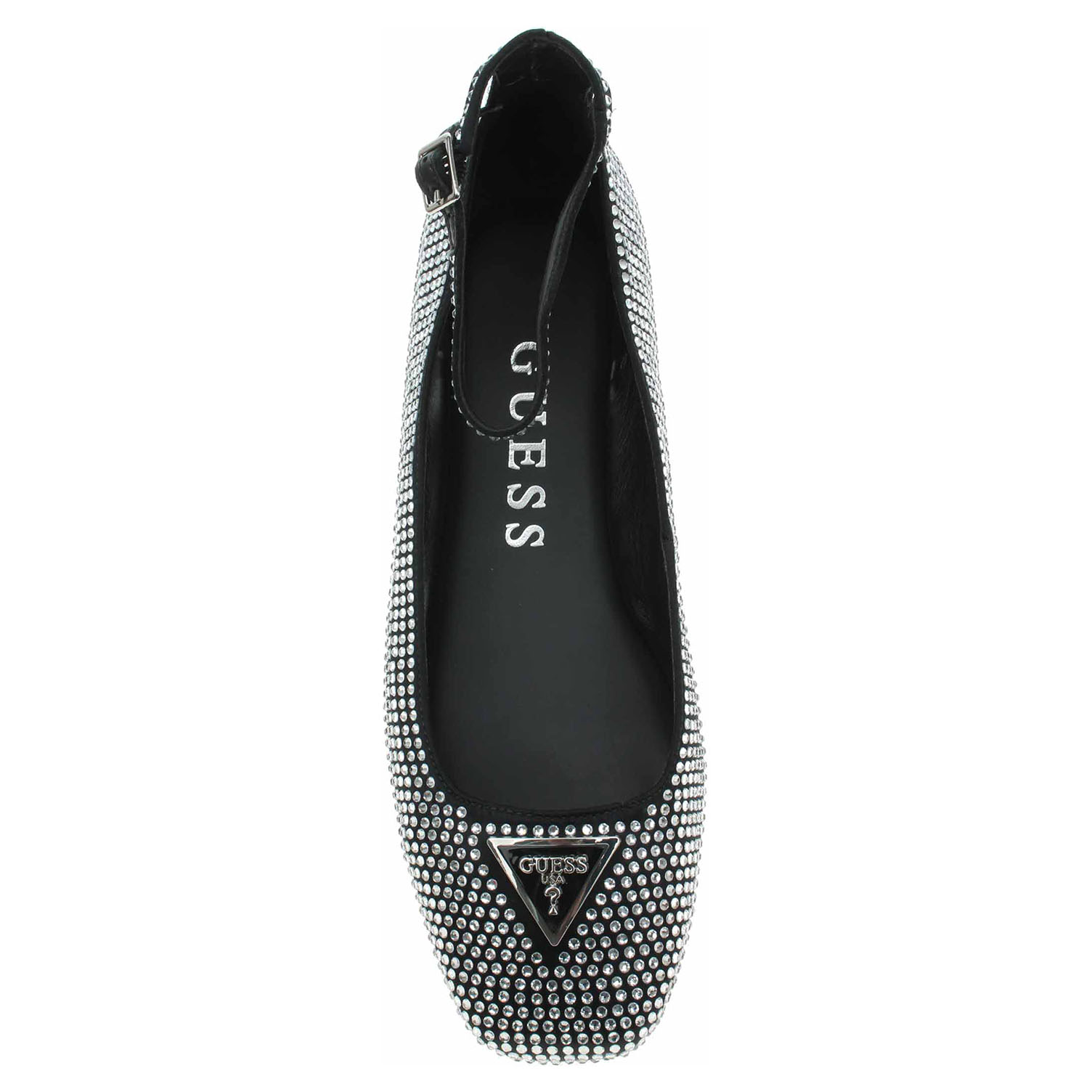 Boty Guess - společenské dámské baleriny s páskem kolem kotníku, který se zapíná na přezku, mají textilní svršek ozdobený logem v trojúhelníku a pokrytý kamínky, podšívku ze syntetiky a stélku z usně. Podpatek je vysoký 1,- cm. Společenská obuv - vhodná ke krátkodobému nošení v interiérech. Obuv nevystavujte vlhkosti.