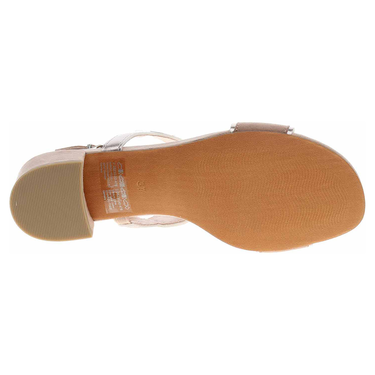 Boty Marco Tozzi - společenské dámské sandály se svrškem kombinovaným syntetika/textil a s textilní podšívkou jsou vybavené stélkou Feel me s nášlapnou vrstvou kombinovanou syntetika/textil, která se přizpůsobuje vašemu chodidlu a zajišťuje optimální komfort při chůzi. Pásek přes patu se zapíná na přezku. Podpatek je vysoký 4,5 cm. Obuv je 100% VEGAN = při výrobě obuvi nebyly použity žádné materiály ze zvířat. Společenská obuv - vhodná ke krátkodobému nošení v interiérech. Obuv nevystavujte vlhkosti.