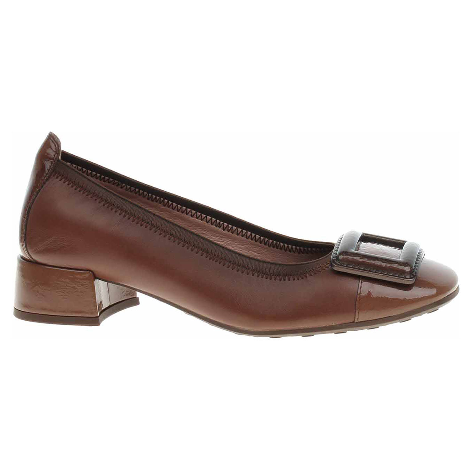 Boty Hispanitas - lakované dámské lodičky s ozdobnou, lakovanou sponou na špičce mají svršek, podšívku i stélku z usně. Obšitý nástup do obuvi dobře drží tvar a přiléhá k noze. Technologie Triflow: trojité polstrování v oblasti běhounu, které absorbuje nárazy a poskytuje tlumený efekt při chůzi. Podešev z termoplastického polyuretanu má podpatek potažený lakovanou usní, který je vysoký 2,5 cm. Lakovaná obuv - hladký, lesklý povrch je docílen lakovou úpravou. Povrch je choulostivý na mechanické poškození, rozmáčení a mráz. Ošetřujte prostředky na lakové usně.