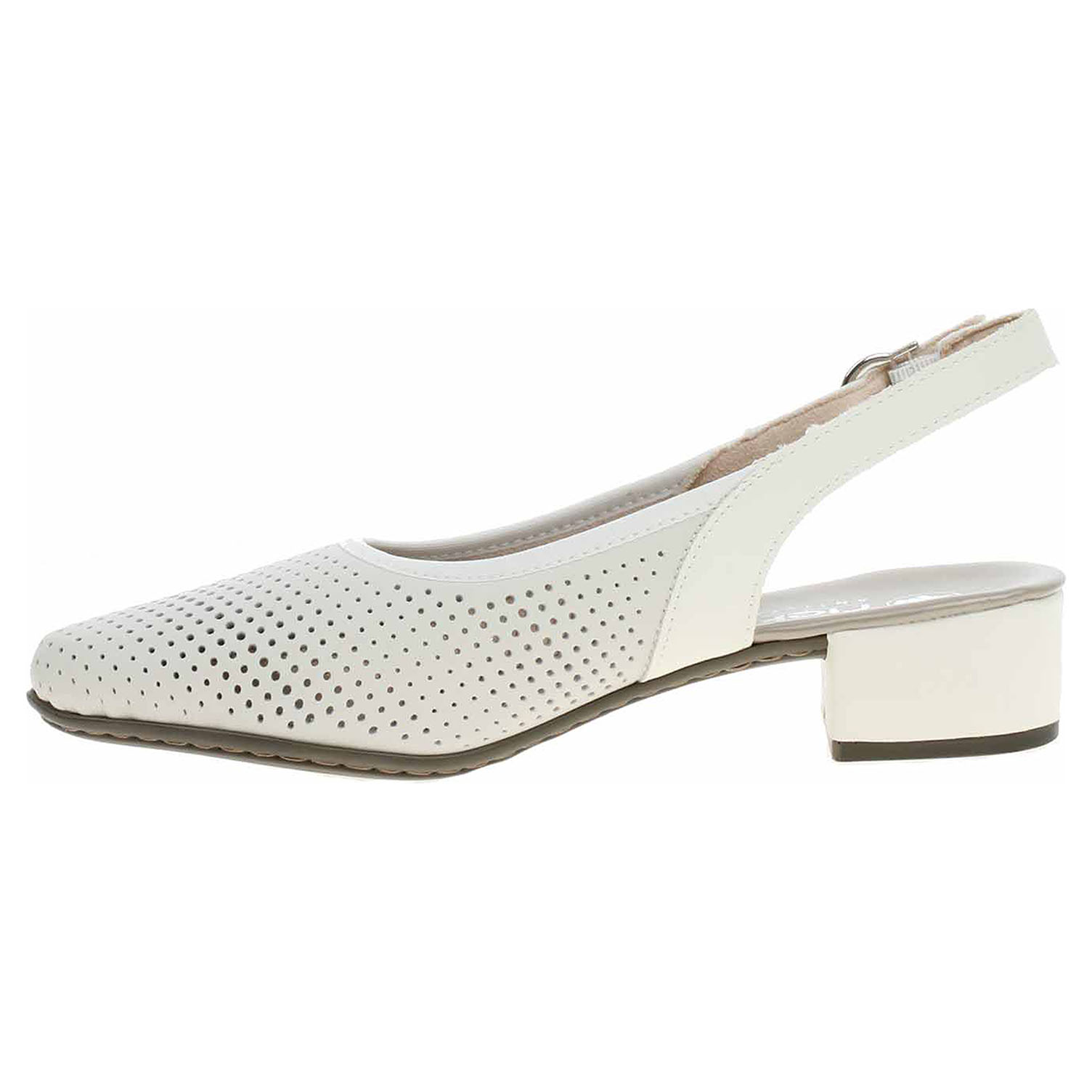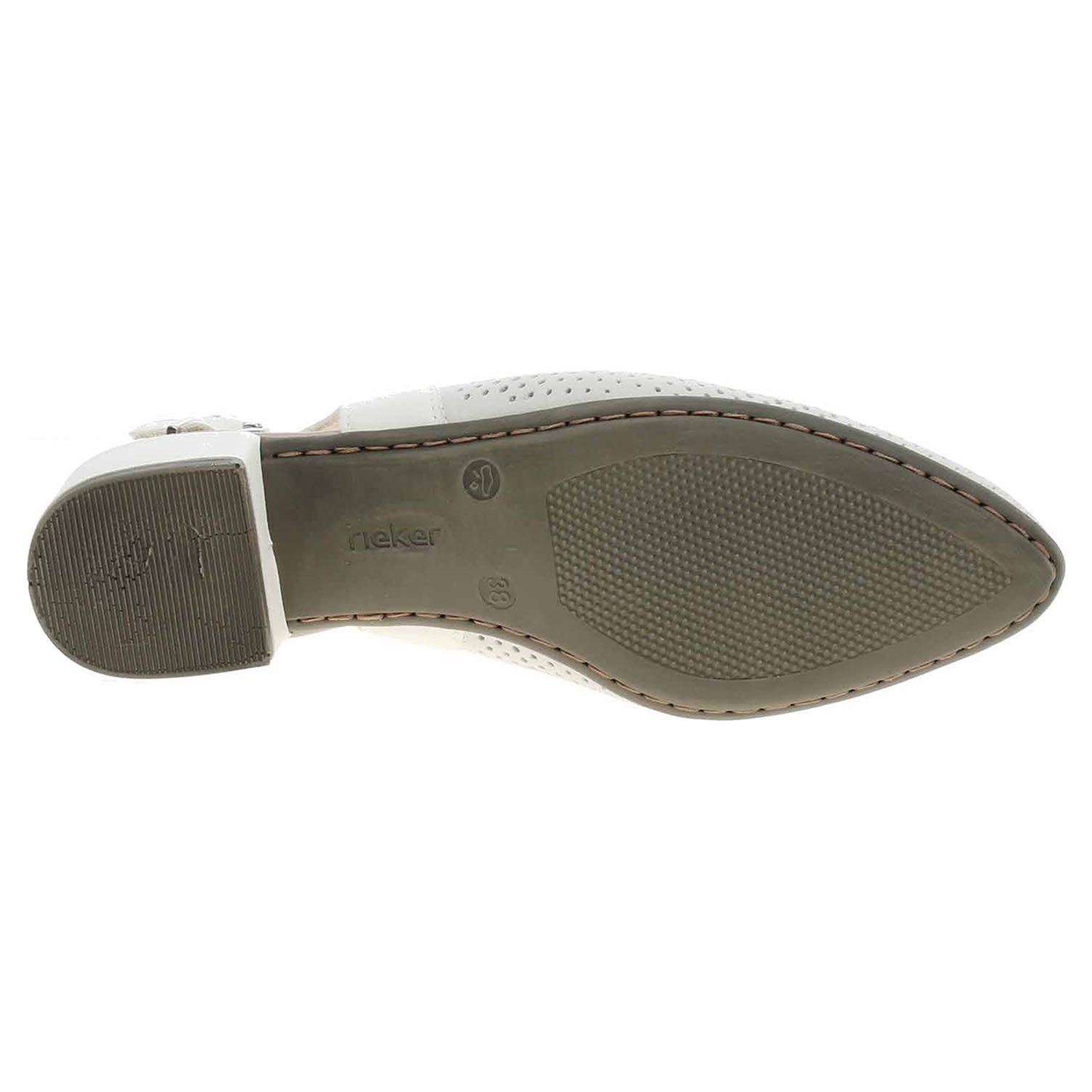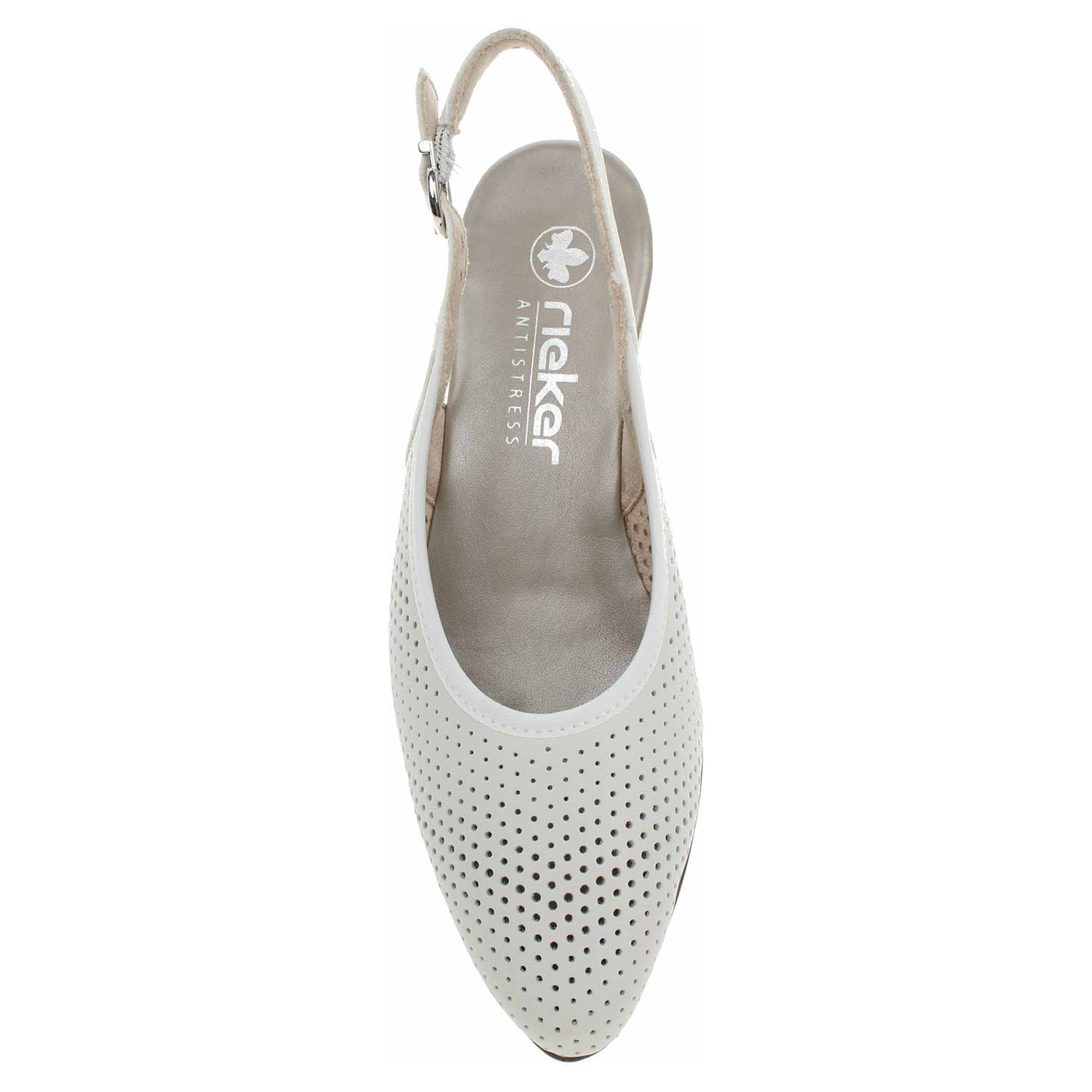 Boty Rieker - flexiblové dámské lodičky ve smetanové barvě (nejsou čistě bílé) s povrstveným svrškem kombinovaným useň/syntetika, s textilní podšívkou a s vyměkčenou stélkou s nášlapnou vrstvou ze syntetiky mají podpatek vysoký 3,5 cm. Pásek přes patu se zapíná na přezku. Podešev je flexibilní a díky systému Antistress skvěle tlumí nárazy a otřesy. Flexiblová obuv - prošívaná podešev, obuv používejte v suchém prostředí. Při zvýšené vlhkosti může dojít k promáčení obuvi. Obuv pravidelně impregnujte nebo krémujte, zvláště pak prošívaný okraj.