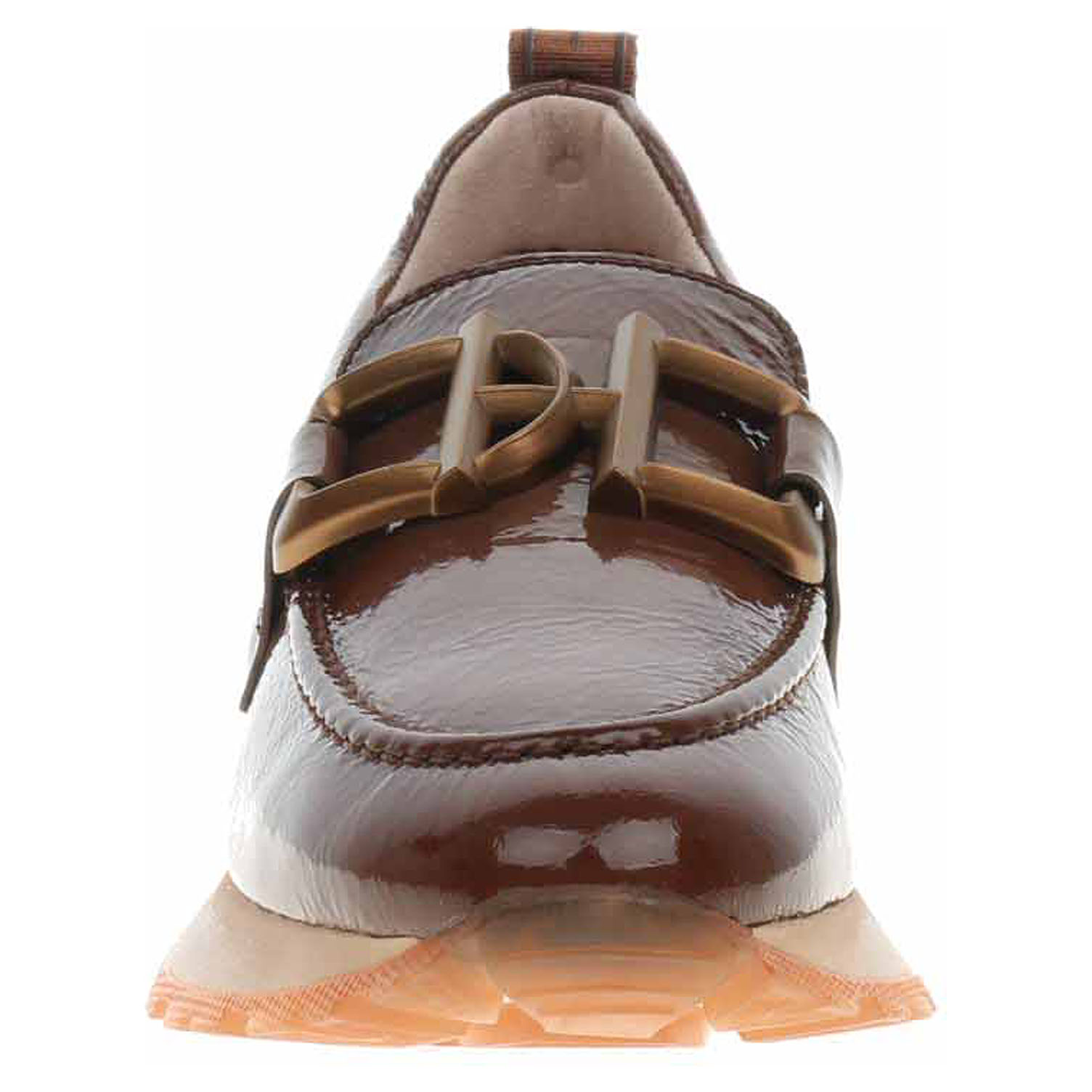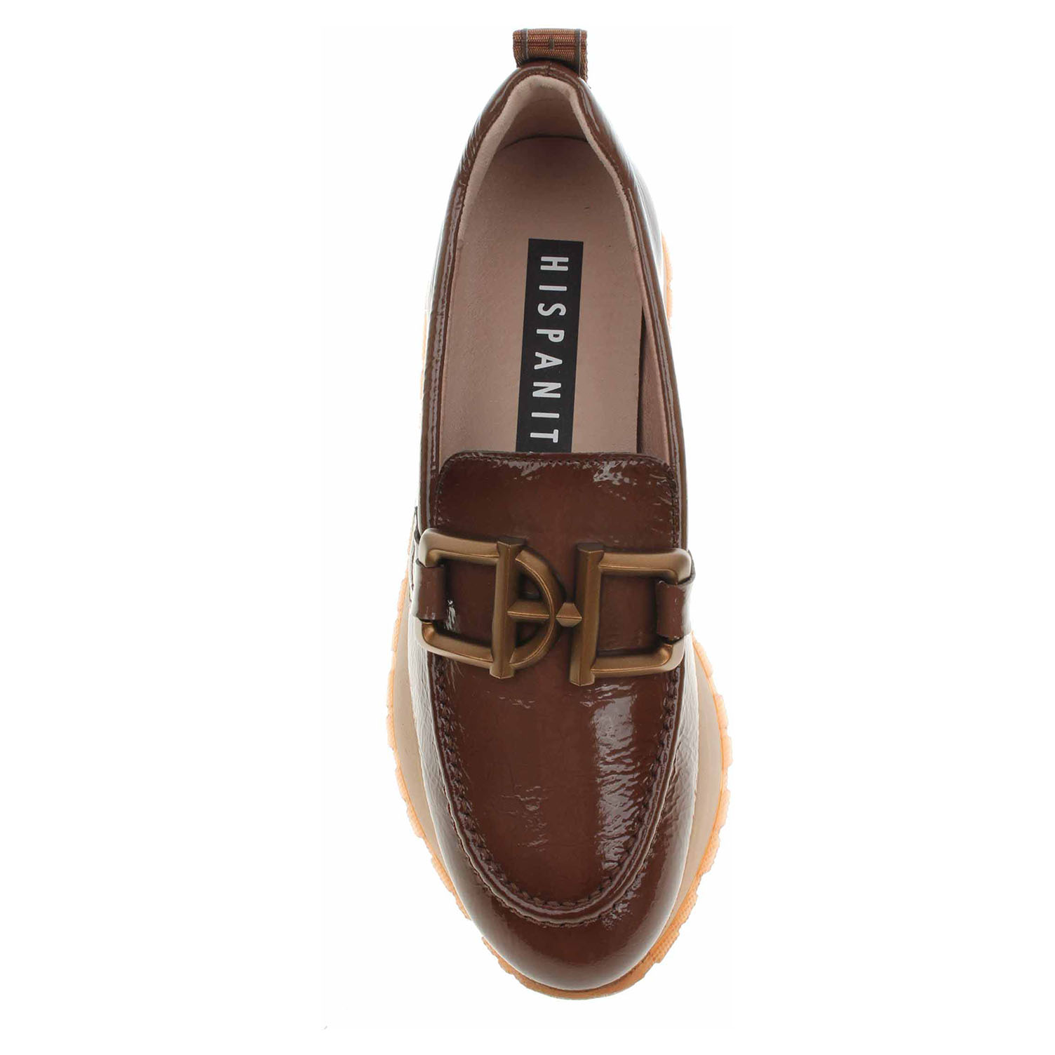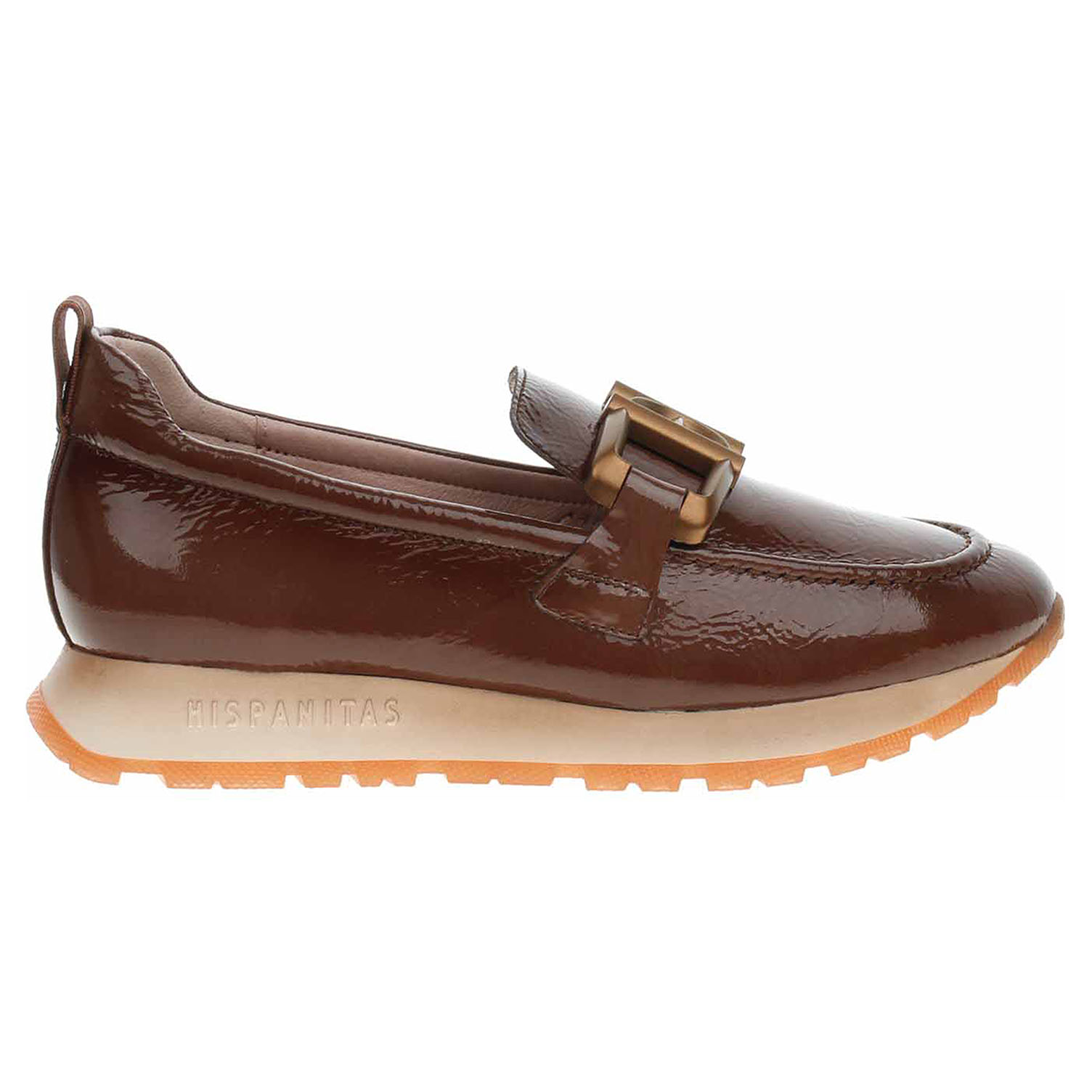 Boty Hispanitas - lakované dámské mokasiny s ozdobnou sponou na nártu mají svršek i podšívku z usně a jsou vybavené vyndavací stélkou s nášlapnou vrstvou z usně. Technologie Triflow: trojité polstrování v oblasti běhounu, které absorbuje nárazy a poskytuje tlumený efekt při chůzi. Podešev z termoplastického polyuretanu poskytuje vynikající odpružení a protiskluzovou přilnavost. Klínek je vysoký 3,- cm. používání. Lakovaná obuv - hladký, lesklý povrch je docílen lakovou úpravou. Povrch je choulostivý na mechanické poškození, rozmáčení a mráz. Ošetřujte prostředky na lakové usně.