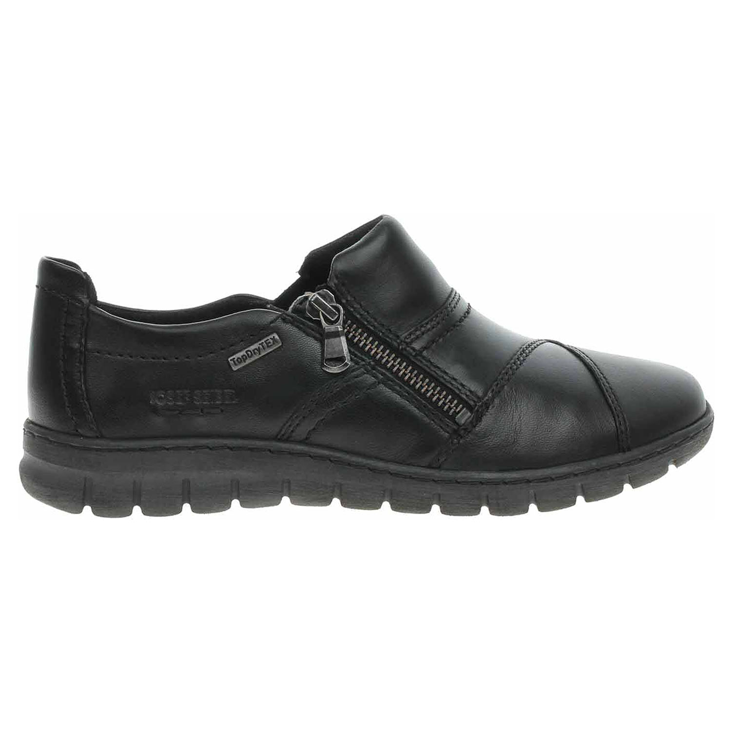 Boty Josef Seibel - dámské mokasiny se svrškem z usně a s textilní podšívkou jsou vybavené vodoodpudivou membránou TopDryTex a vyndavací stélkou s nášlapnou vrstvou z usně. Pohodlné nazouvání zajišťuje zip na vnější straně nártu a vsazená gummička na straně vnitřní. Vyměnitelné vložky do bot je možné vyndat za účelem provětrání a omytí. Značnou výhodu nabízejí vyměnitelné vložky do bot také těm uživatelům, kteří používají ortopedické vkládací stélky. Klínek je vysoký 4,- cm.