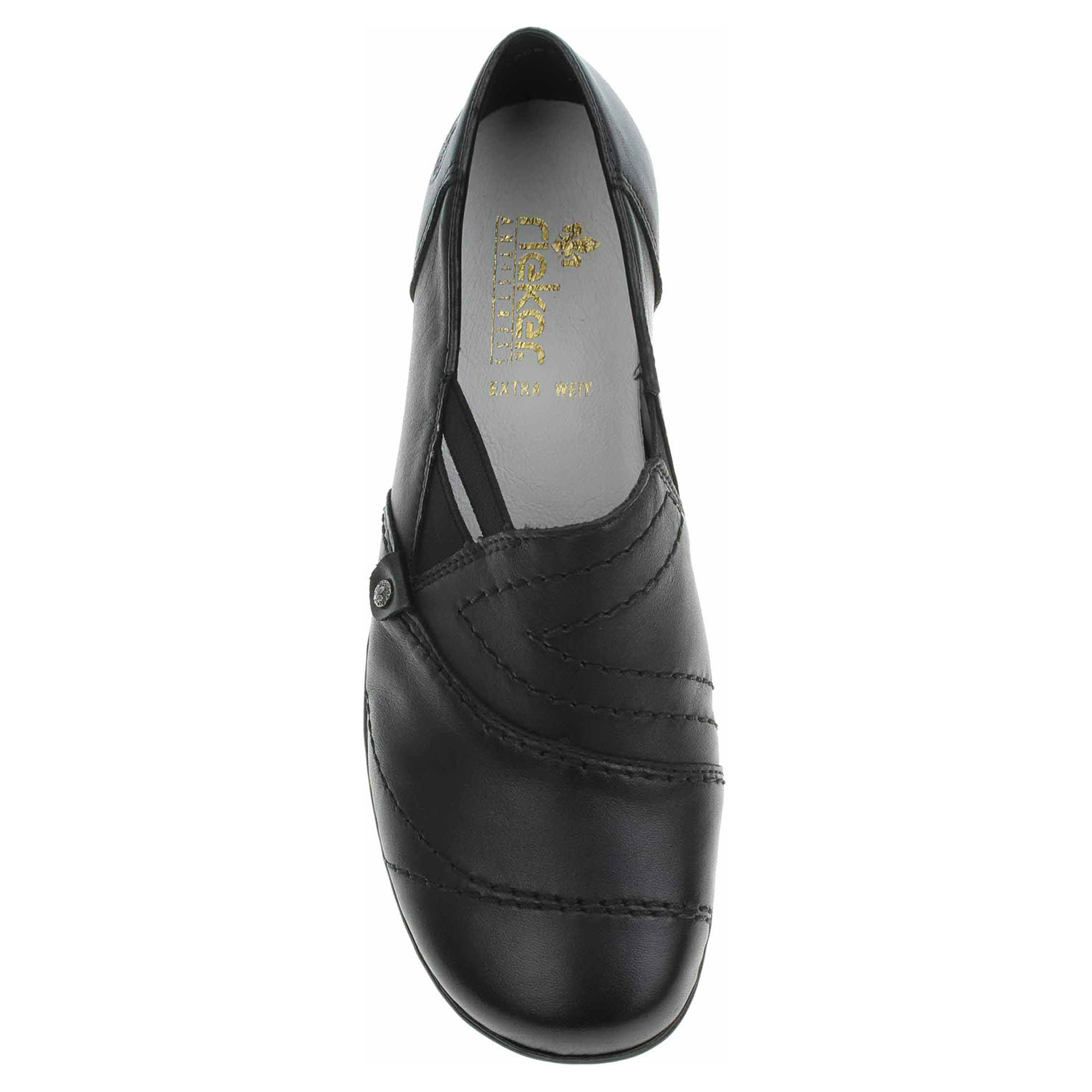 Boty Rieker - flexiblové dámské mokasiny nadměrné šíře se svrškem a stélkou z usně jsou vybavené na vnější i na vnitřní straně nártu vsazenými gumičkami, které umožňují pohodlné nazouvání. Podpatek je vysoký 3,5 cm. Podešev je flexibilní a díky systému Antistress skvěle tlumí nárazy a otřesy. Flexiblová obuv - prošívaná podešev, obuv používejte v suchém prostředí. Při zvýšené vlhkosti může dojít k promáčení obuvi. Obuv pravidelně impregnujte nebo krémujte, zvláště pak prošívaný okraj.