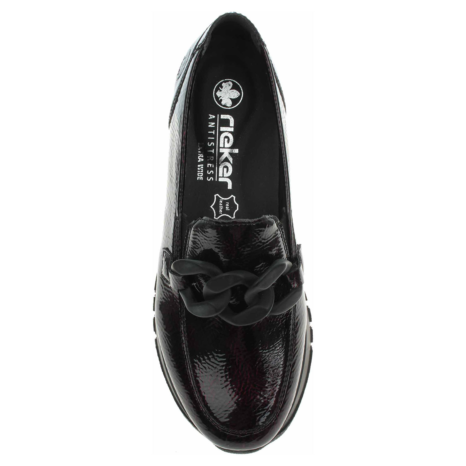 Boty Rieker - lakované dámské mokasiny nadměrné šíře H se svrškem ze syntetiky a s textilní podšívkou jsou vybavené vyndavací stélkou z paměťové pěny. Vyměnitelné vložky do bot je možné vyndat za účelem provětrání a omytí. Značnou výhodu nabízejí vyměnitelné vložky do bot také těm uživatelům, kteří používají ortopedické vkládací stélky. Pohodlné nazouvání zajišťují vsazené gumičky na vnější i na vnitřní straně nártu. Klínek je vysoký 3,- cm. Podešev je flexibilní a díky systému Antistress skvěle tlumí nárazy a otřesy. Lakovaná obuv - hladký, lesklý povrch je docílen lakovou úpravou. Povrch je choulostivý na mechanické poškození, rozmáčení a mráz. Ošetřujte prostředky na lakové usně.