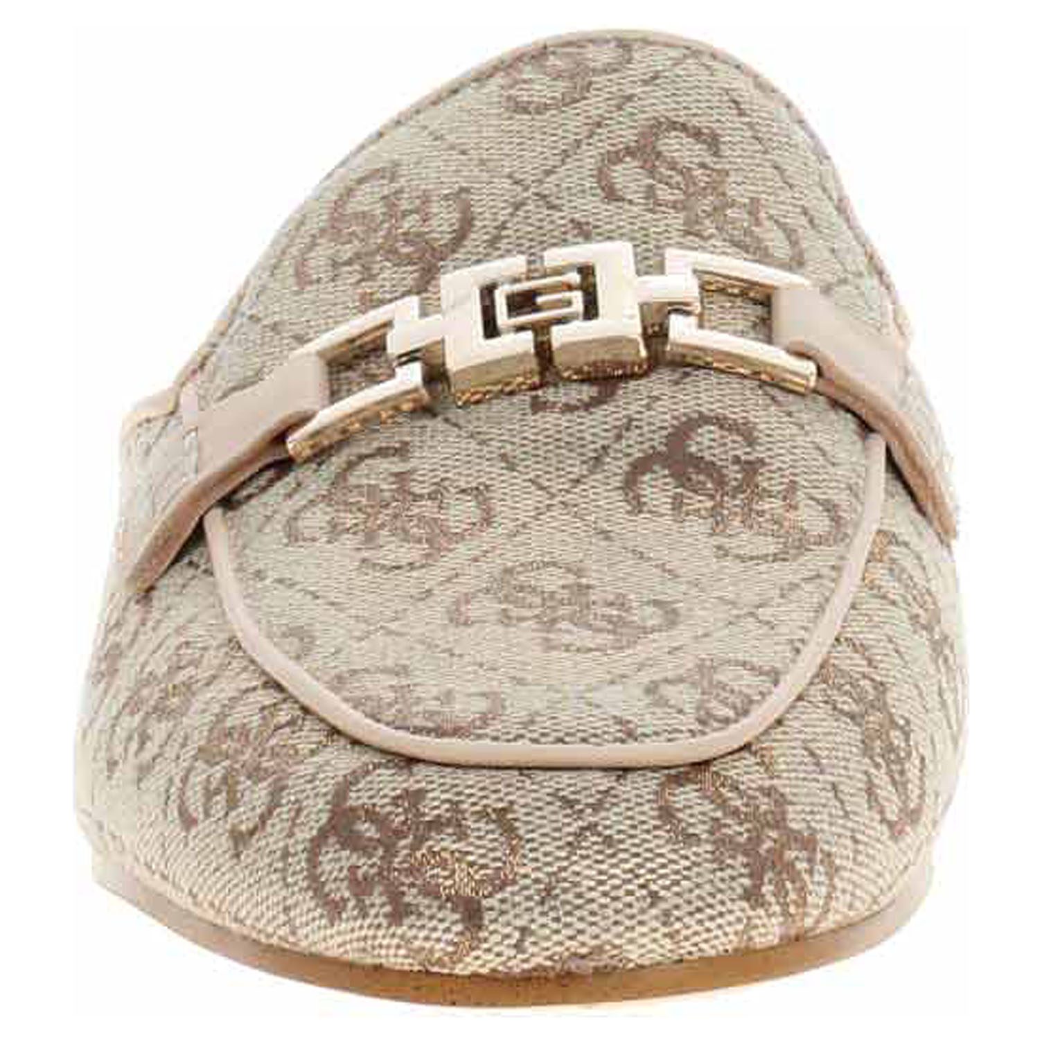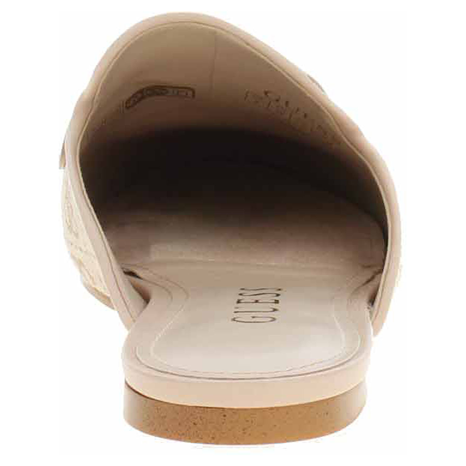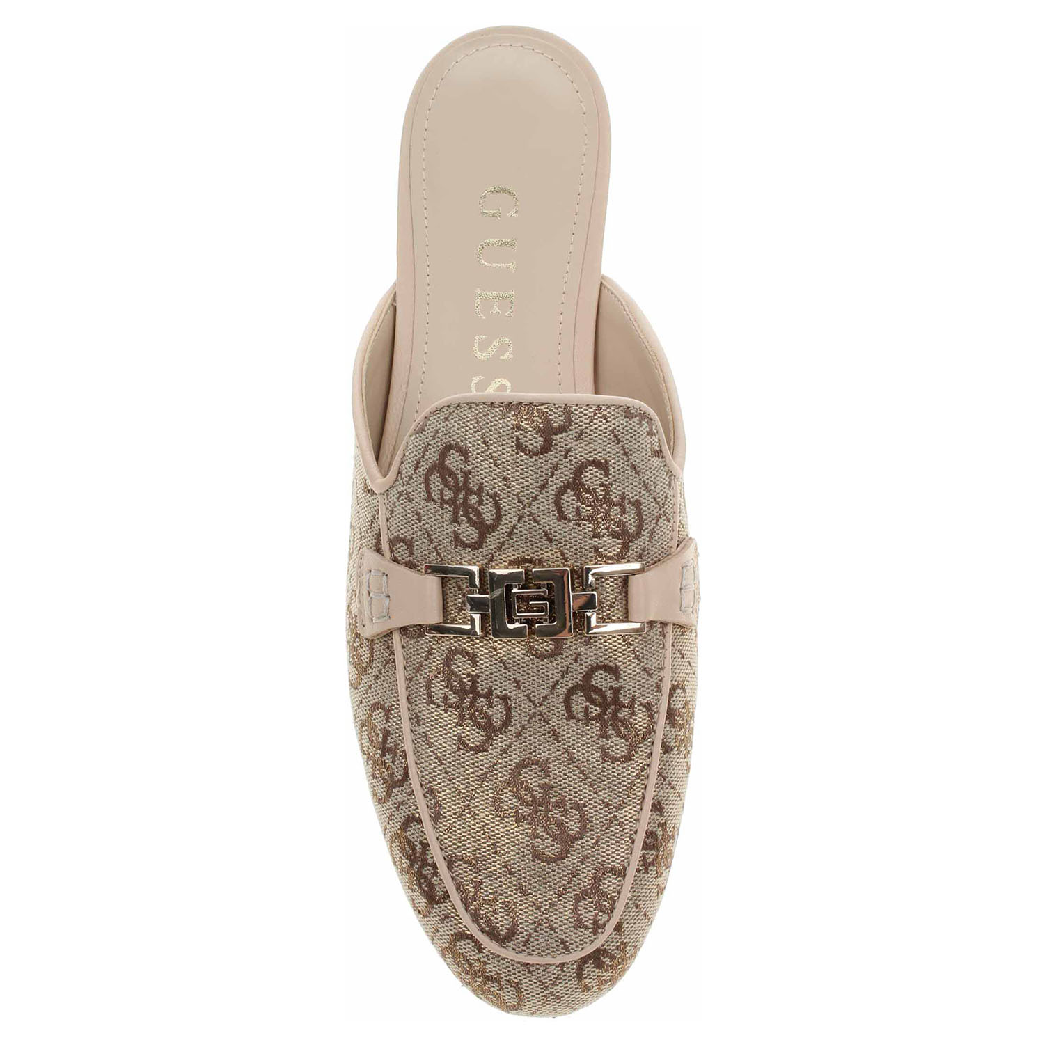 Guess - módní dámské pantofle s plnou špičkou mají svršek kombinovaný textil/useň (95 % polyester / 5 % pravá kůže), podšívku ze syntetiky a stélku kombinovanou syntetika/textil. Svršek s potiskem loga 4G je ozdobený zlatou přezkou s logem. Podpatek je vysoký 1,5 cm. Módní obuv - je určena pro krátkodobé nošení v nenáročných podmínkách. Prvořadá je módnost nikoliv životnost. Obuv není vhodná pro každodenní používání.