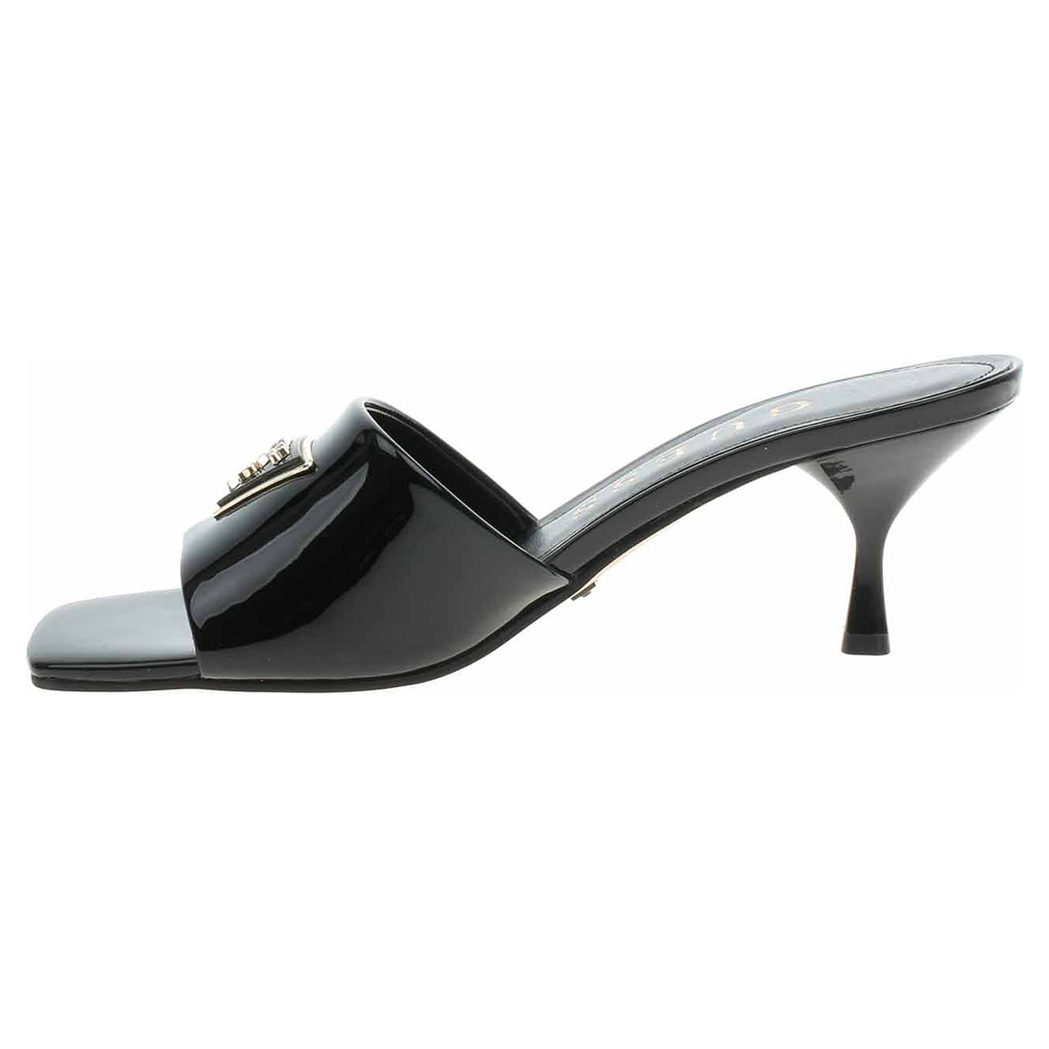 Boty Guess - módní dámské pantofle se zlatým logem v trojúhelníku na nártu mají svršek z lakované syntetiky (100% polyuretan) a podšívku i stélku ze swyntetiky. Podpatek je vysoký 5,7 cm. Módní obuv - je určena pro krátkodobé nošení v nenáročných podmínkách. Prvořadá je módnost nikoliv životnost. Obuv není vhodná pro každodenní používání.