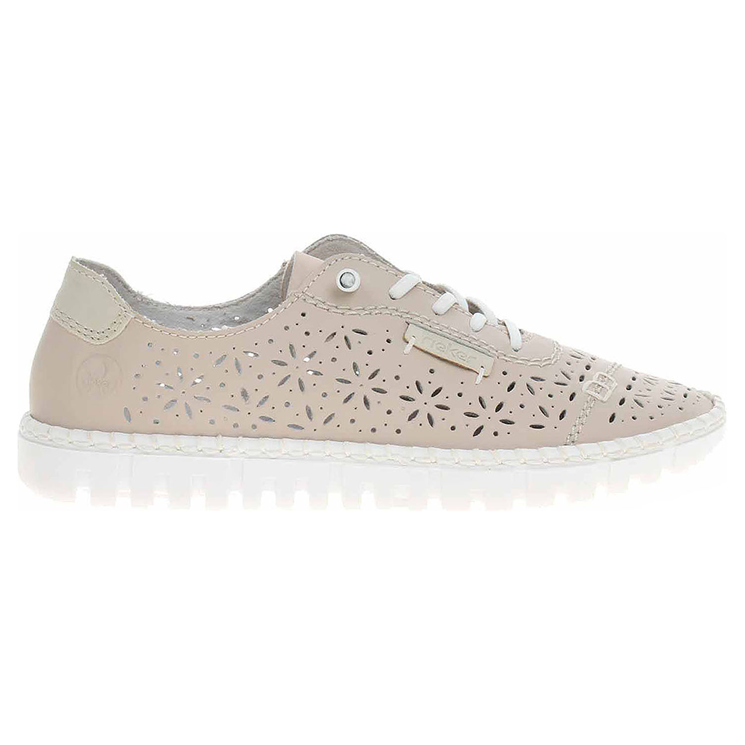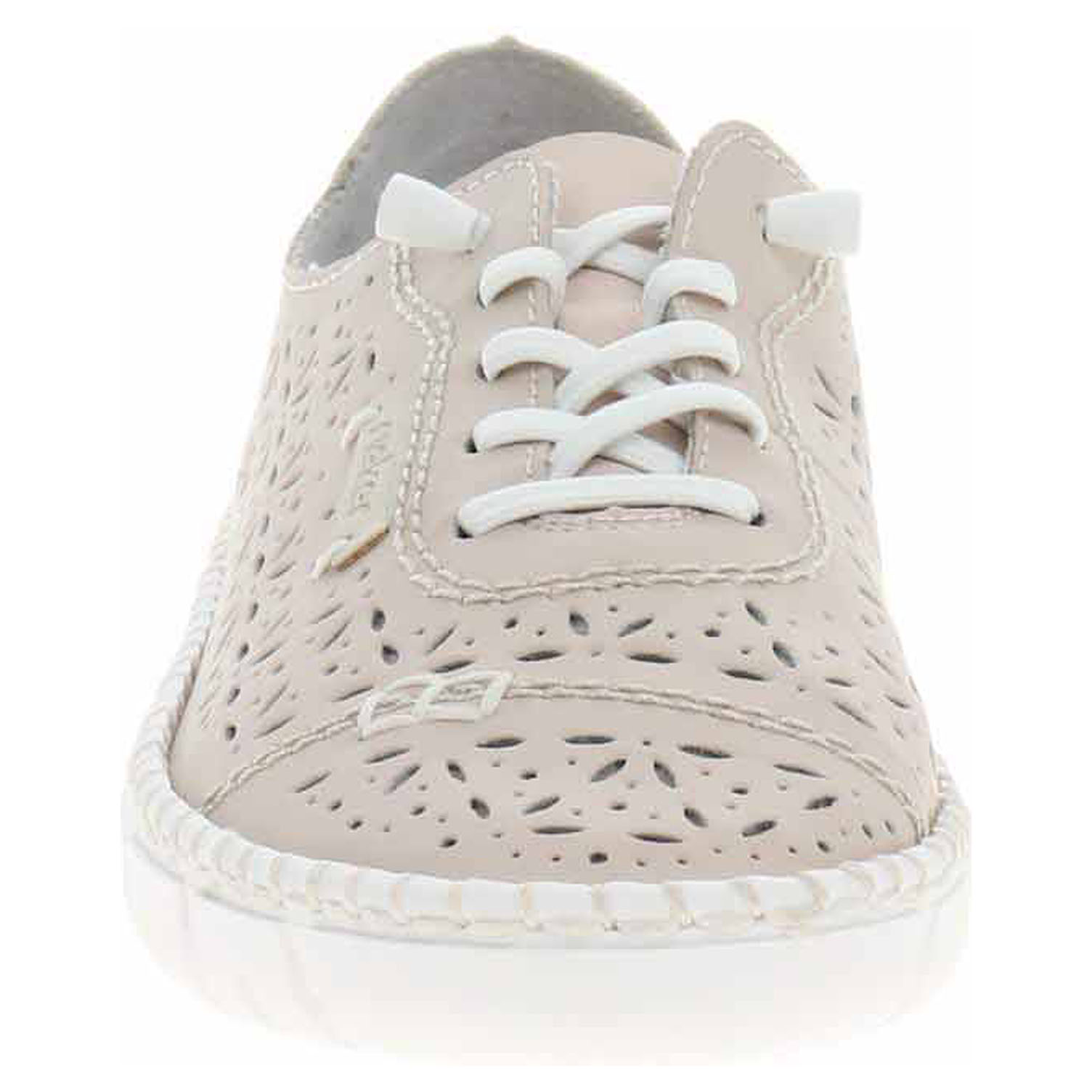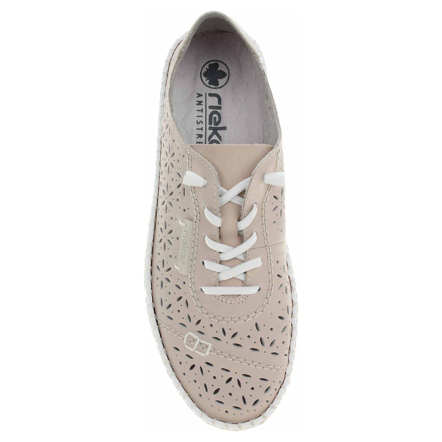 Boty Rieker - flexiblové dámské polobotky s perforovaným svrškem kombinovaným useň/syntetika, s textilní podšívkou a se stélkou z usně. Pohodlné nazouvání zajišťuje gumička provlečená šněrováním. Klínek je vysoký 2,7 cm. Podešev je flexibilní a díky systému Antistress skvěle tlumí nárazy a otřesy. Flexiblová obuv - prošívaná podešev, obuv používejte v suchém prostředí. Při zvýšené vlhkosti může dojít k promáčení obuvi. Obuv pravidelně impregnujte nebo krémujte, zvláště pak prošívaný okraj.