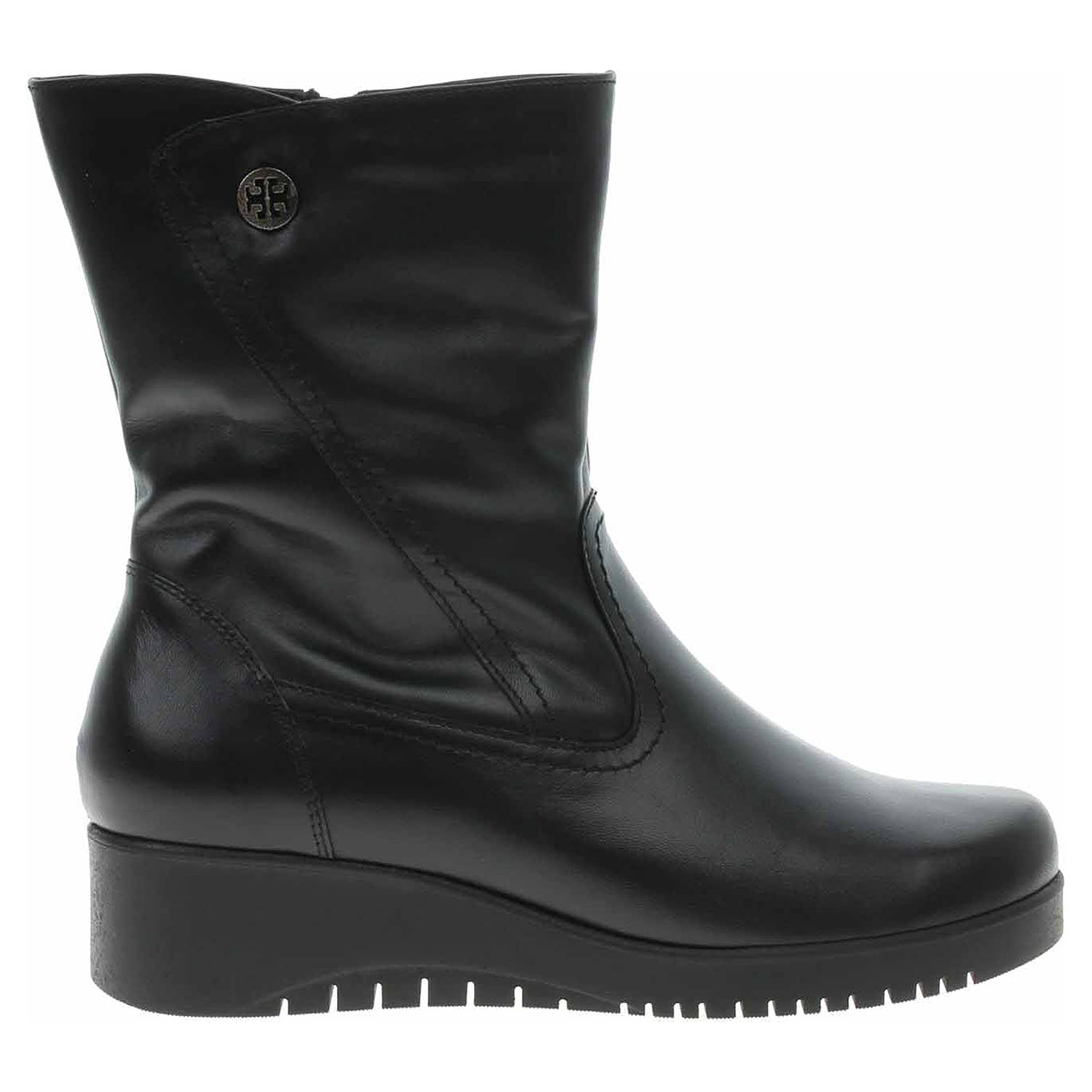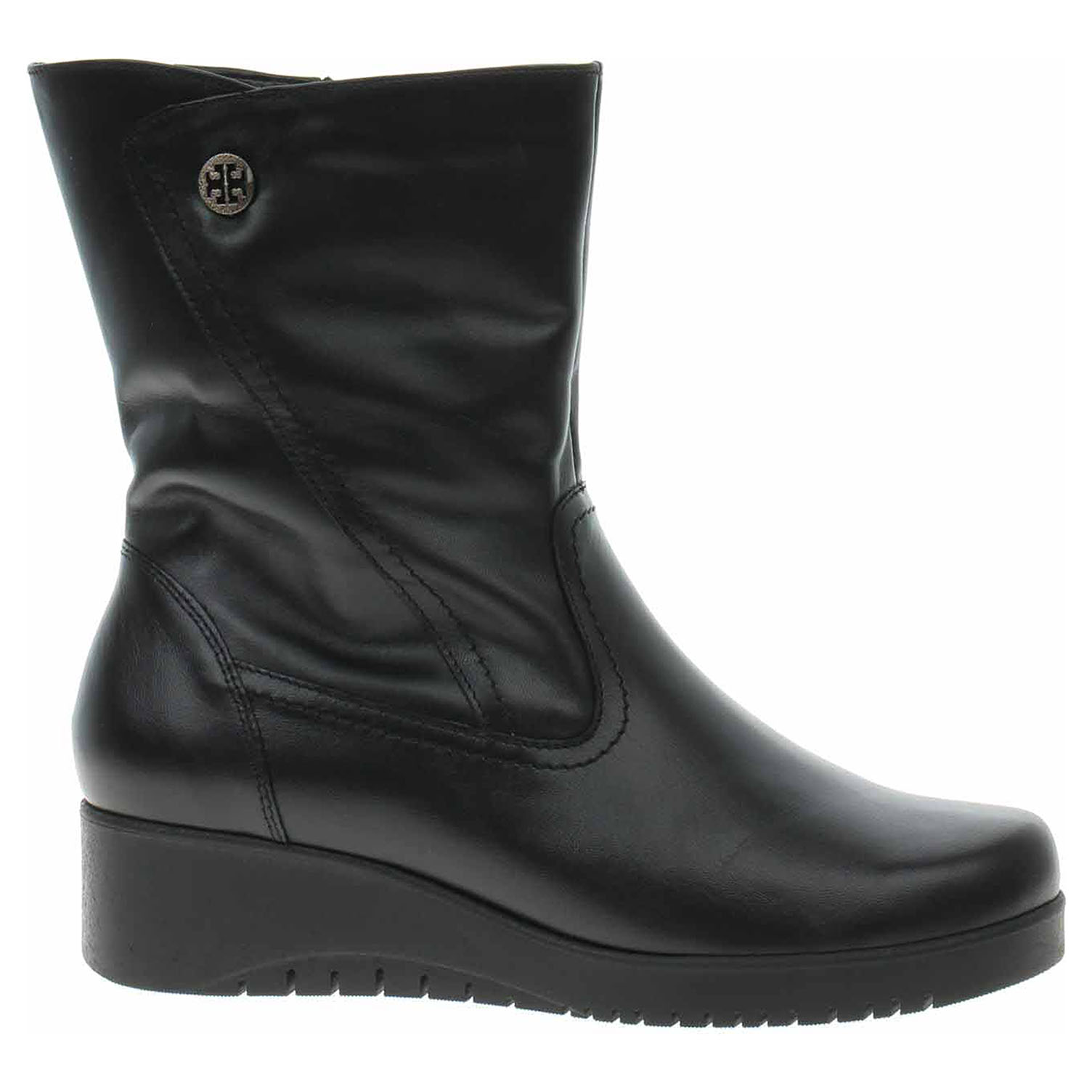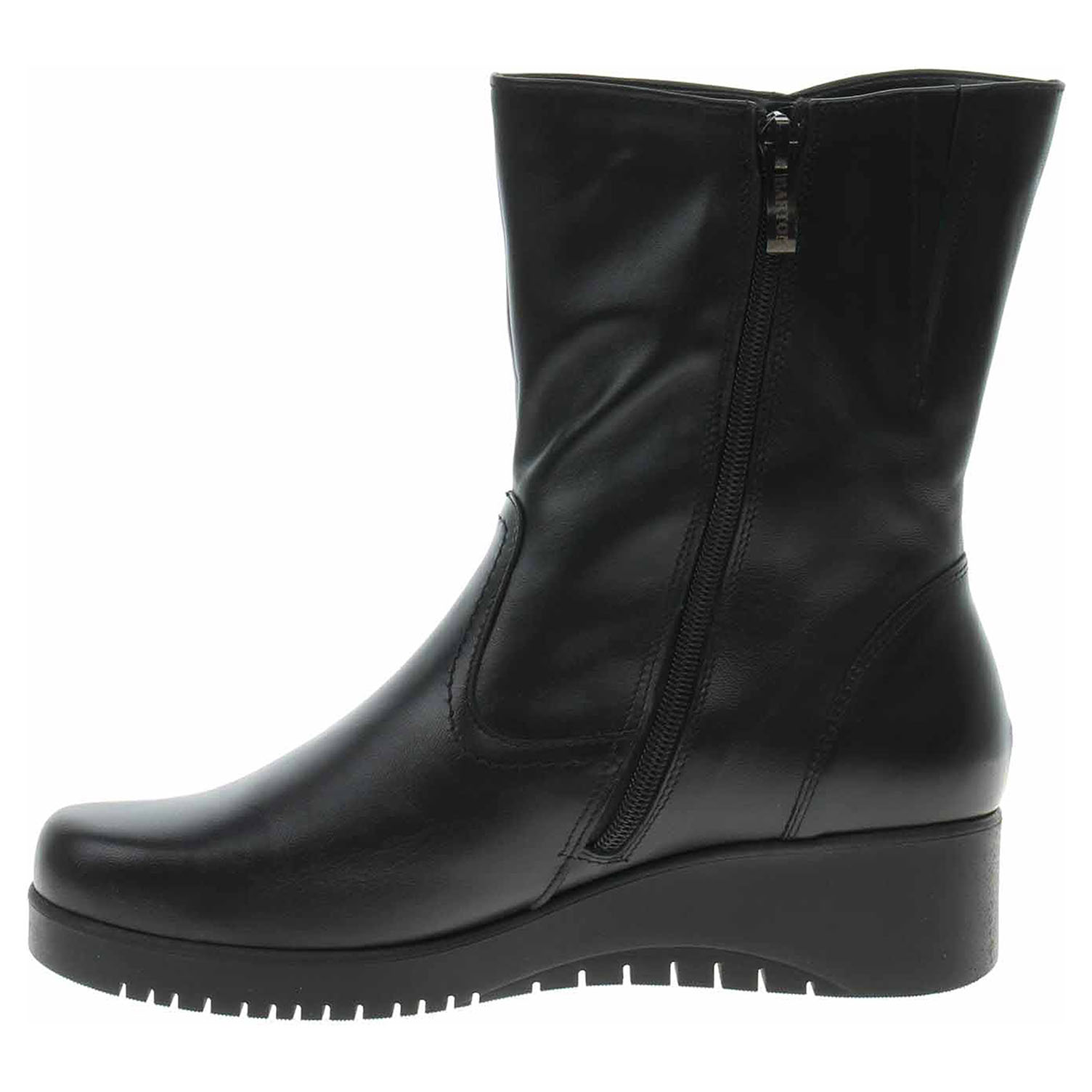 Boty Barton - lepené dámské polokozačky se svrškem z usně jsou vybavené zipem a na vnitřní straně vsazenou gumičkou. Obuv je vyteplená textilní podšívkou s delším chloupkem. Klínek je vysoký 4,- cm. Lepená obuv - pevnost lepeného spoje může být negativně ovlivněna promáčením nebo propocením, event. opakovaným používáním nedostatečně vysušené obuvi. Při neopatrné chůzi může dojít k mechanickému uvolnění lepeného spoje - ukopnutí.