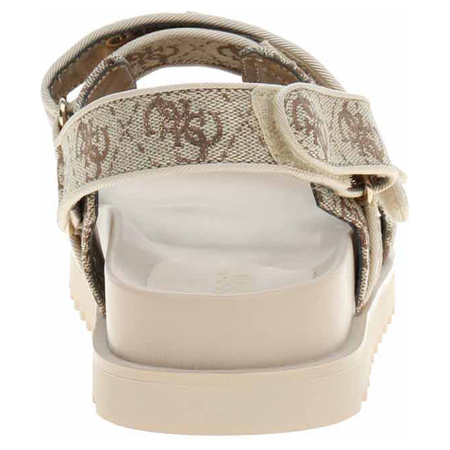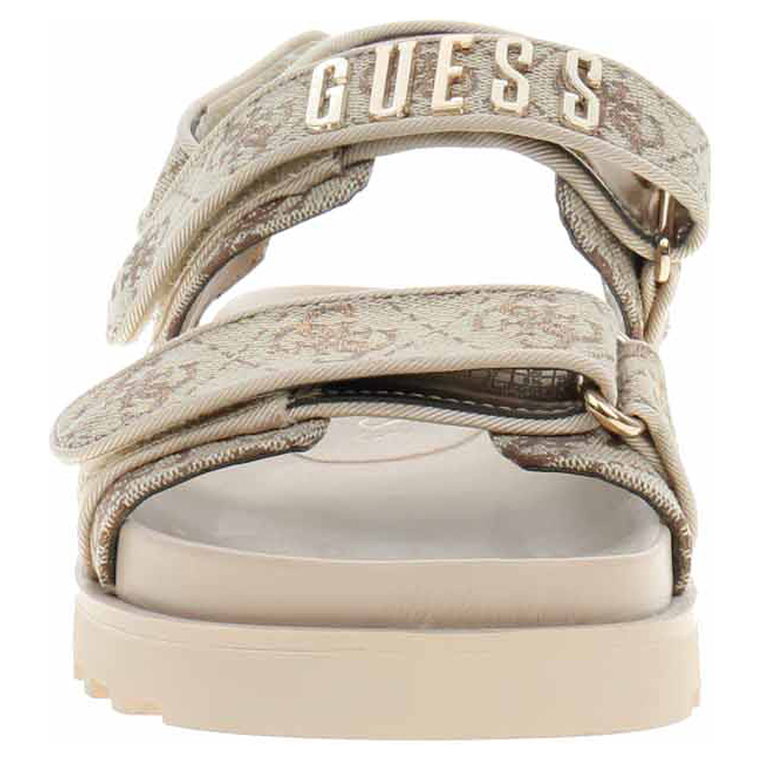 Boity Guess - dámské sandály s textilním (100% polyester) svrškem potištěným logem 4G a s podšívkou i stélkou ze syntetiky mají klínek vysoký 3,- cm a platforma je vysoká 2,- cm. Pásky přes špičku, kotník a přes patu se zapínají na suchý zip.