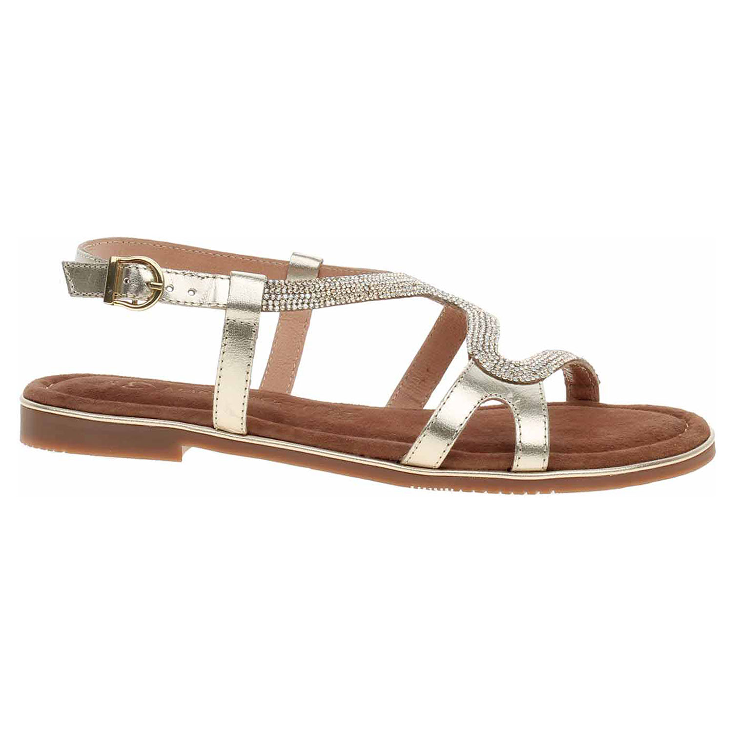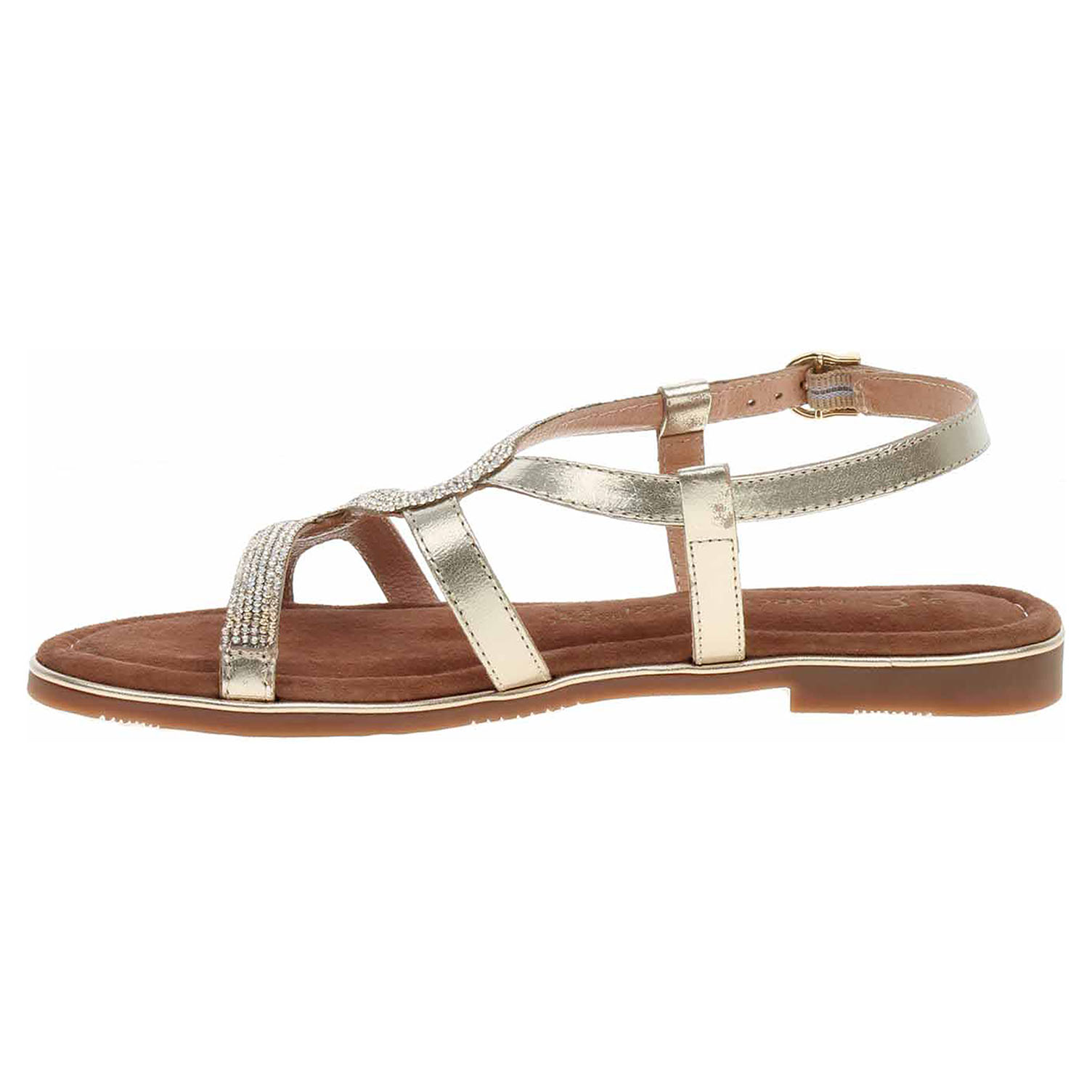 Boty Marco Tozzi - dámské sandály se svrškem z povrstvené usně s páskem ozdobeným třpytivými kamínky jsou vybavené vyměkčenou stélkou Feel me s nášlapnou vrstvou z usně, která se přizpůsobuje vašemu chodidlu a zajišťuje optimální komfort při chůzi. Pásek přes patu se zapíná na přezku. Podpatek je vysoký 1,5 cm.