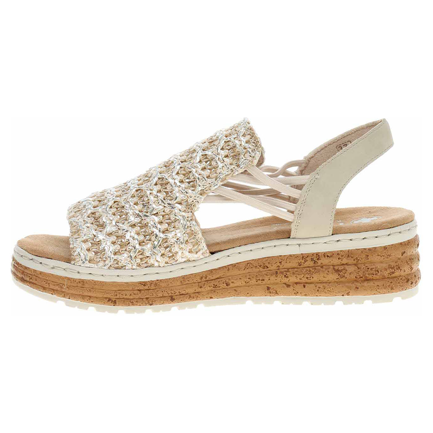 Boty Rieker - dámské sandály nadměrné šíře H se svrškem ze syntetiky a s textilní podšívkou i stélkou mají klínek vysoký 4,4 cm a platformu 2,- cm. Gumičky na vnější i na vnitřní straně kotníku umožňují pohodlné nazouvání a zajišťují vyšší stabilitu nohy v obuvi. Podešev je flexibilní a díky systému Antistress (lehkost, pružnost, prostornost a vynikající absorpce nárazů) Vám obuv zajistí pohodlí při každém kroku.