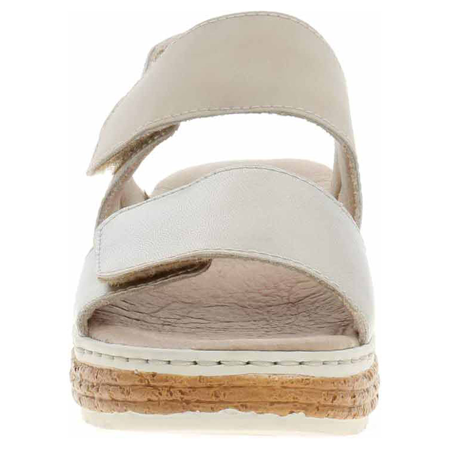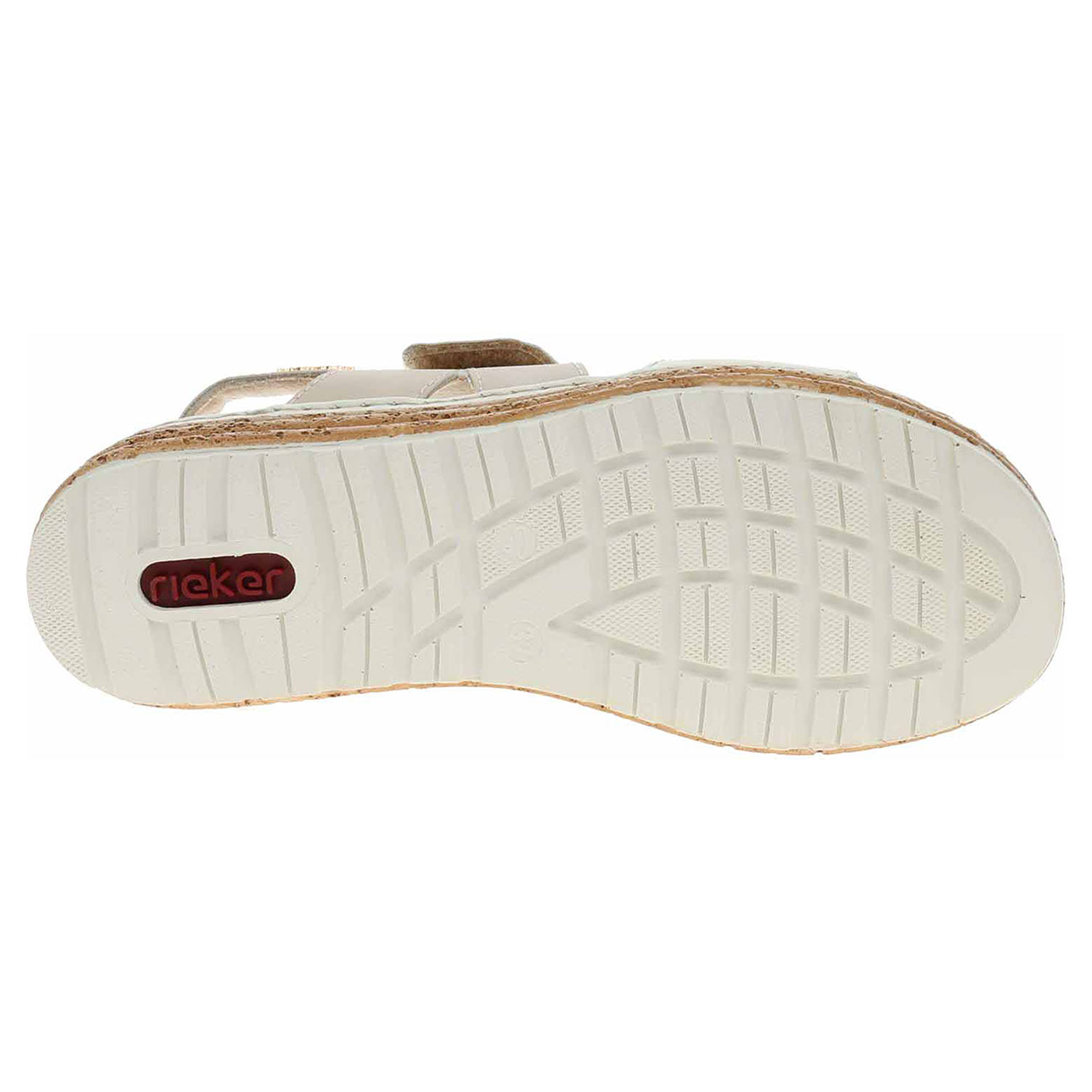 Boty Rieker - dámské béžové sandály se zlatým páskem na nártu nadměrné šíře H se svrškem z usně a s textilní podšívkou jsou vybavené vyměkčenou stélkou s nášlapnou vrstvou z usně. Pásky přes špičku přes nárt se zapínají na suchý zip. Pásek přes patu je vybavený vsazenou gumičkou. Podešev je flexibilní a díky systému Antistress skvěle tlumí nárazy a otřesy. Klínek je vysoký 4,4 cm a platforma je vysoká 2,5 cm. Podešev je flexibilní a díky systému Antistress (lehkost, pružnost, prostornost a vynikající absorpce nárazů) Vám obuv zajistí pohodlí při každém kroku.
