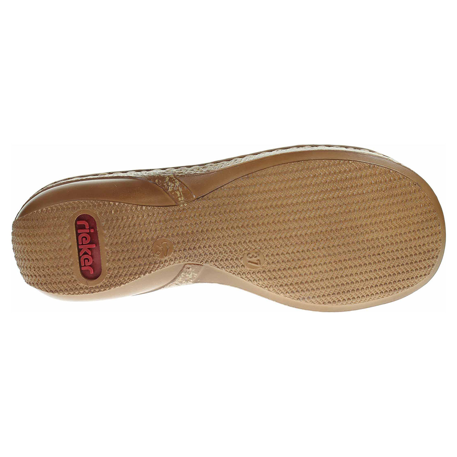 Boty Rieker - dámské sandály se syntetickým svrškem a s textilní stélkou mají klínek vysoký 3,- cm. Horní široké gumičky přes nárt umožňují pohodlné nazouvání a zajišťují vyšší stabilitu nohy v obuvi. Podešev je flexibilní a díky systému Antistress skvěle tlumí nárazy a otřesy.