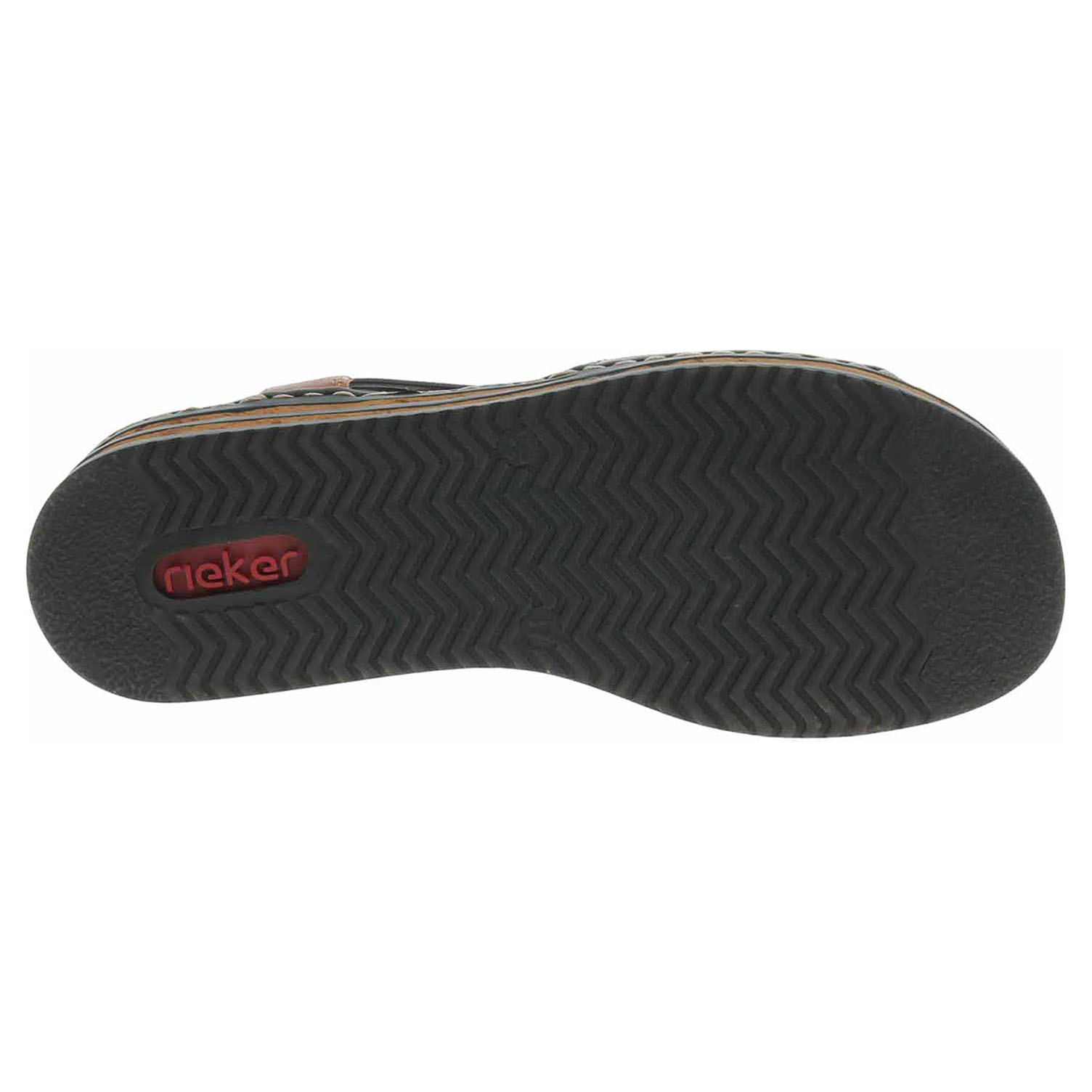 Boty Rieker - dámské sandály se svrškem i podšívkou ze syntetiky a s textilní stélkou mají klínek vysoký 4,- cm a platformu 2,- cm. Gumičky na vnější i na vnitřní straně kotníku umožňují pohodlné nazouvání a zajišťují vyšší stabilitu nohy v obuvi. Podešev je flexibilní a díky systému Antistress (lehkost, pružnost, prostornost a vynikající absorpce nárazů) Vám obuv zajistí pohodlí při každém kroku.