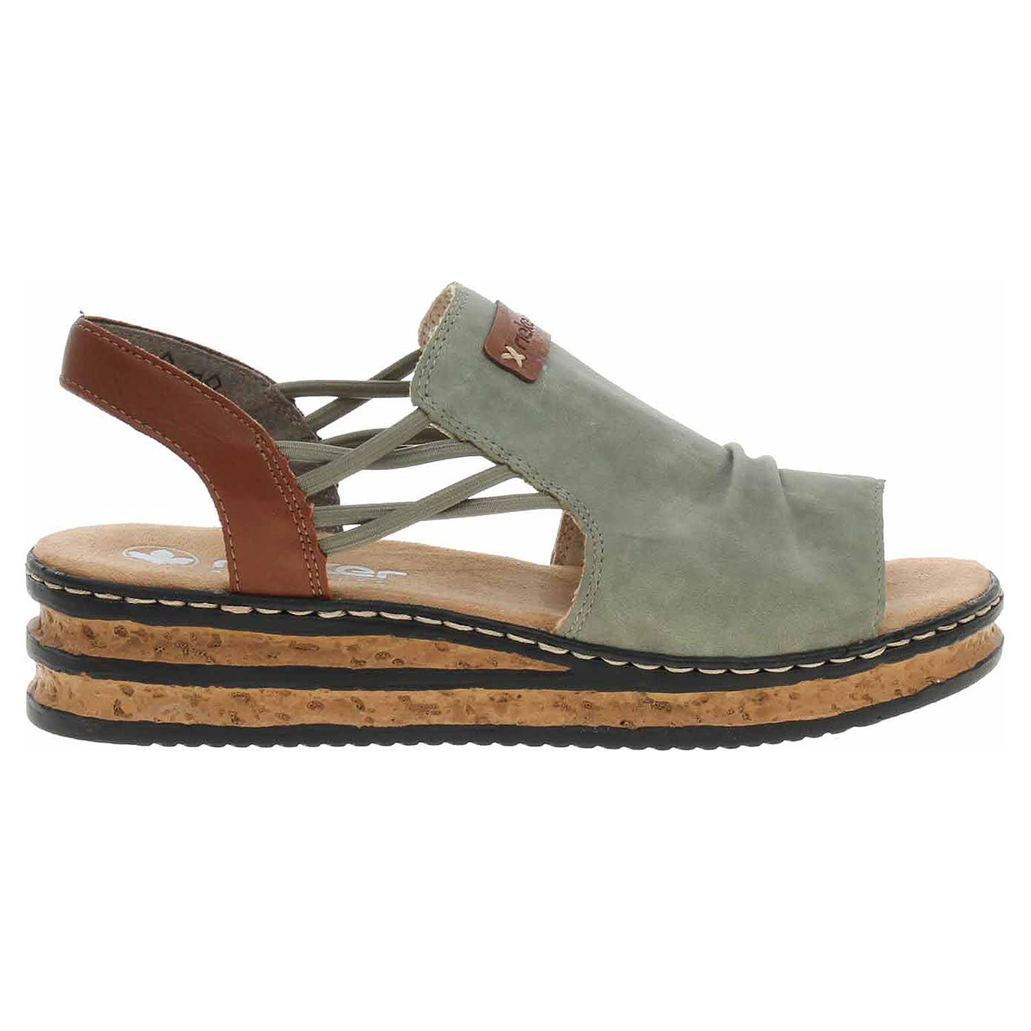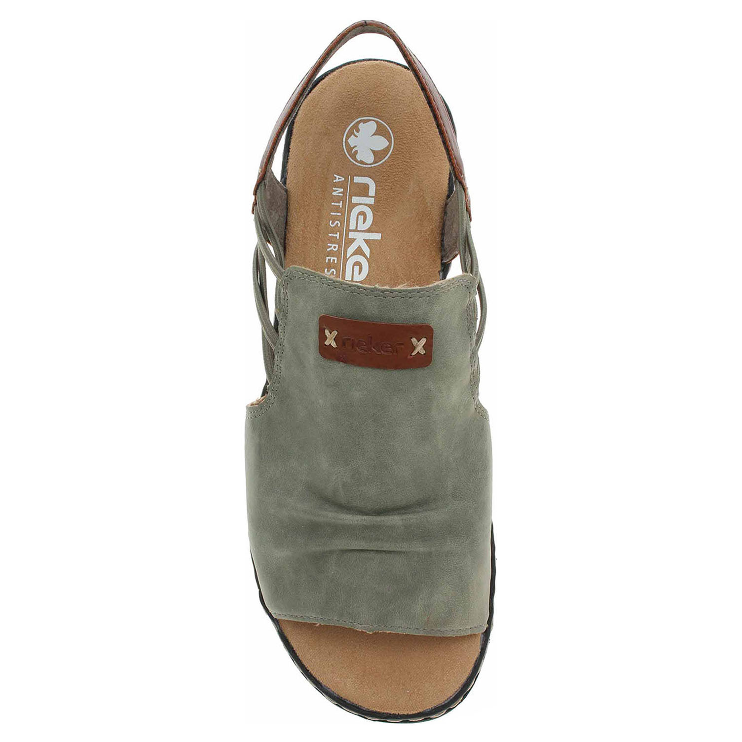 Boty Rieker - dámské sandály se svrškem ze syntetiky a s textilní podšívkou i stélkou mají klínek vysoký 4,- cm a platformu 2,- cm. Gumičky na vnější i na vnitřní straně kotníku umožňují pohodlné nazouvání a zajišťují vyšší stabilitu nohy v obuvi. Podešev je flexibilní a díky systému Antistress skvěle tlumí nárazy a otřesy.