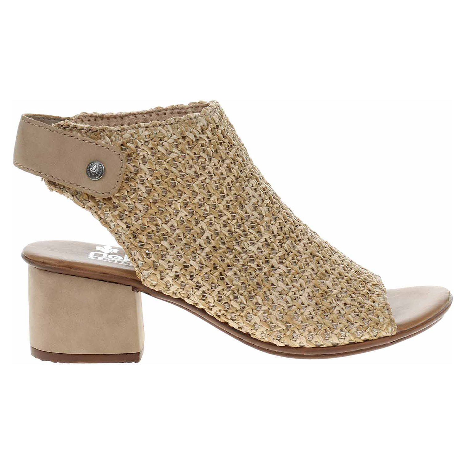 Boty Rieker - dámské sandály s textilním svrškem a stélkou ze syntetiky mají podpatek vysoký 5,- cm. Pásek přes patu se zapíná na suchý zip. Podešev je flexibilní a díky systému Antistress skvěle tlumí nárazy a otřesy.