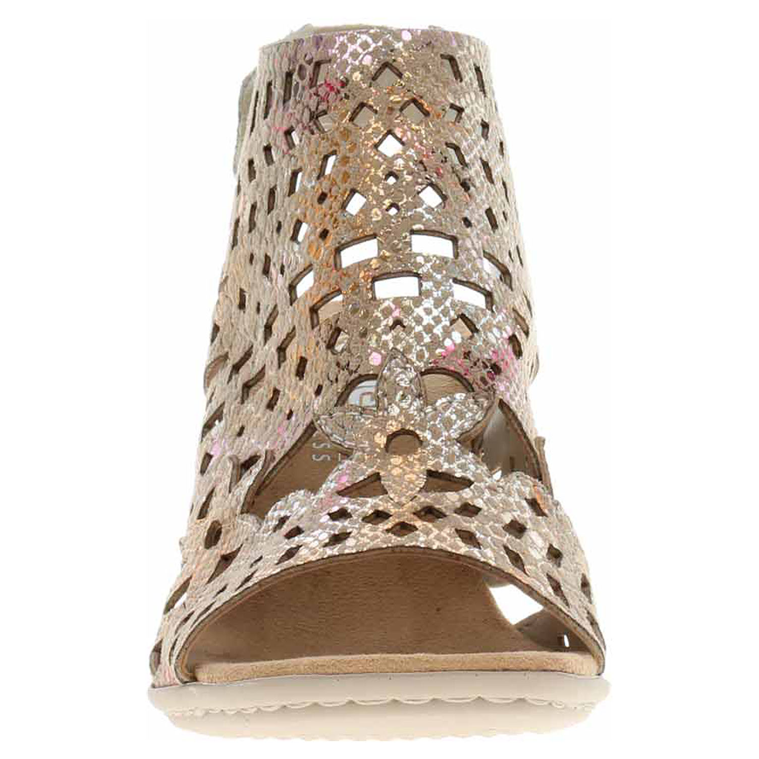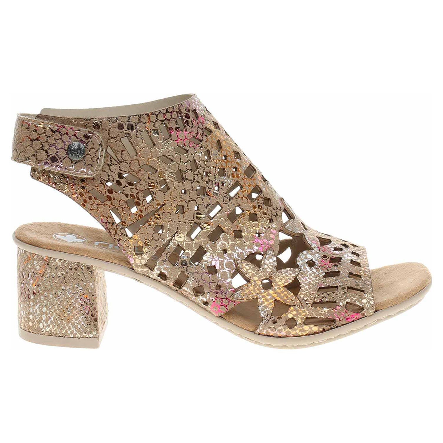 Boty Rieker - dámské sandály v barevné kombinaci béžová/zlatá mají svršek a podšívku ze syntetiky a textilní stélku. Pásek přes patu se zapíná na suchý zip. Podešev je flexibilní a díky systému Antistress (lehkost, pružnost, prostornost a vynikající absorpce nárazů) Vám obuv zajistí pohodlí při každém kroku. Podpatek je vysoký 5,5 cm.