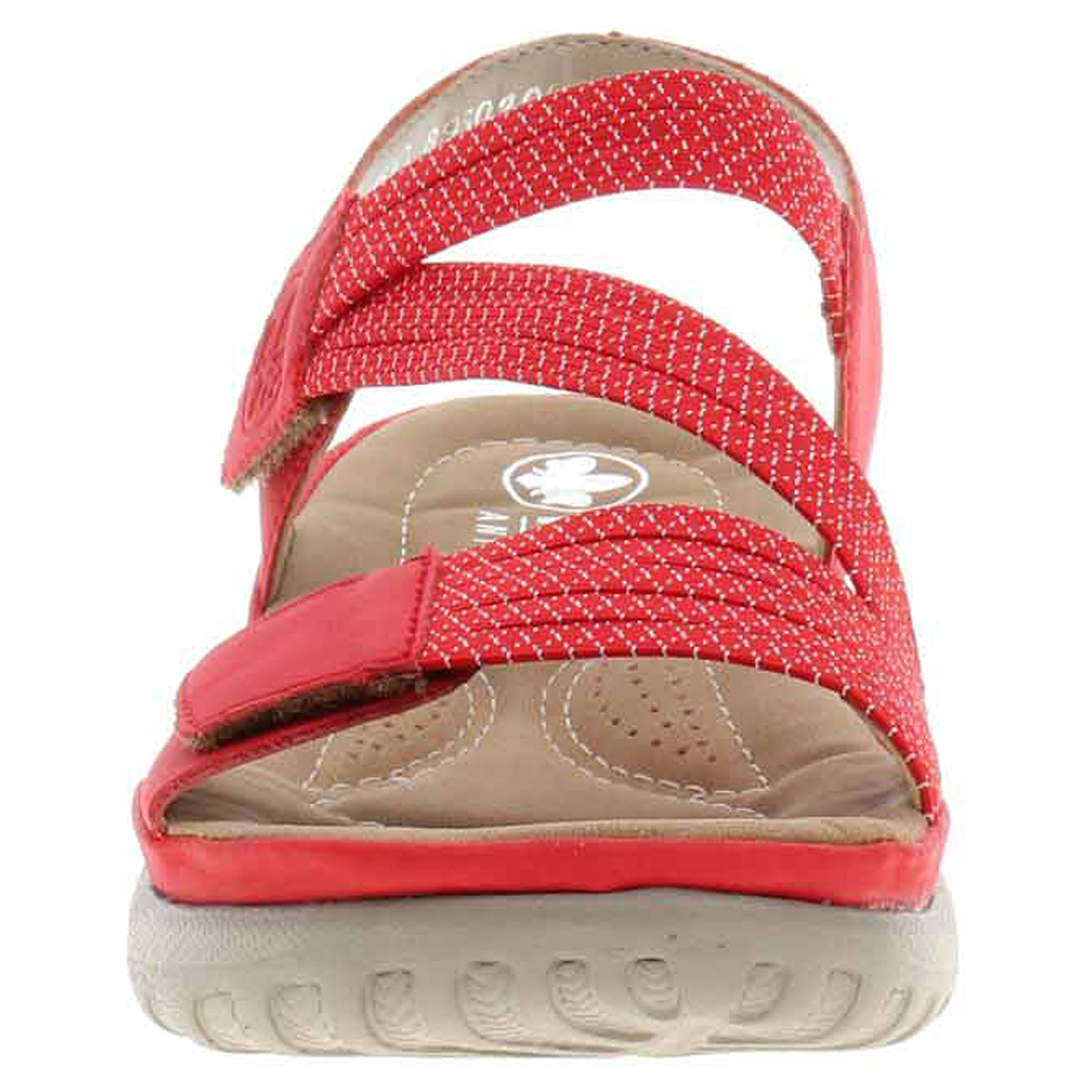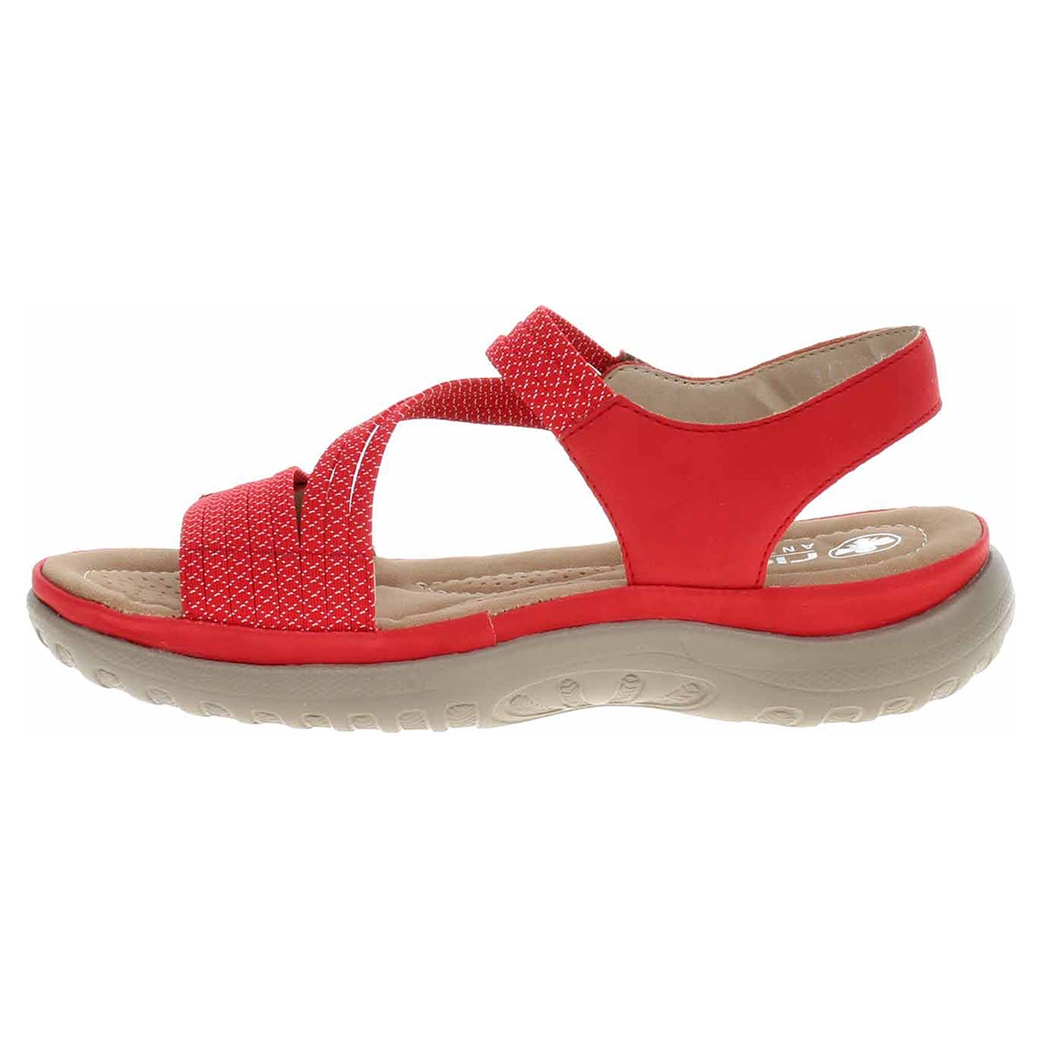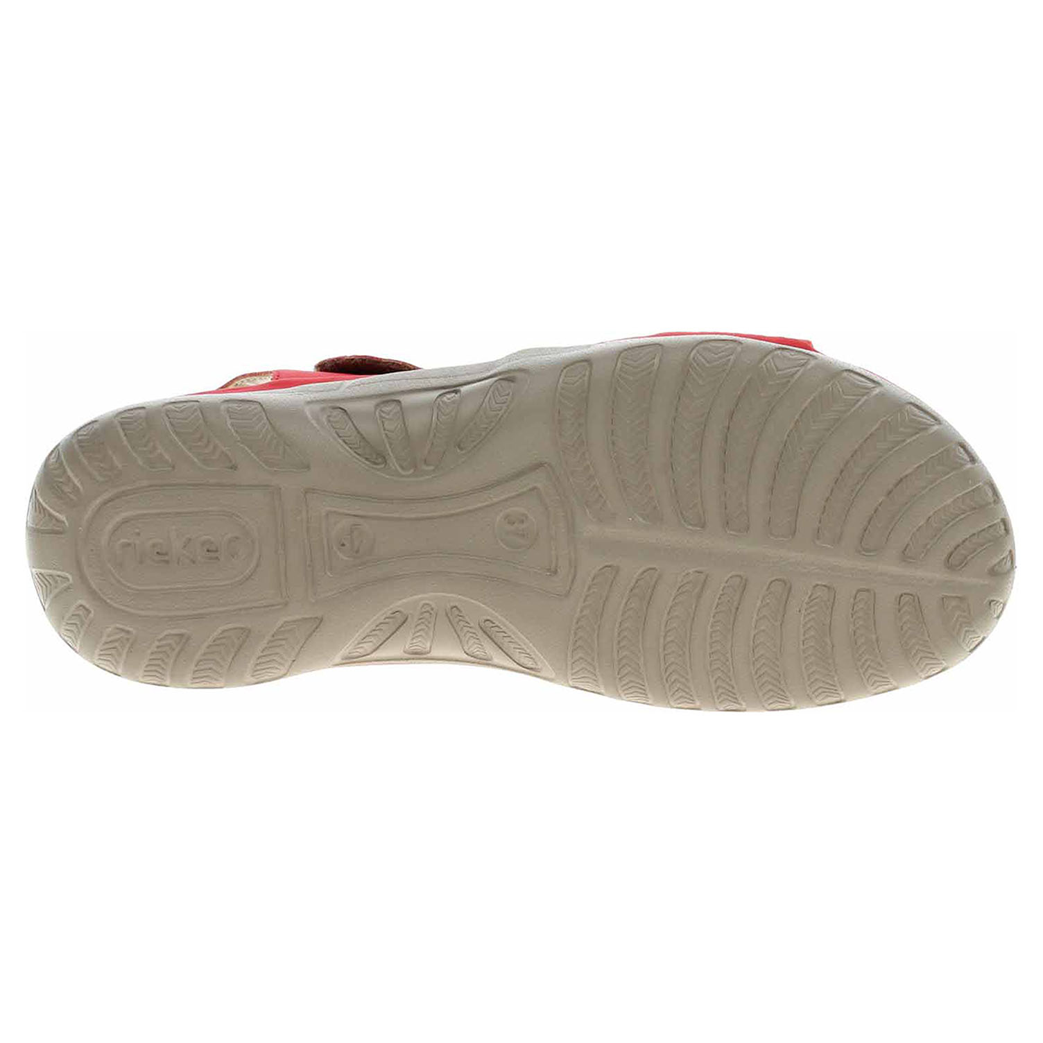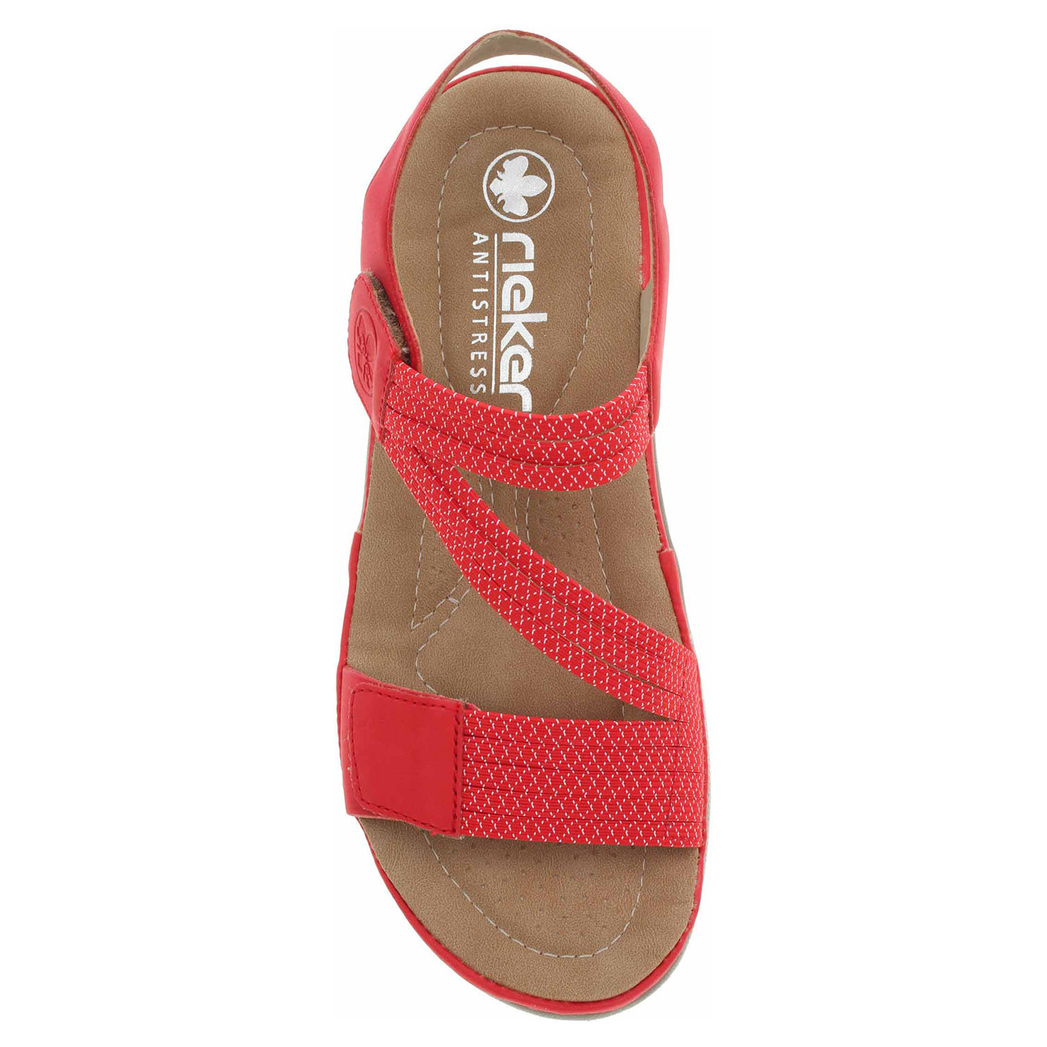 Boty Rieker - dámské sandály se svrškem, podšívkou i stélkou ze syntetiky mají klínek vysoký 3,5 cm a platforma je vysoká 2,5 cm. Gumičky přes špičku i přes nárt se zapínají na suchý zip. Podešev je flexibilní a díky systému Antistress (lehkost, pružnost, prostornost a vynikající absorpce nárazů) Vám obuv zajistí pohodlí při každém kroku.