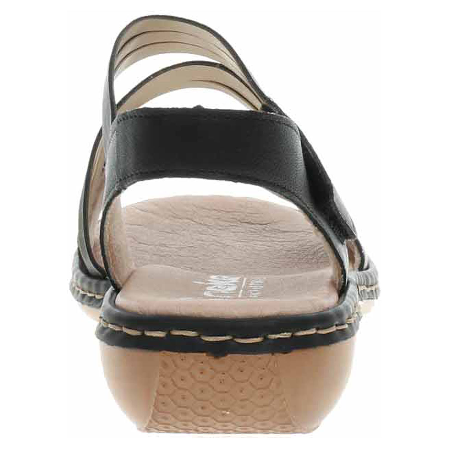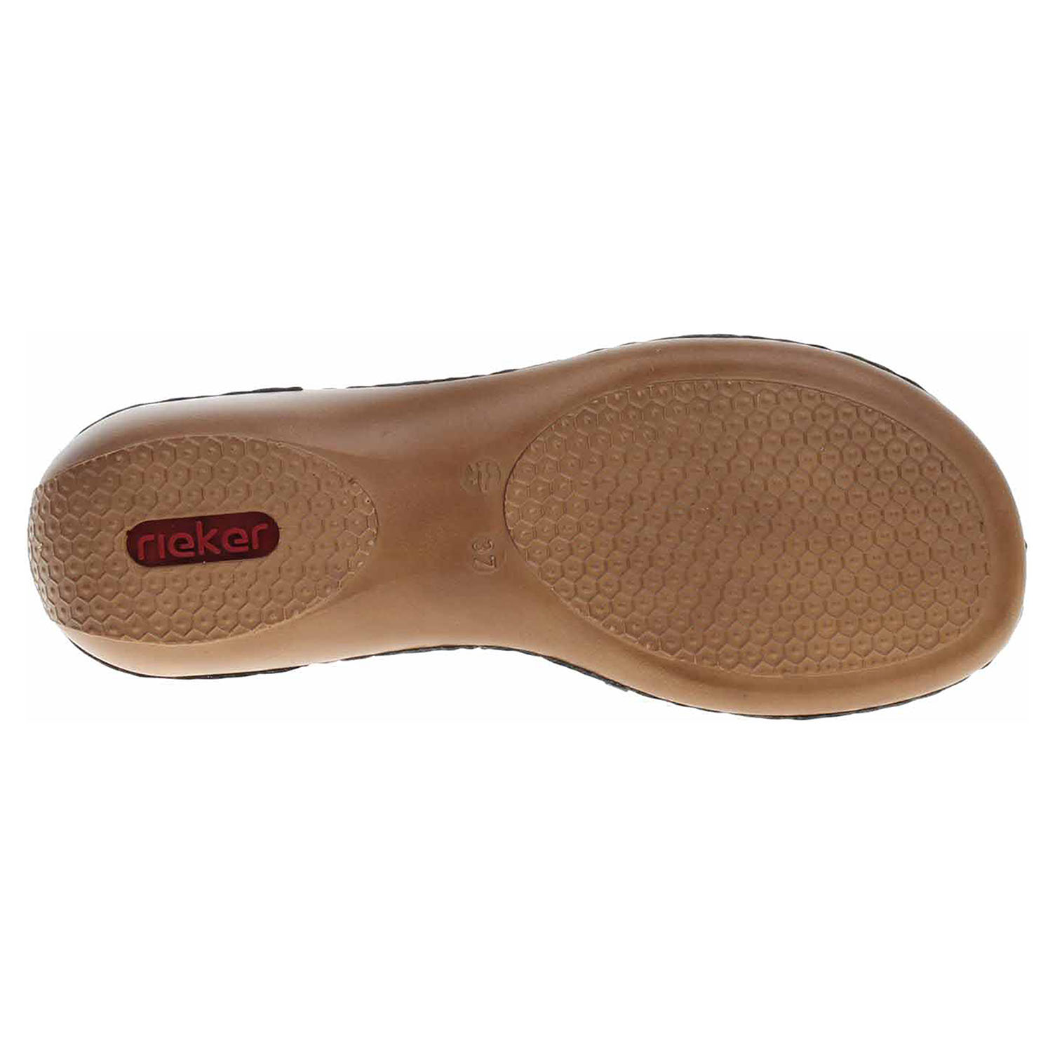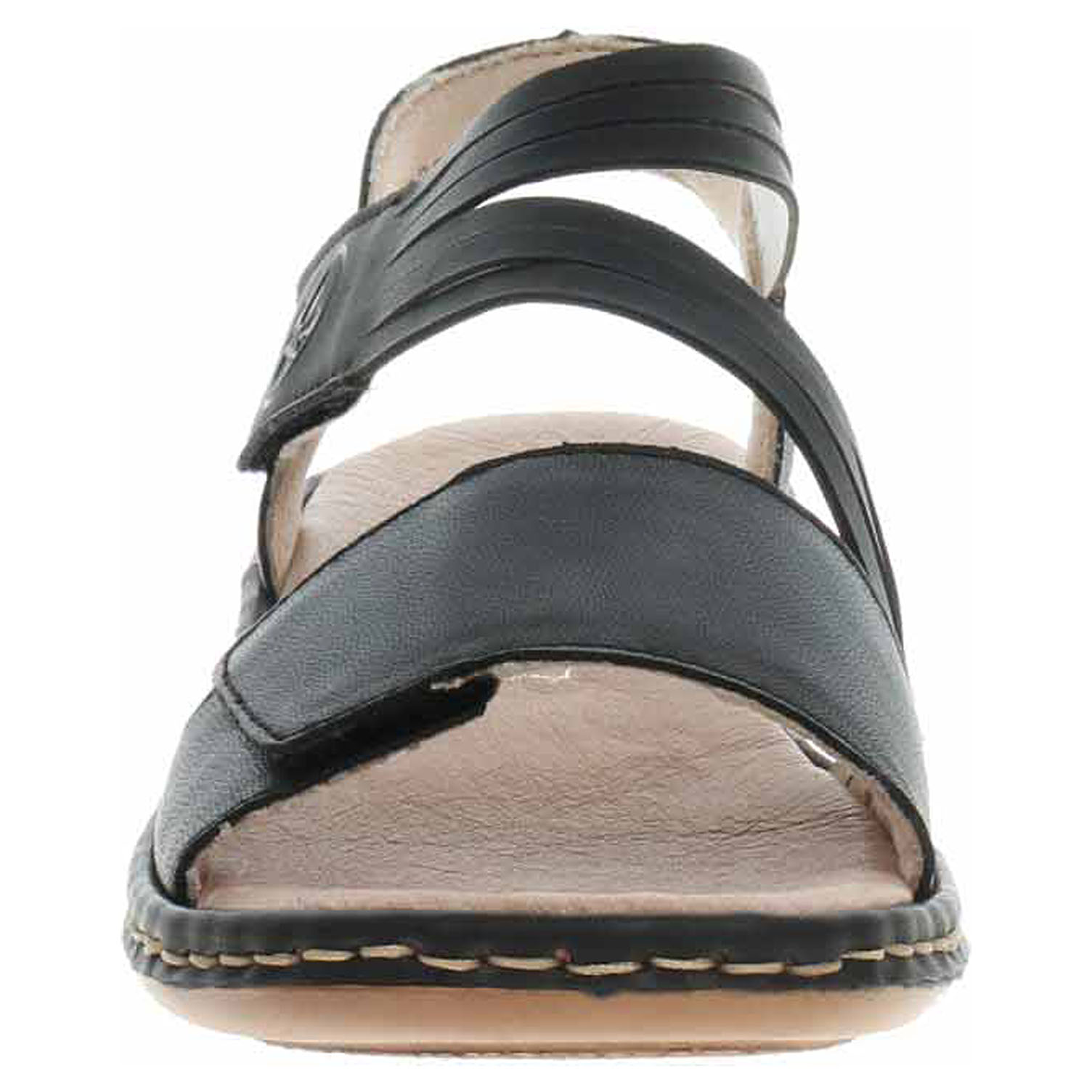 Boty Rieker - dámské sandály se svrškem z usně a s podšívkou kombinovanou textil/syntetika jsou vybavené vyměkčenou stélkou s nášlapnou vrstvou ze syntetiky. Pásky přes špičku i přes nárt se zapínají na suchý zip. Podešev je flexibilní a díky systému Antistress skvěle tlumí nárazy a otřesy. Klínek je vysoký 3,5 cm
