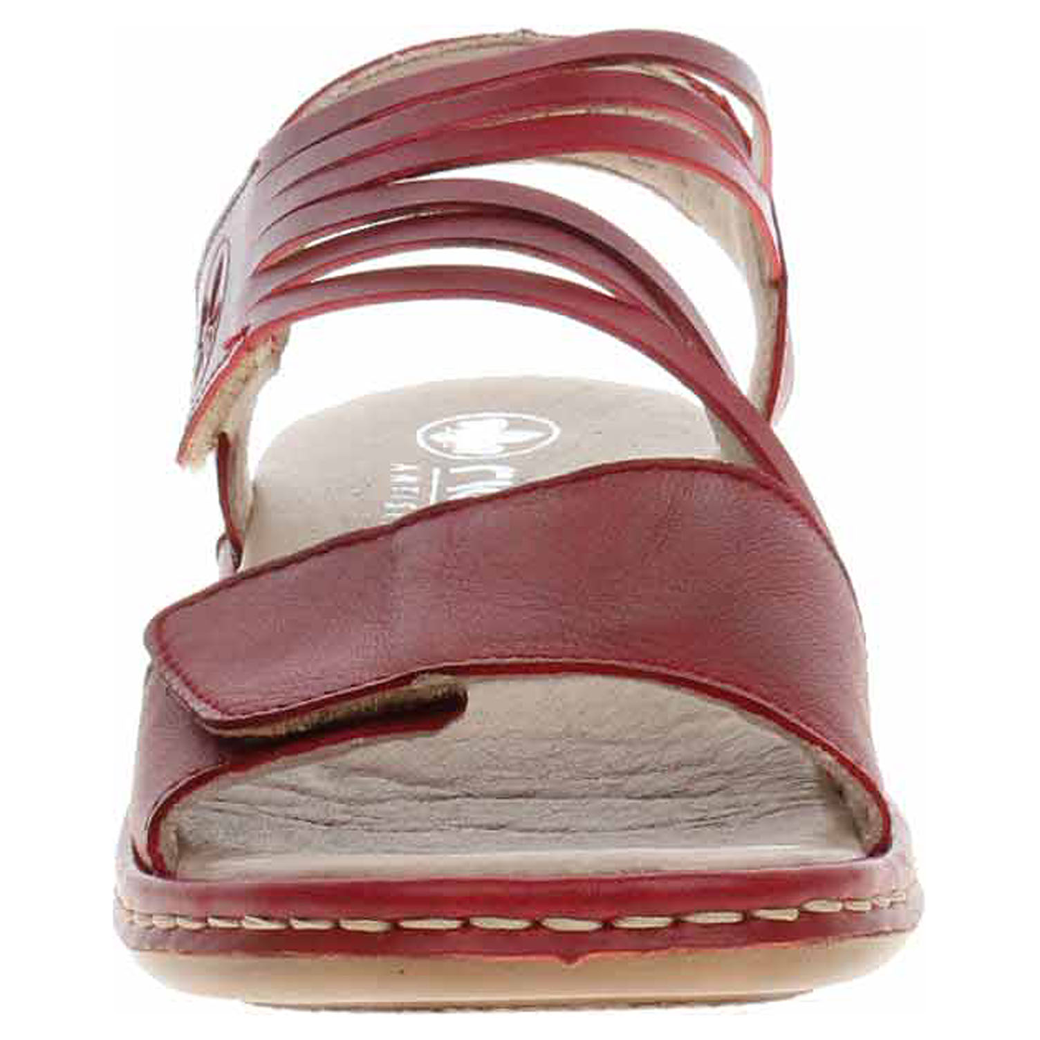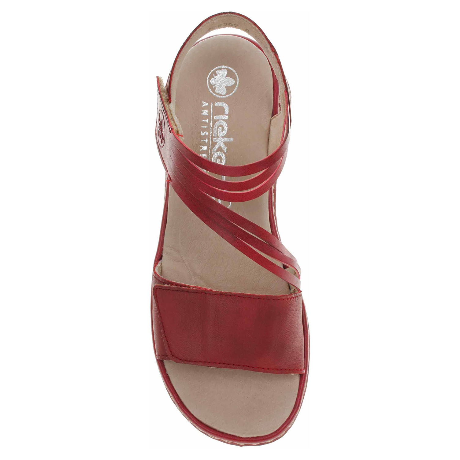 Boty Rieker - dámské sandály se svrškem z usně a s podšívkou kombinovanou textil/syntetika jsou vybavené vyměkčenou stélkou s nášlapnou vrstvou z usně. Pásky přes špičku i přes nárt se zapínají na suchý zip. Podešev je flexibilní a díky systému Antistress (lehkost, pružnost, prostornost a vynikající absorpce nárazů) Vám obuv zajistí pohodlí při každém kroku. Klínek je vysoký 3,5 cm