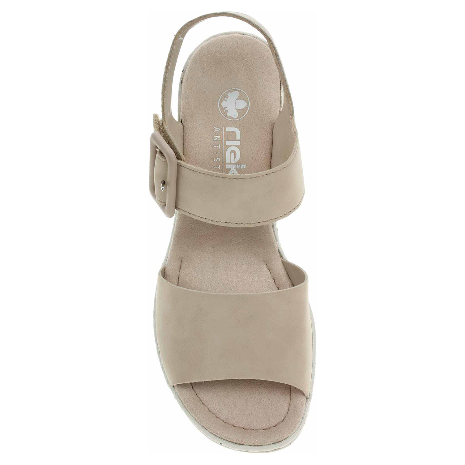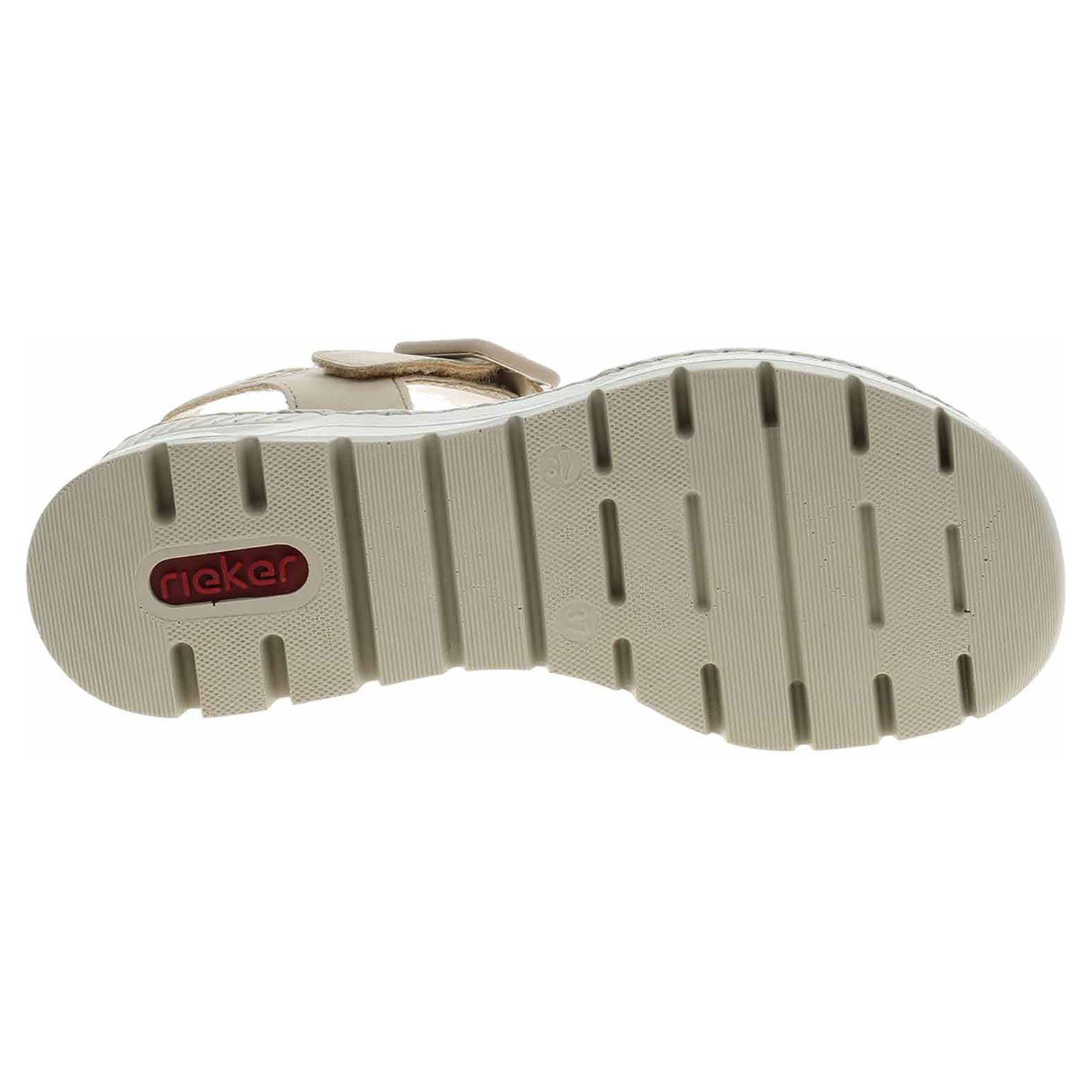 Boty Rieker - dámské sandály se svrškem i podšívkou ze syntetiky a se stélkou s textilní nášlapnou vrstvou. Pásek přes nárt se zapíná na suchý zip. Klínek je vysoký 5,5 cm a platforma je vysoká 2,5 cm. Podešev je flexibilní a díky systému Antistress skvěle tlumí nárazy a otřesy.