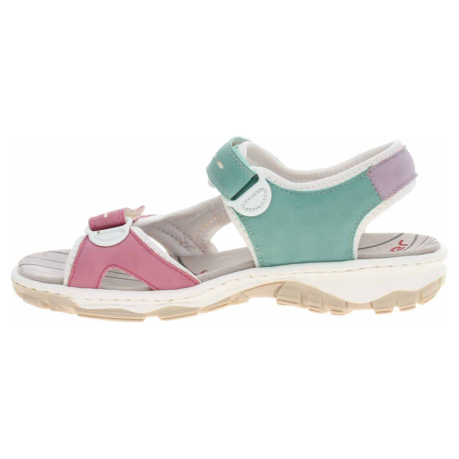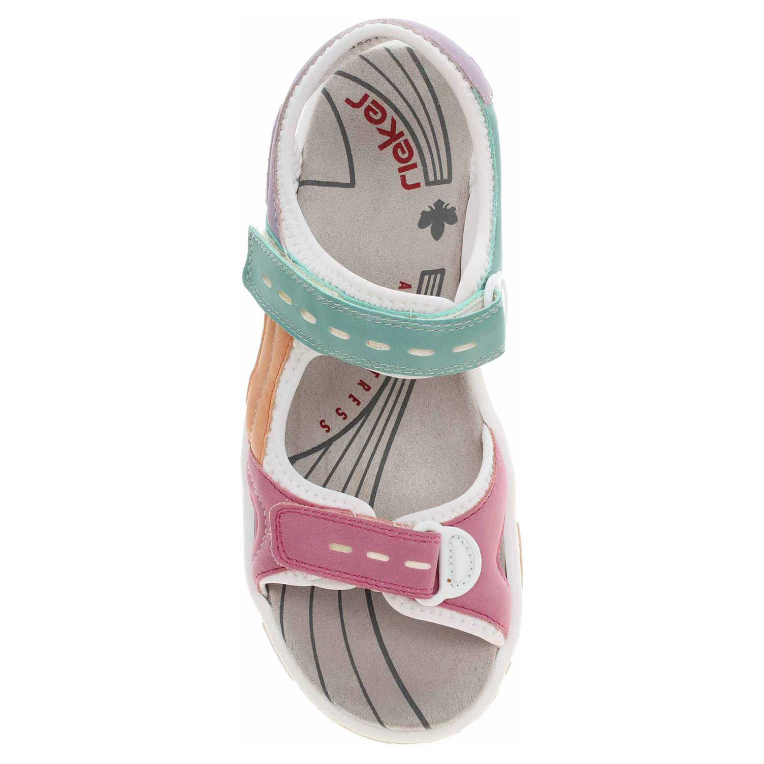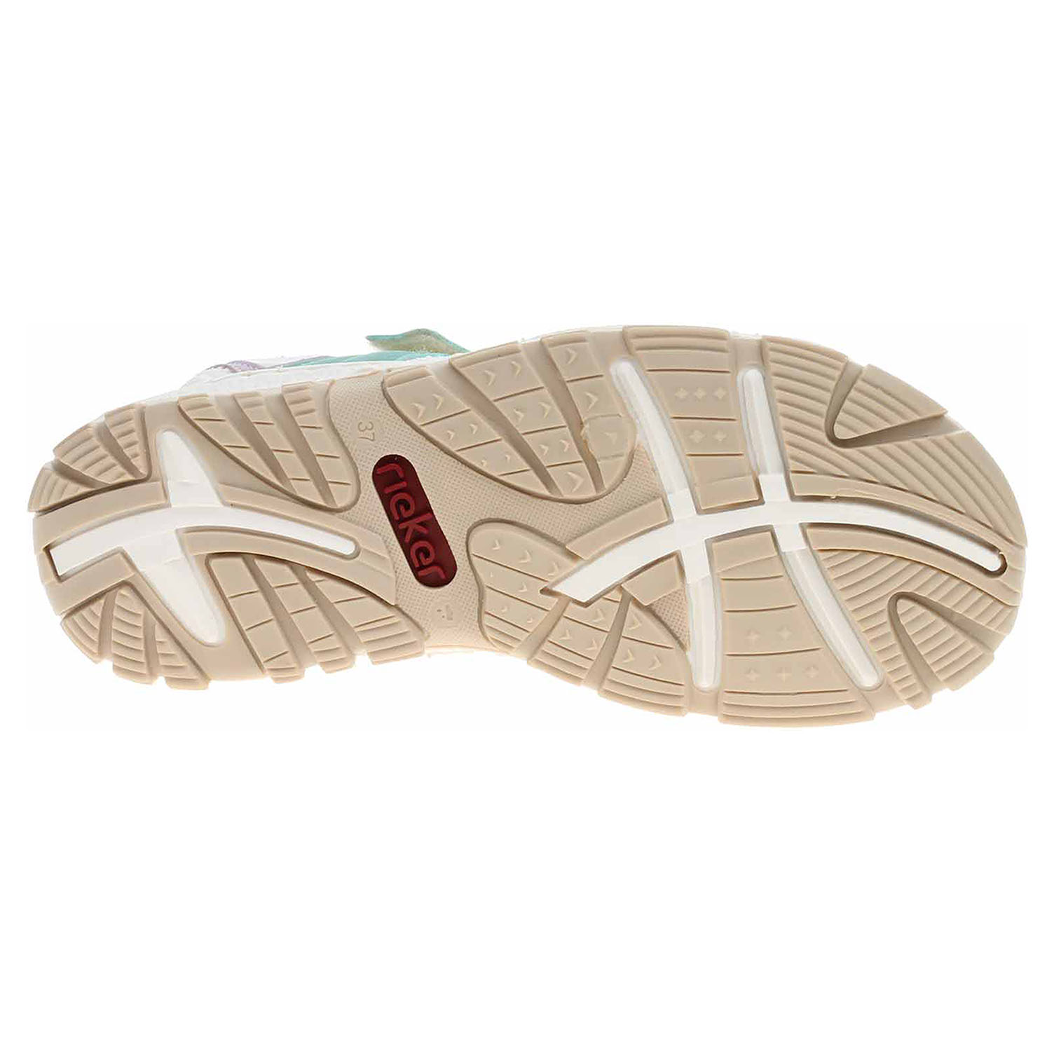 Boty Rieker - dámské sandály se svrškem kombinovaným syntetika/textil a s textilní podšívkou i stélkou. Pásky přes špičku a nárt se zapínají na suchý zip. Podešev je flexibilní a díky systému Antistress (lehkost, pružnost, prostornost a vynikající absorpce nárazů) Vám obuv zajistí pohodlí při každém kroku.