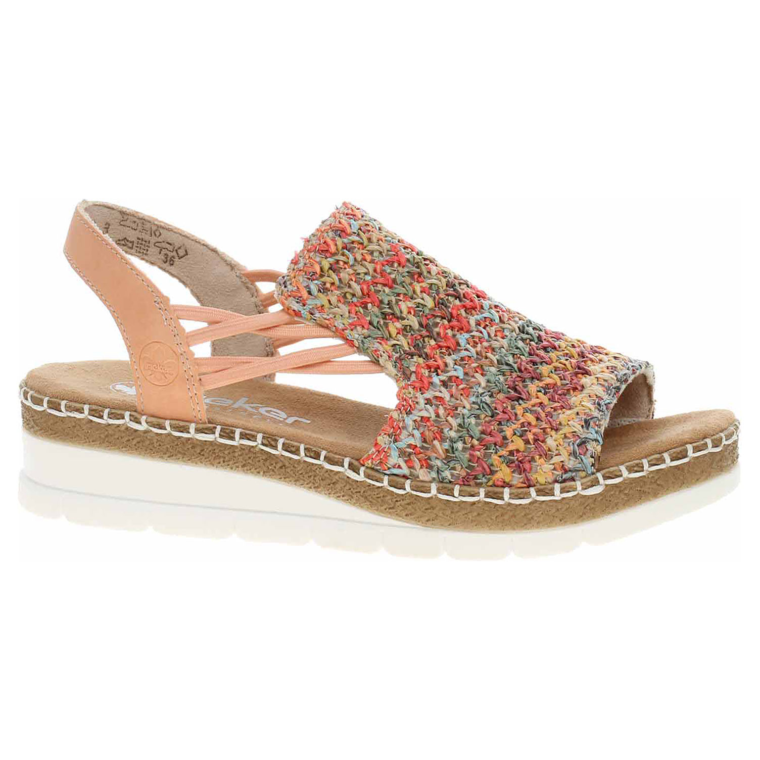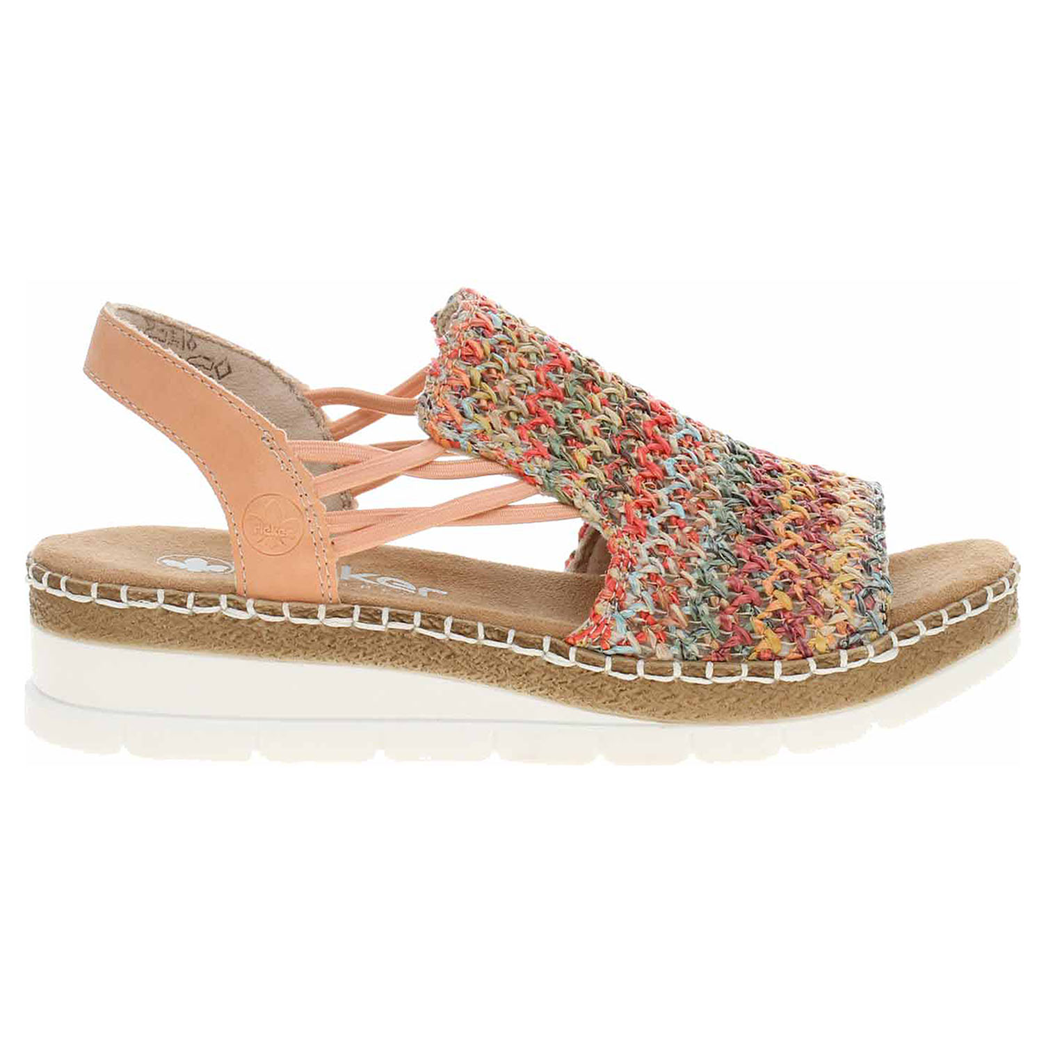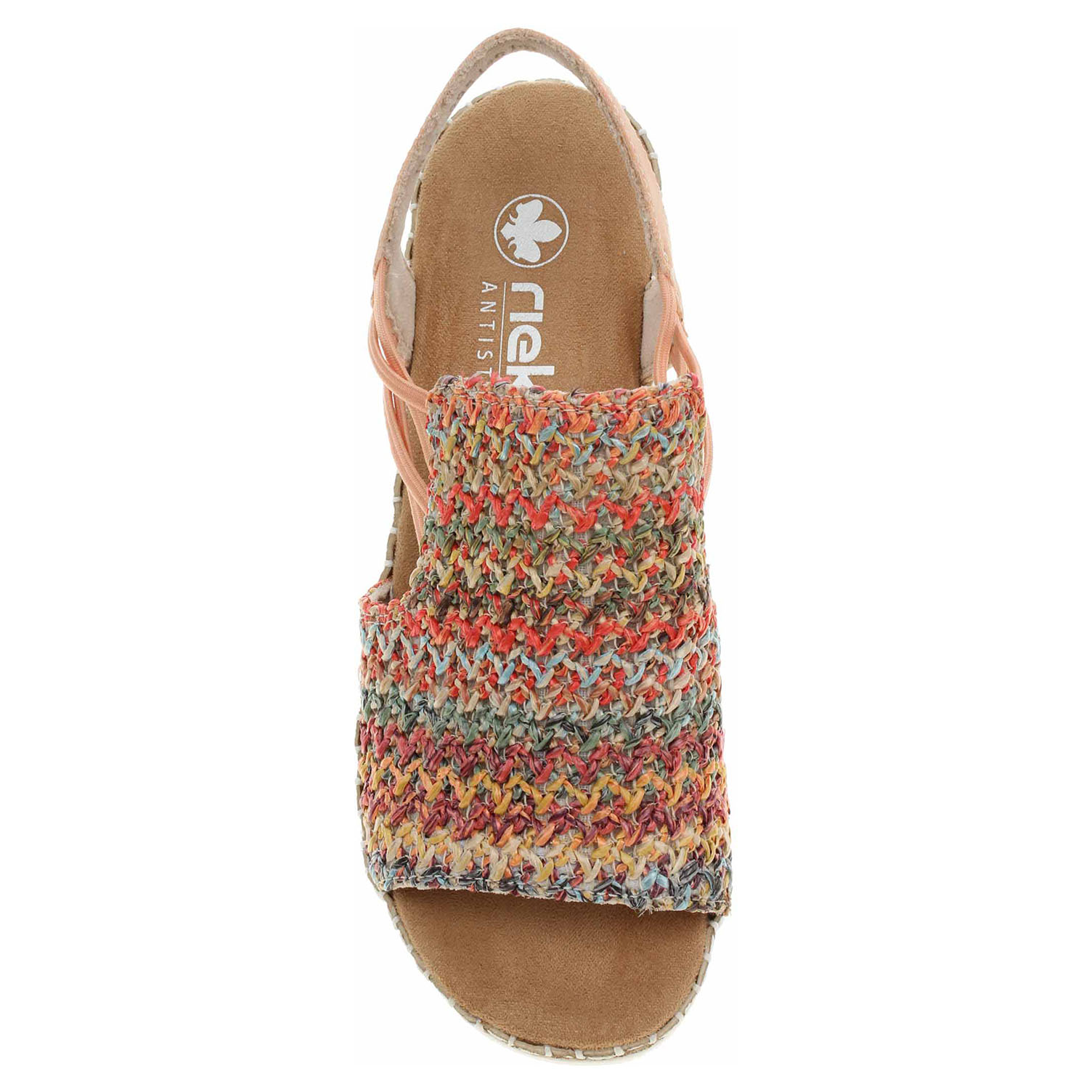 Boty Rieker - dámské sandály se svrškem kombinovaným textil/syntetika a s textilní podšívkou jsou vybavené vyměkčenou stélkou s textilní nášlapnou vrstvou. Klínek je vysoký 4,1 cm a platforma je vysoká 2,3 cm. Gumičky na vnější i na vnitřní straně kotníku umožňují pohodlné nazouvání a zajišťují vyšší stabilitu nohy v obuvi. Podešev je flexibilní a díky systému Antistress (lehkost, pružnost, prostornost a vynikající absorpce nárazů) Vám obuv zajistí pohodlí při každém kroku.