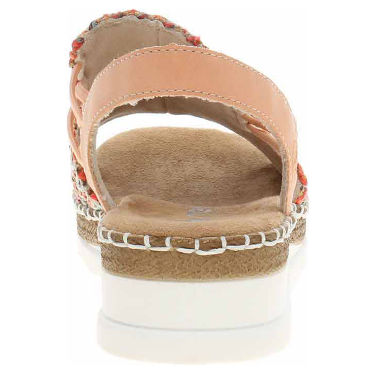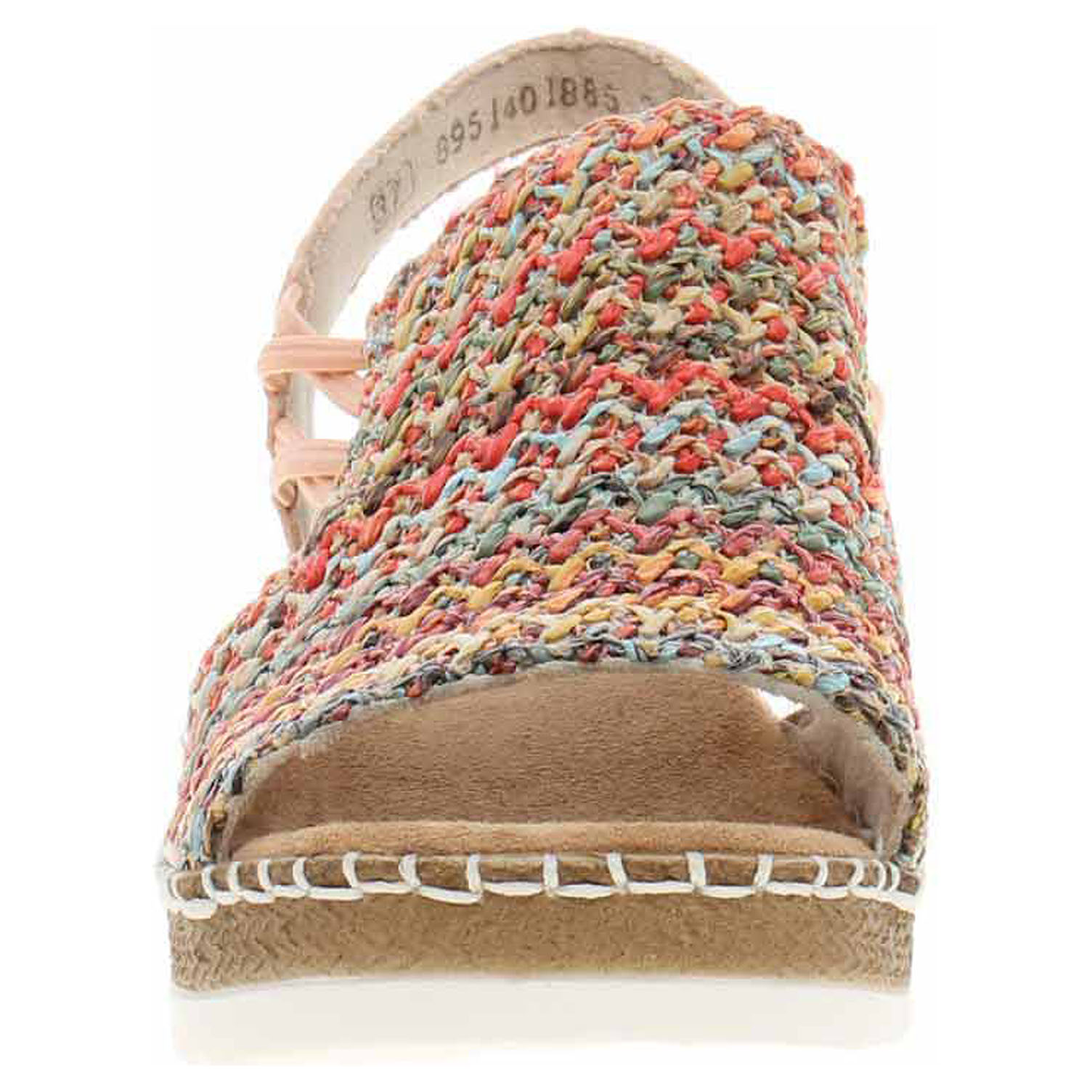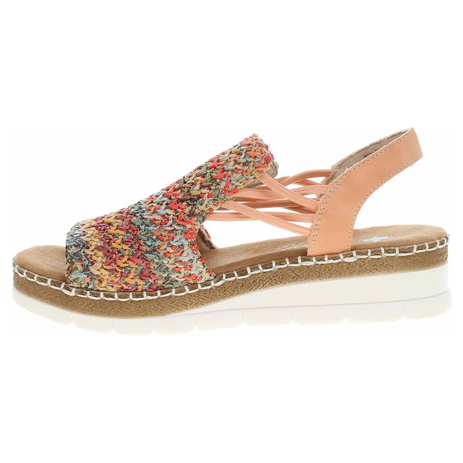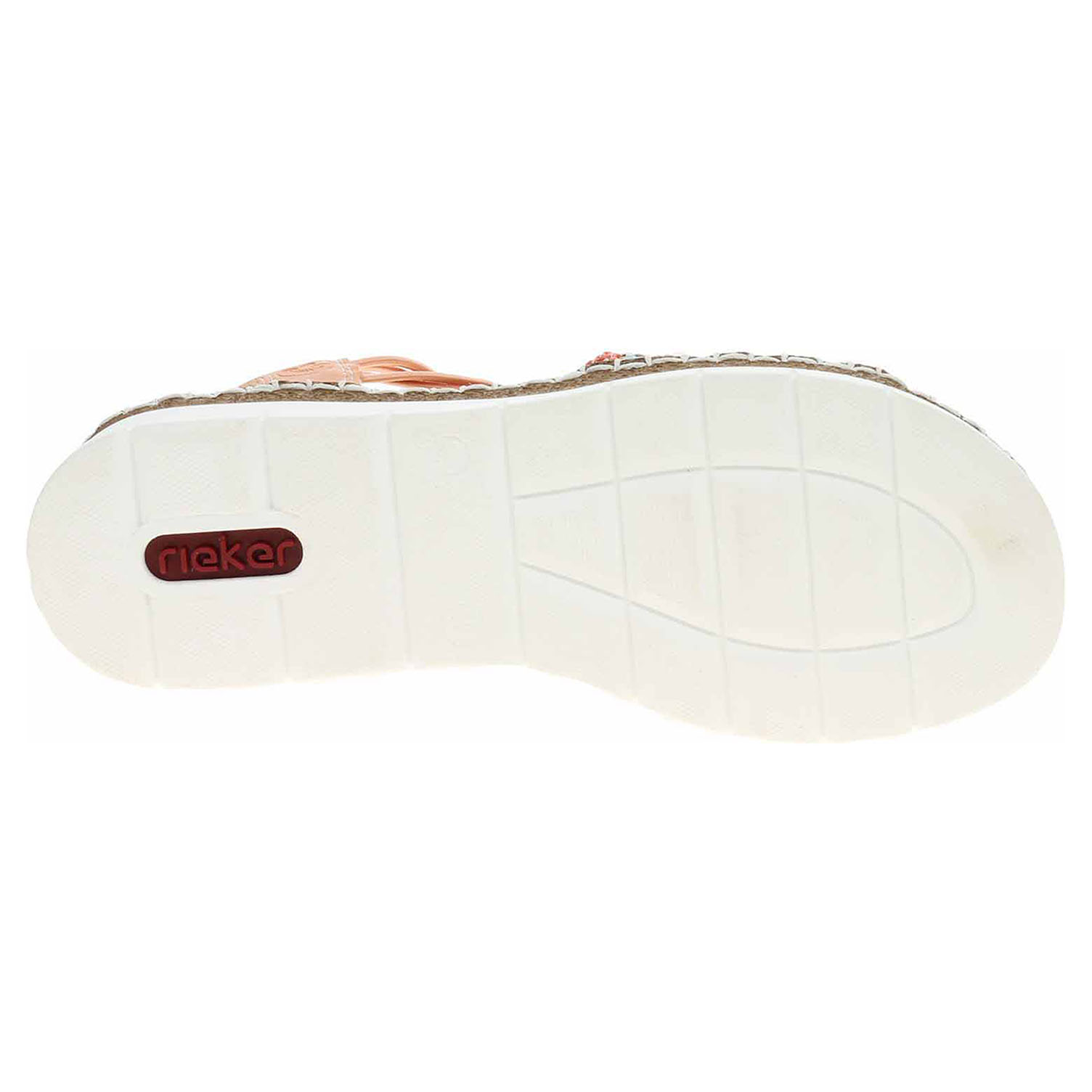 Boty Rieker - dámské sandály se svrškem kombinovaným textil/syntetika a s textilní podšívkou jsou vybavené vyměkčenou stélkou s textilní nášlapnou vrstvou. Klínek je vysoký 4,1 cm a platforma je vysoká 2,3 cm. Gumičky na vnější i na vnitřní straně kotníku umožňují pohodlné nazouvání a zajišťují vyšší stabilitu nohy v obuvi. Podešev je flexibilní a díky systému Antistress (lehkost, pružnost, prostornost a vynikající absorpce nárazů) Vám obuv zajistí pohodlí při každém kroku.
