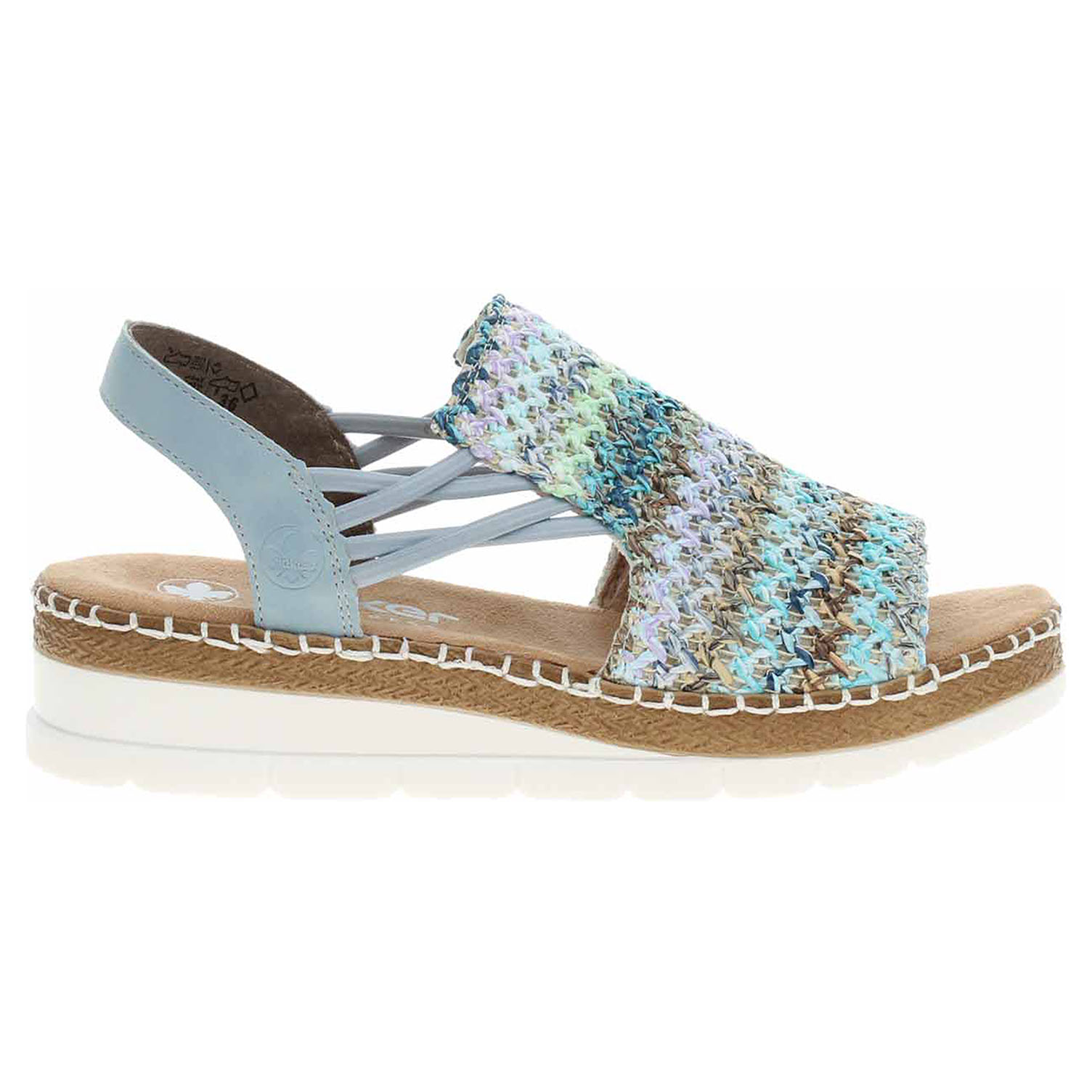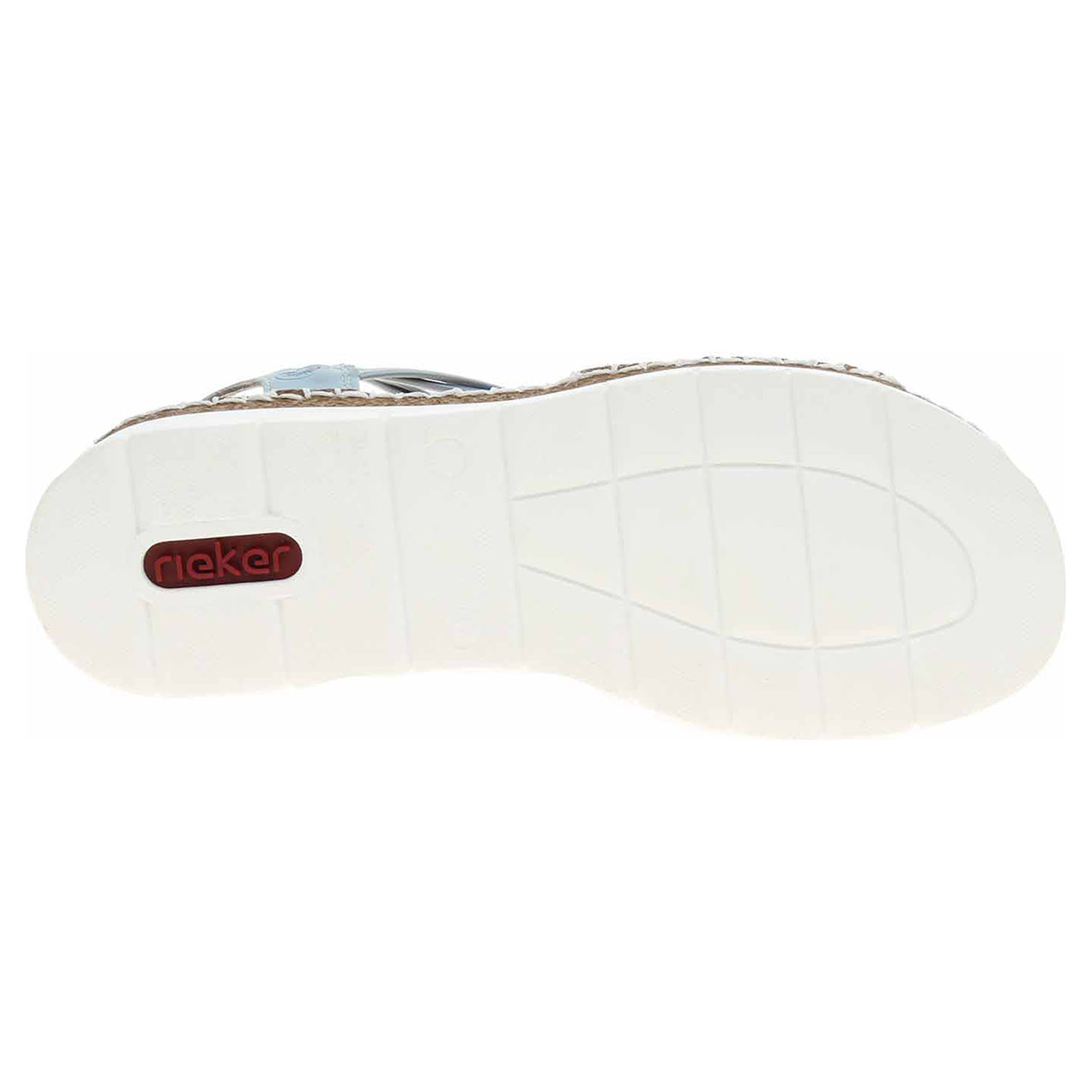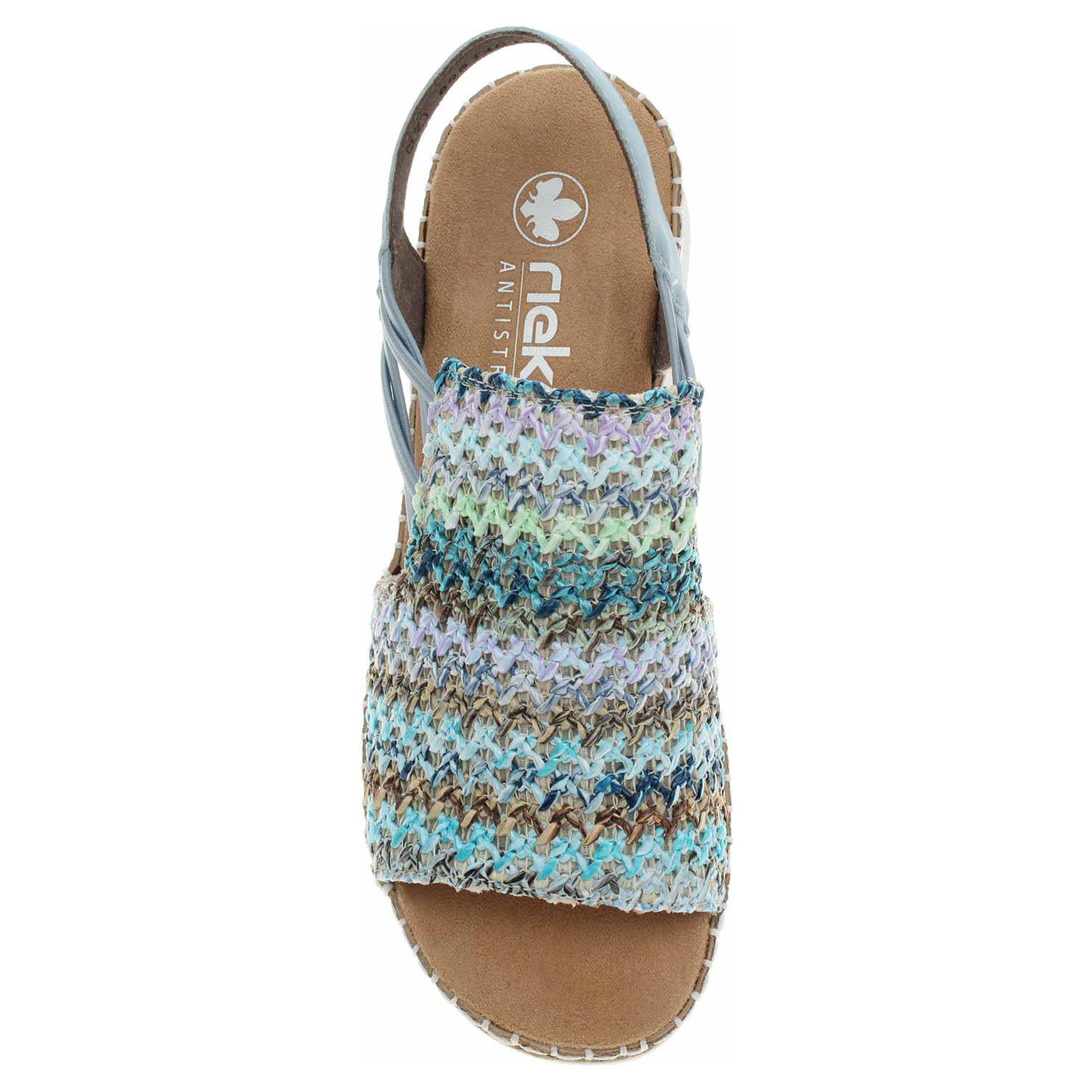 Boty Rieker - dámské sandály se svrškem kombinovaným textil/syntetika a s textilní podšívkou jsou vybavené vyměkčenou stélkou s textilní nášlapnou vrstvou. Klínek je vysoký 4,1 cm a platforma je vysoká 2,3 cm. Gumičky na vnější i na vnitřní straně kotníku umožňují pohodlné nazouvání a zajišťují vyšší stabilitu nohy v obuvi. Podešev je flexibilní a díky systému Antistress (lehkost, pružnost, prostornost a vynikající absorpce nárazů) Vám obuv zajistí pohodlí při každém kroku.