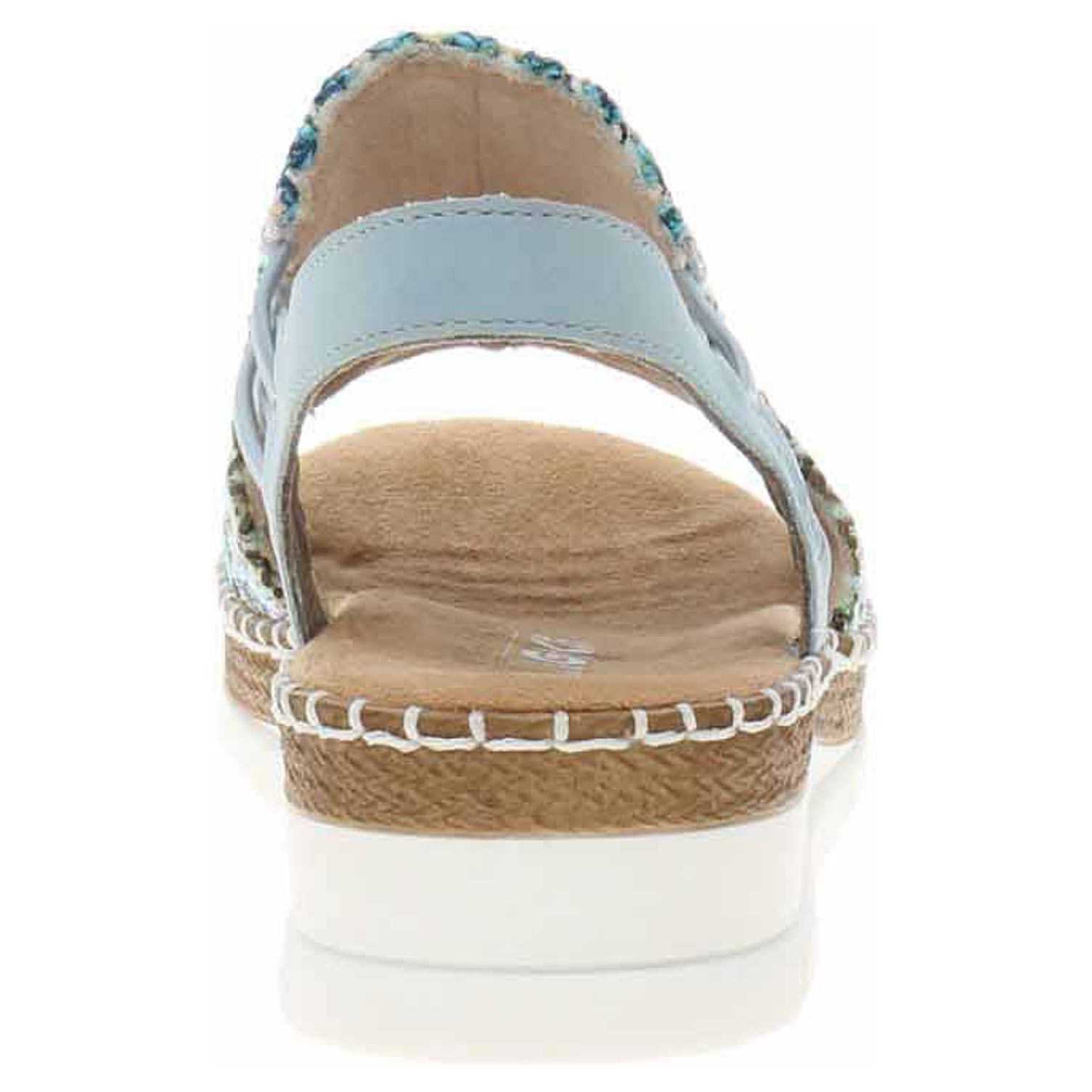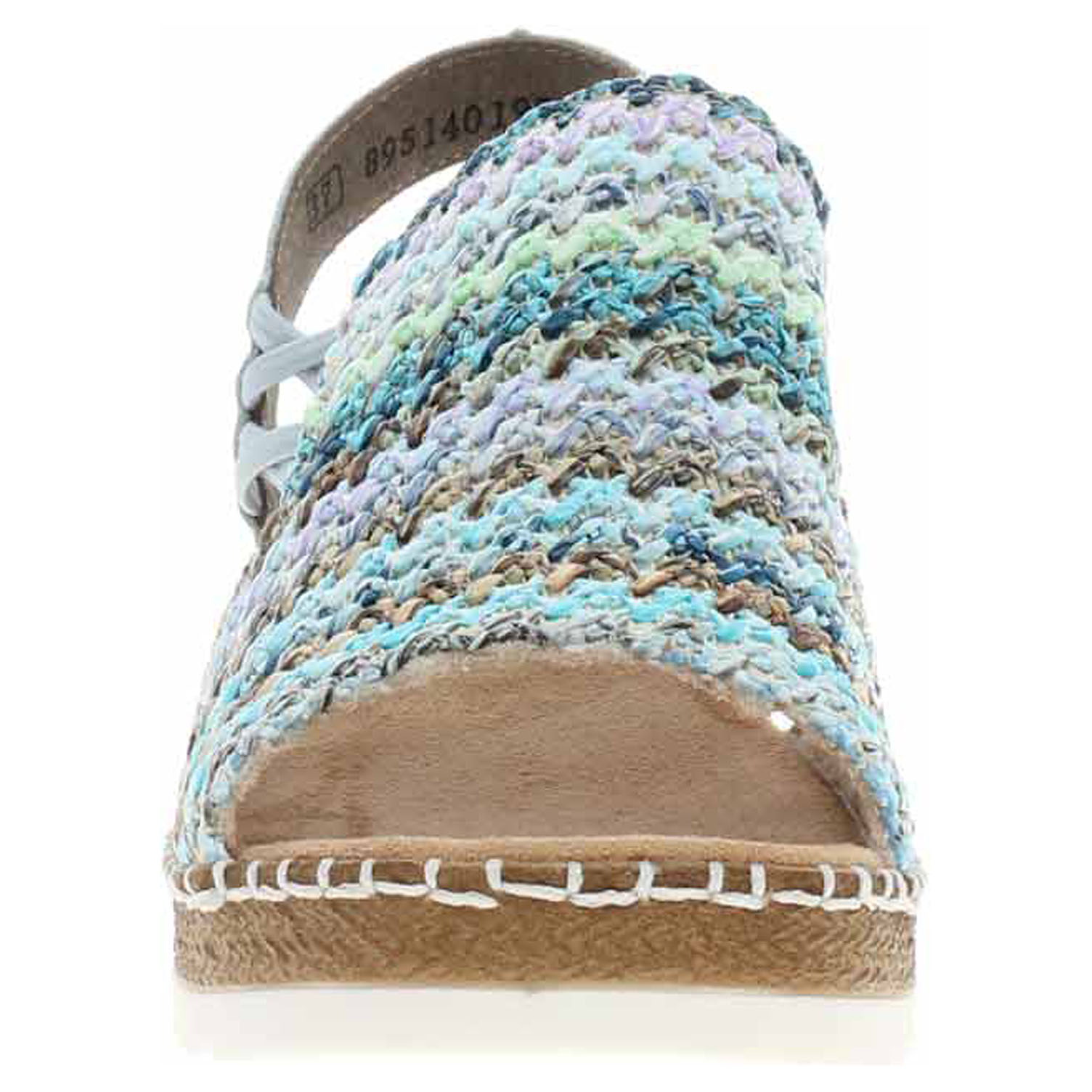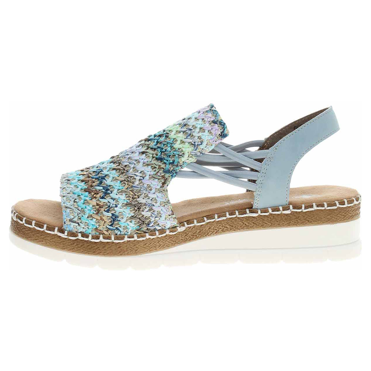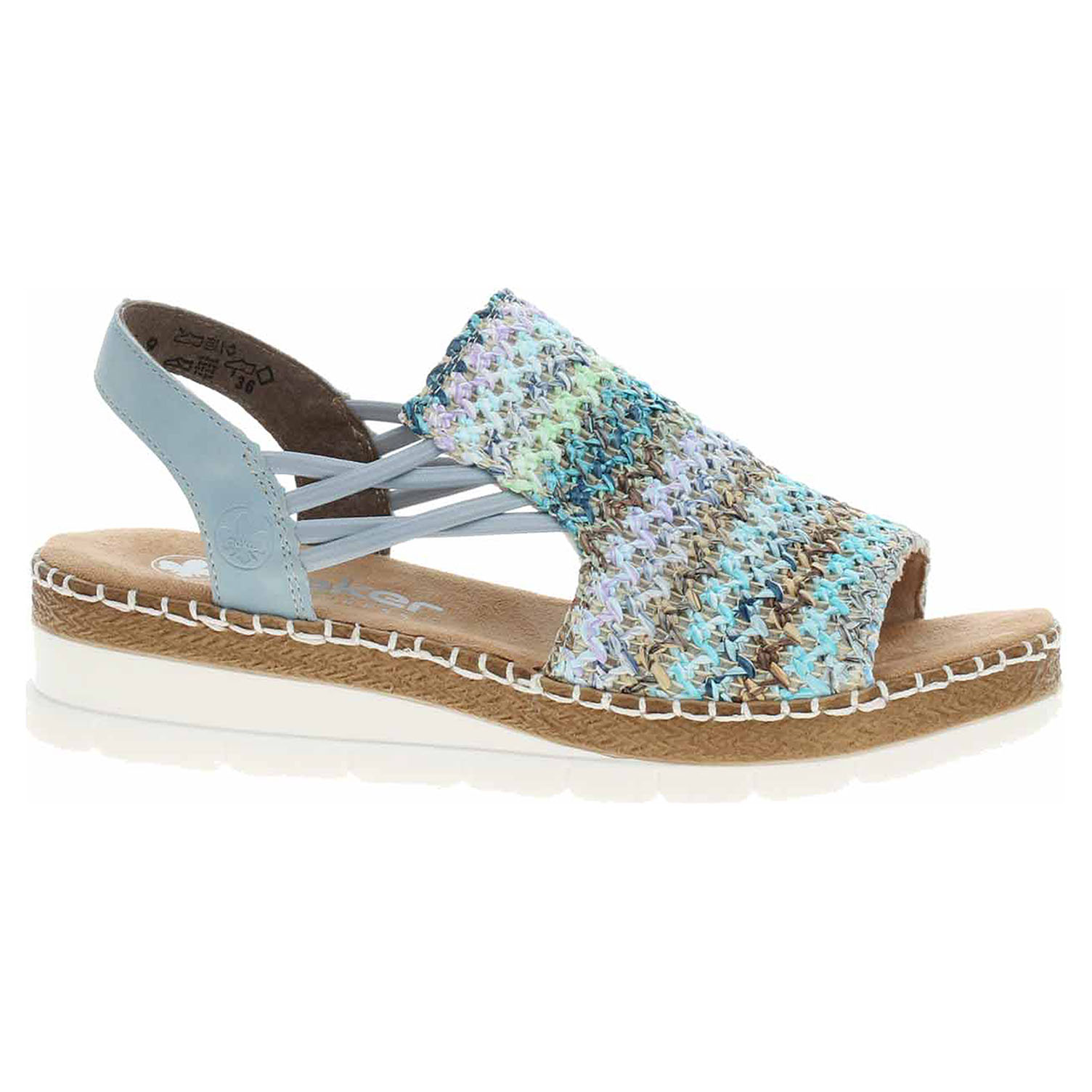 Boty Rieker - dámské sandály se svrškem kombinovaným textil/syntetika a s textilní podšívkou jsou vybavené vyměkčenou stélkou s textilní nášlapnou vrstvou. Klínek je vysoký 4,1 cm a platforma je vysoká 2,3 cm. Gumičky na vnější i na vnitřní straně kotníku umožňují pohodlné nazouvání a zajišťují vyšší stabilitu nohy v obuvi. Podešev je flexibilní a díky systému Antistress (lehkost, pružnost, prostornost a vynikající absorpce nárazů) Vám obuv zajistí pohodlí při každém kroku.