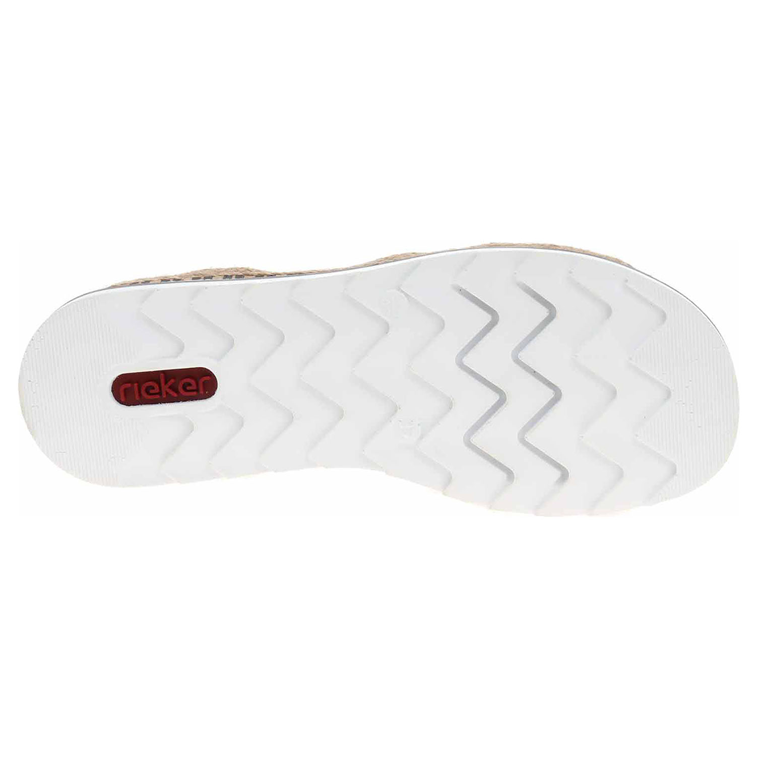 Boty Rieker - dámské sandály se svrškem i podšívkou ze syntetiky a s textilní, vyměkčenou stélkou mají klínek vysoký 4,4 cm a platformu 2,5 cm. Gumičky na vnější i na vnitřní straně nártu a na kotníku umožňují pohodlné nazouvání a zajišťují vyšší stabilitu nohy v obuvi. Podešev je flexibilní a díky systému Antistress (lehkost, pružnost, prostornost a vynikající absorpce nárazů) Vám obuv zajistí pohodlí při každém kroku.