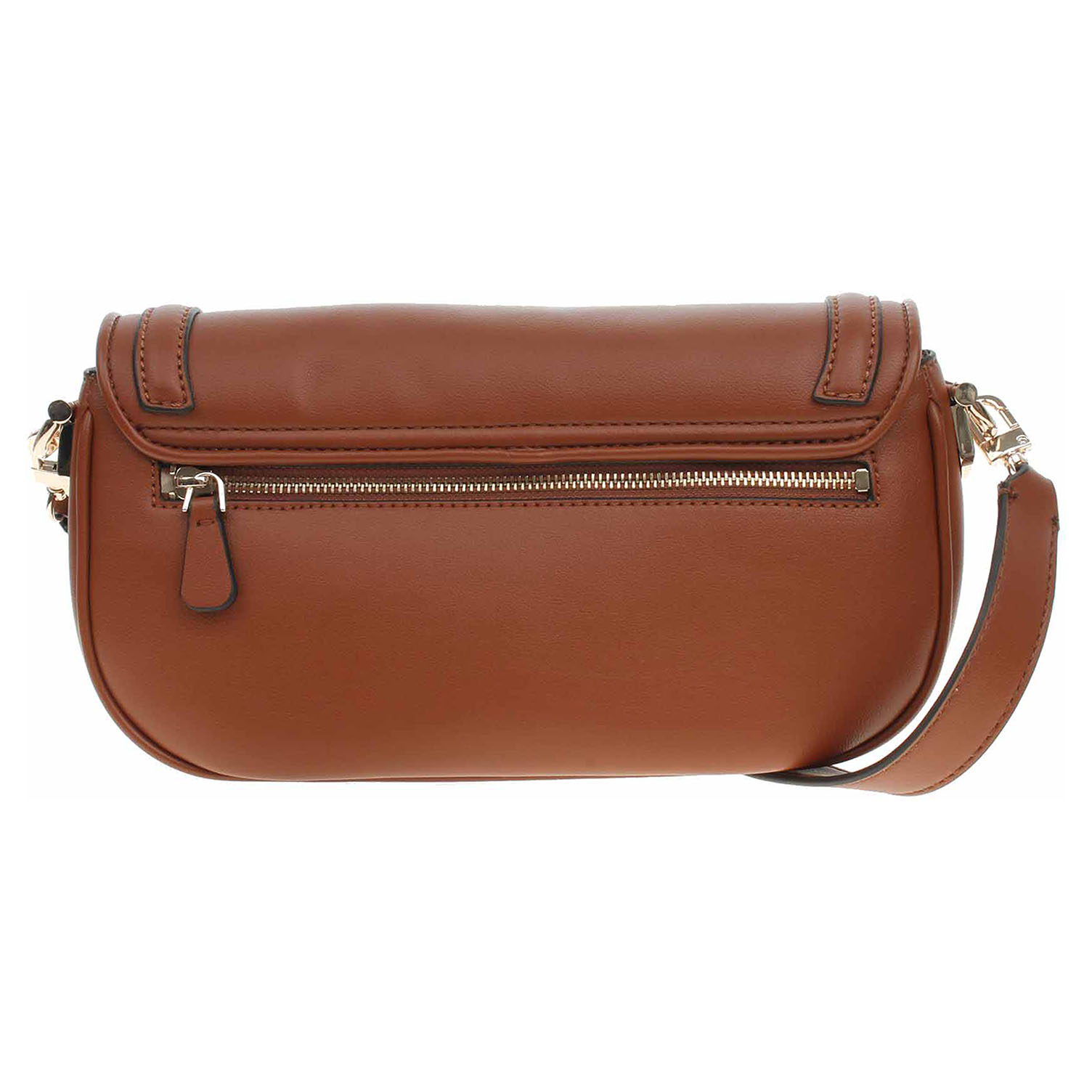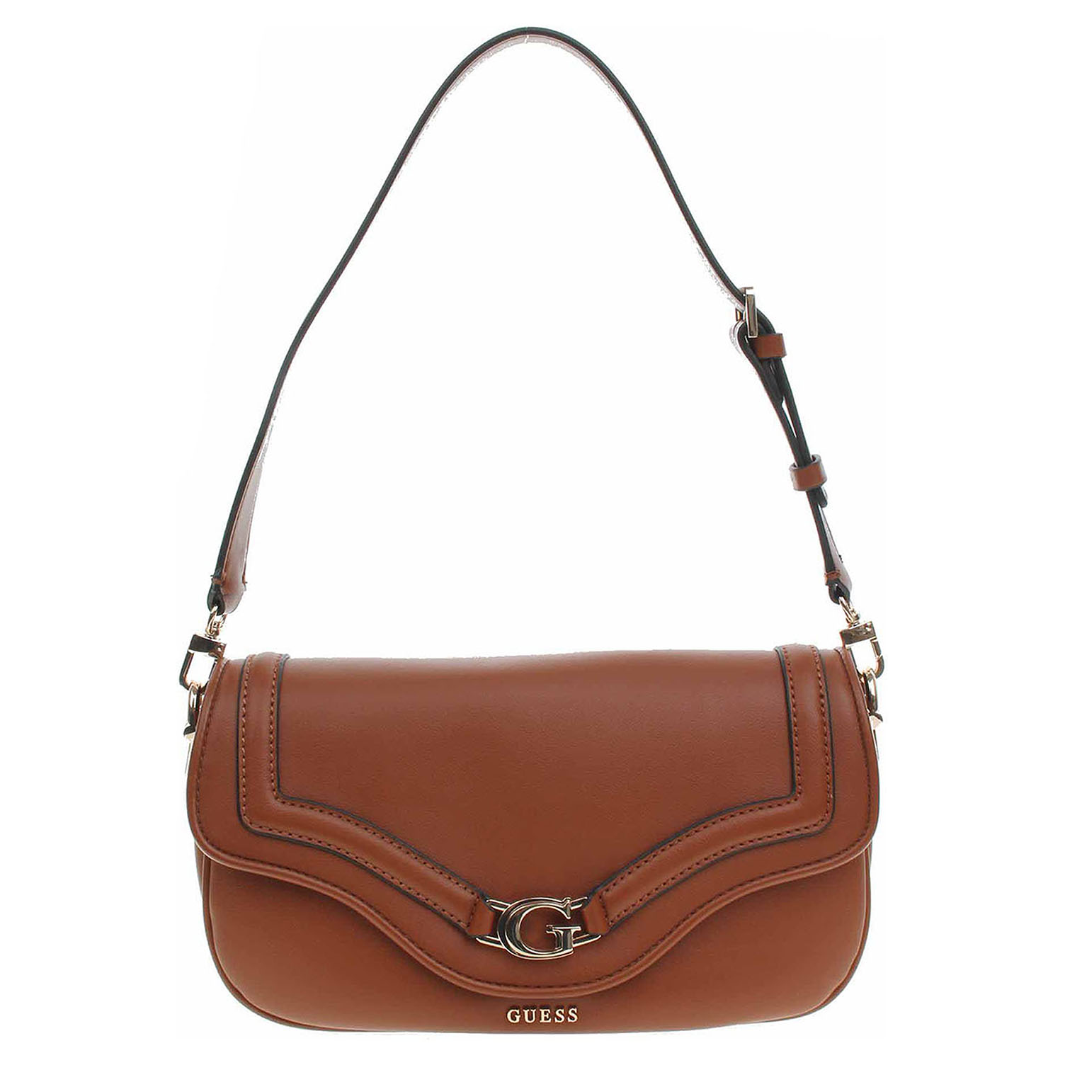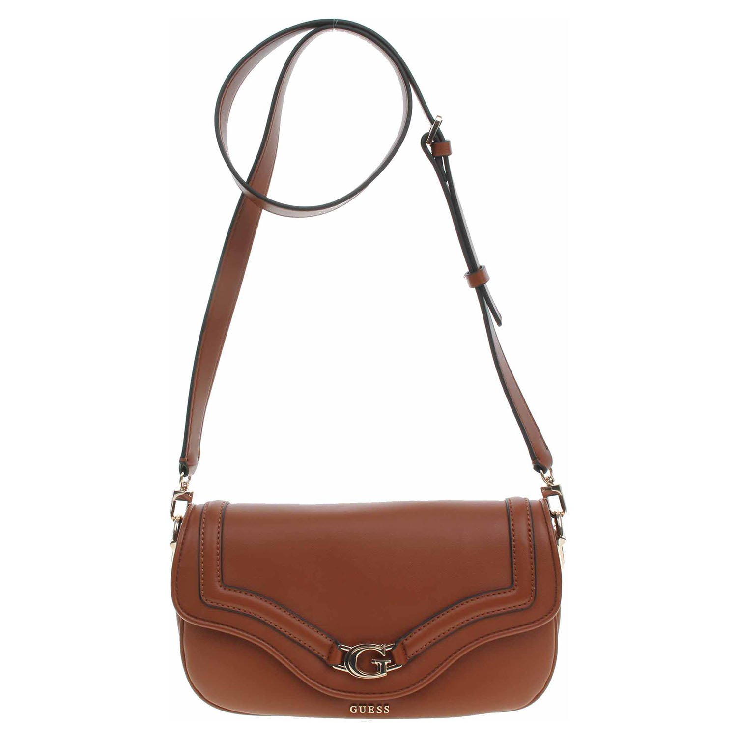 Guess - dámská klopnová kabelka Dea ze 100% polyuretanu a s podšívkou s personalizovaným logem z polyesteru se zapíná na dva magnety. Klopna je ozdobená zlatým logem. Zipy, kování, karabinky a nožičky jsou ve zlaté barvě. Kabelku s rozměry 29 x 15 x 6 cm je možno nosit přes rameno na odnímatelném regulovatelném popruhu (délka 110-130 cm) nebo jen v ruce za odepínatelný, kratší popruh (max délka cca 60 cm). Na zadní straně je kapsa se zipem a pod klopnou na přední straně je kapsa bez zapínání. Vnitřní výbava: v hlavní komoře je kapsa se zipem + 6x přihrádka na karty. Údržba: Neprat. Skladujte v dodaném protiprachovém sáčku. Pro správnou péči o tento doplněk dodržujte pokyny na štítku.
