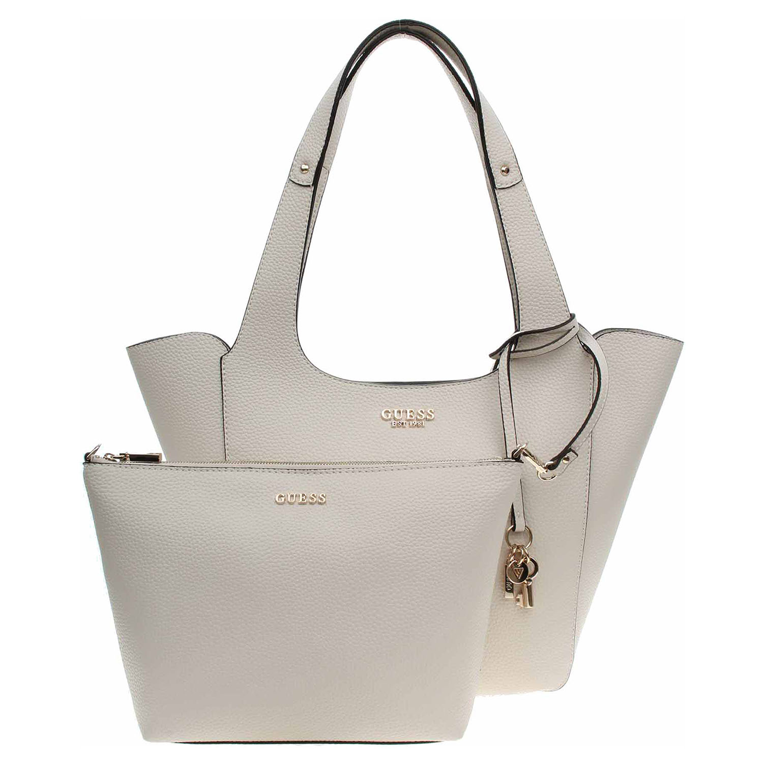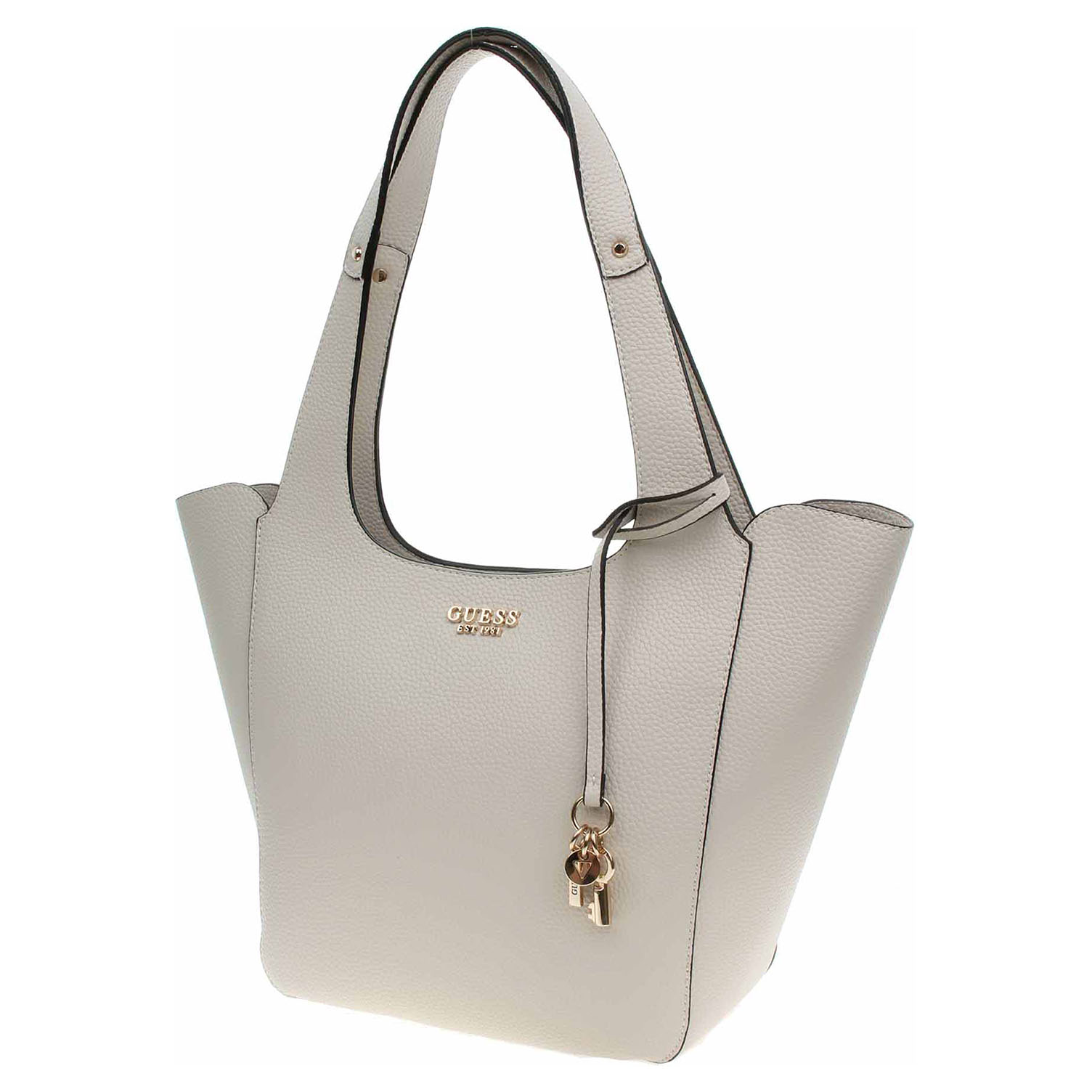 Guess - dámská kabelka ze syntetického materiálu (100% polyuretan) se zapínáním na magnet má rozměry 46 x 23 x 13. Kabelku se zlatým kováním je možno nosit v ruce nebo přes rameno (výška ucha 27 cm). Součástí kabelky je etue se zapínáním na zip, která má rozměry 32 x 20 x 6 cm, a uvnitř kabelky je připevněná řemínkem s karabinkou. Vnitřní výbava: 1x kapsa bez zapínání. Údržba: Neprat. Skladujte v přiloženém prachovém sáčku. Pro správnou péči o tento doplněk dodržujte pokyny na štítku.