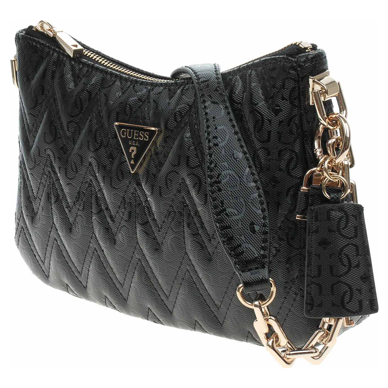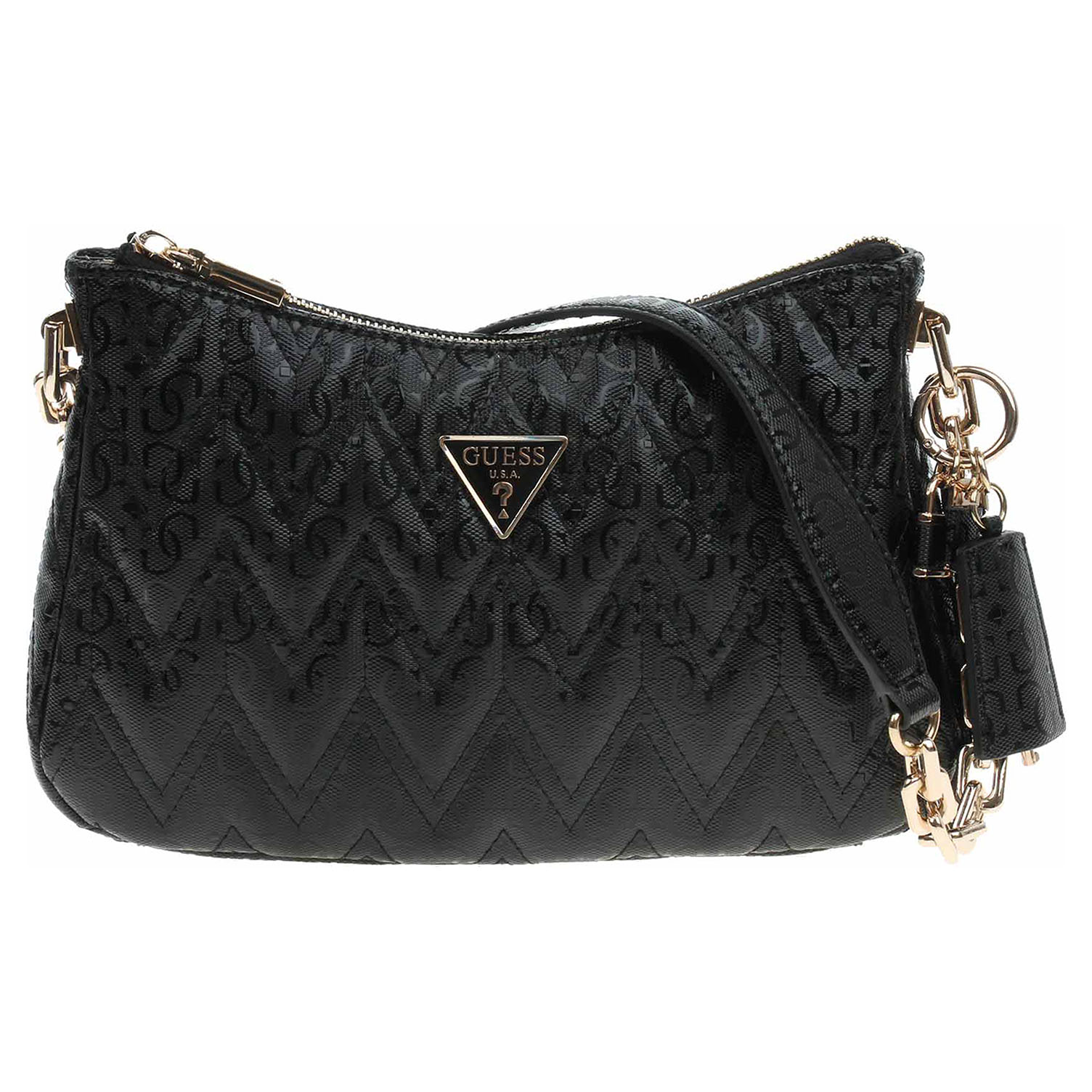 Guess Adelard - dámská kabelka s prošívaným svrškem se zapíná na zip a je vyrobená ze 100% polyuretanu (podšívka - 80% polyester / 20% bavlna) a má rozměry 27 x 17 x 5 cm (rozměr A4 se do kabelky nevejde). Na přední straně kabelky je kovové logo trojúhelníku a je ozdobená odnímatelným přívěškem s logem. Na zadní straně kabelky je kapsa se zipem. Karabinka, kroužky, zip i logo jsou z leštěného kovu zlaté barvy. Vnitřní výbava: 1x kapsa se zipem, 2x kapsička bez zapínání. Součástí balení je praktický dustbag pro uložení kabelky.