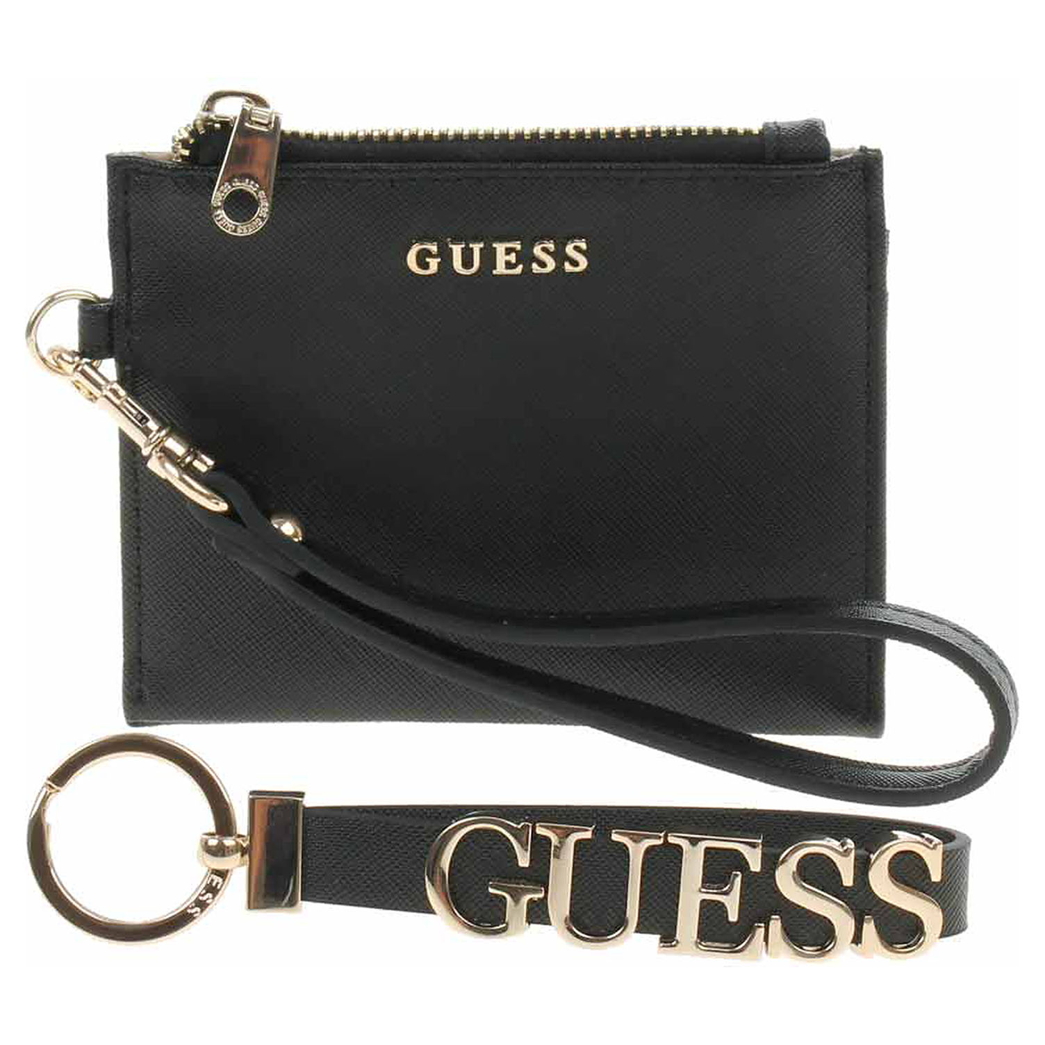 Guess Gift Pouch + Keyring - dámské pouzdro (peněženka) s klíčenkou v dárkové krabičce. Pouzdro (100% polyuteretan / 100% polyester) je vybavené odepínatelným poutkem s karabinkou a zapíná se na zip. Na zadní straně jsou dvě kapsičky bez zapínání.