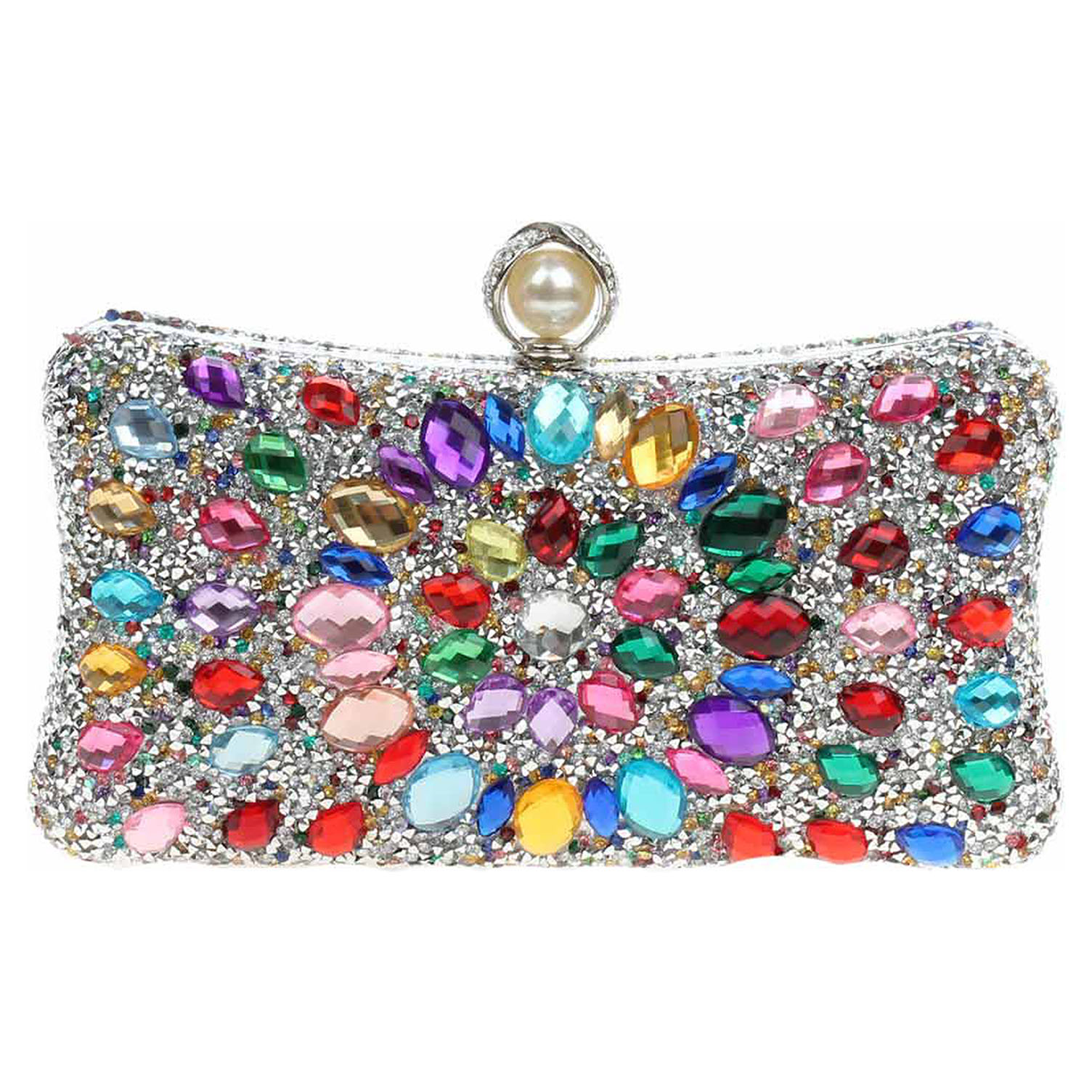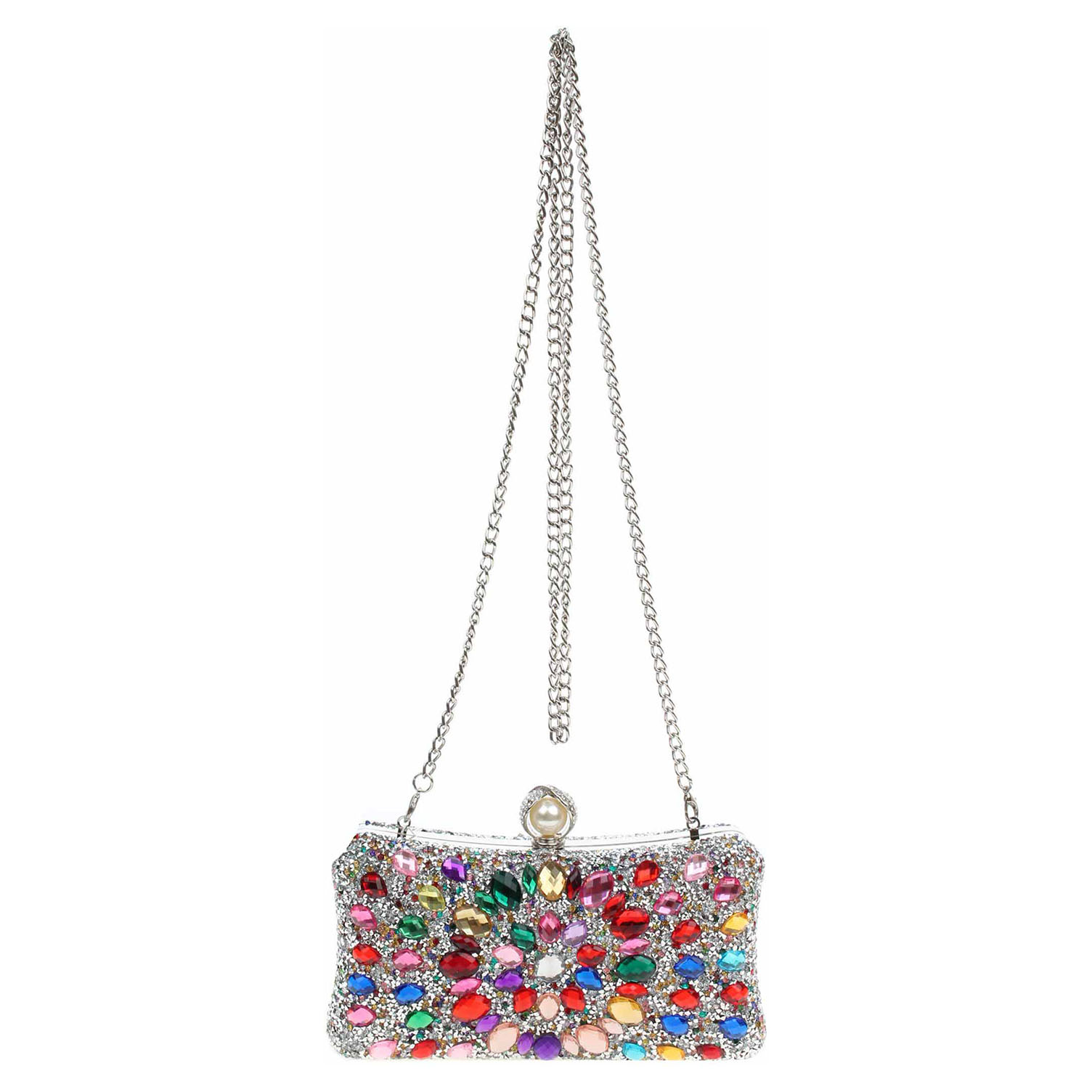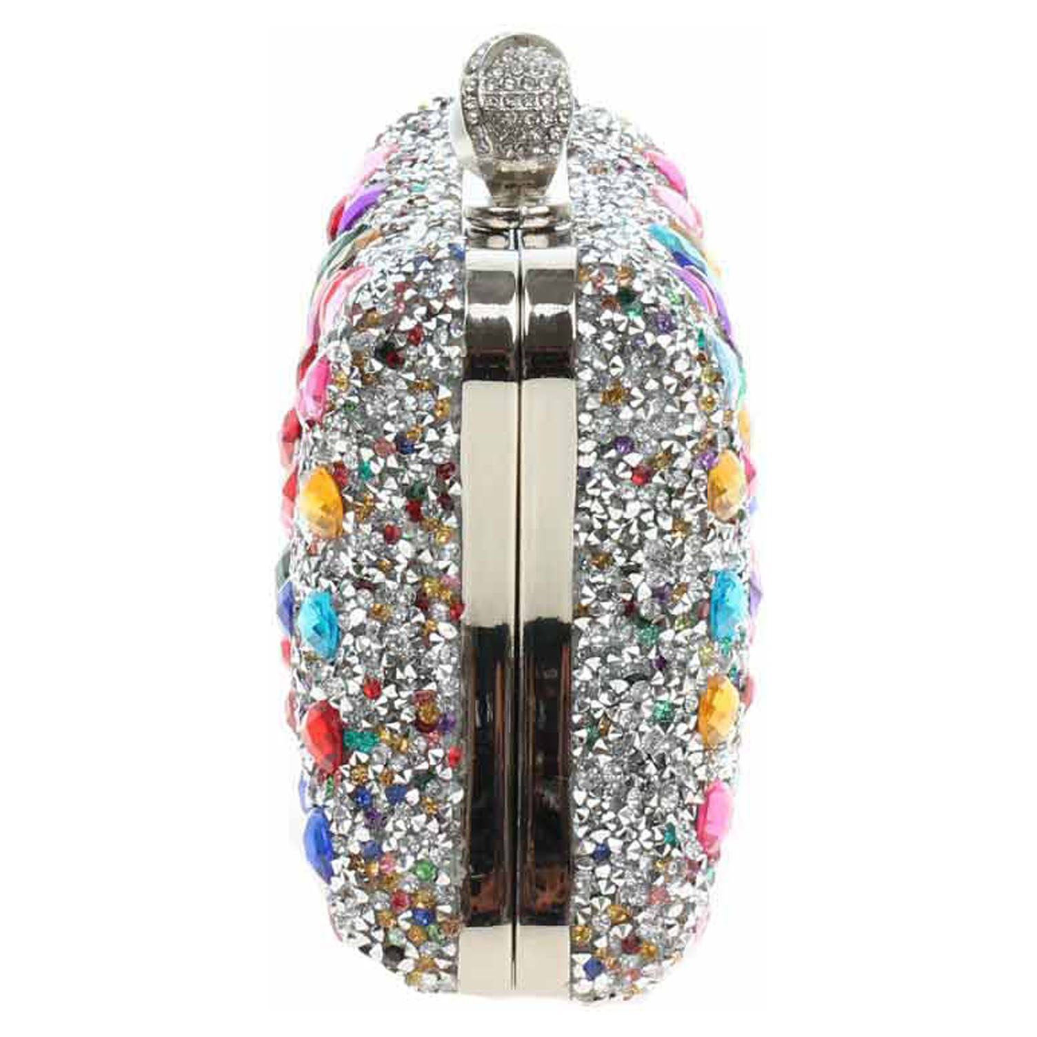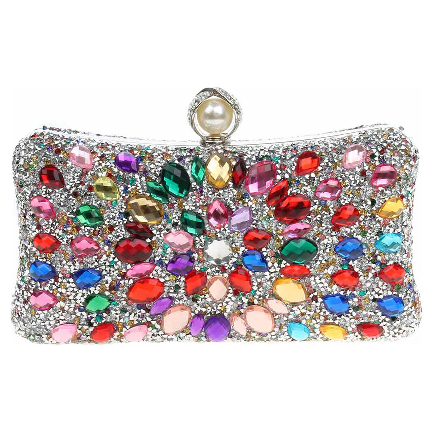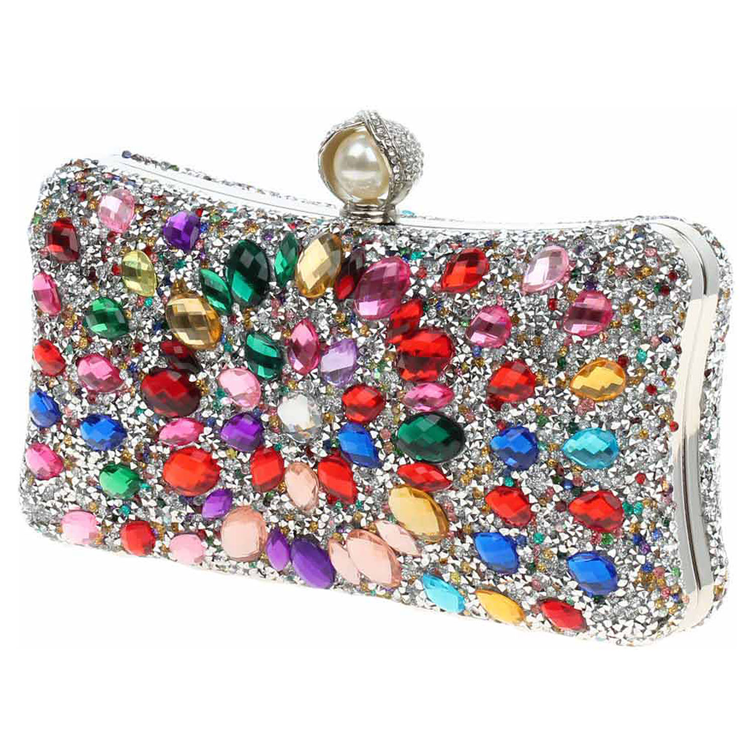 Laura Vita - dámská společenská kabelka se zapínáním na klip je pokrytá barevnými krystaly a podšívku má textilní. Rozměry: 19 x 10 x 5 cm. Kabelku je možno nosit na řetízku přes rameno nebo po odepnutí jako psaníčko v ruce.
