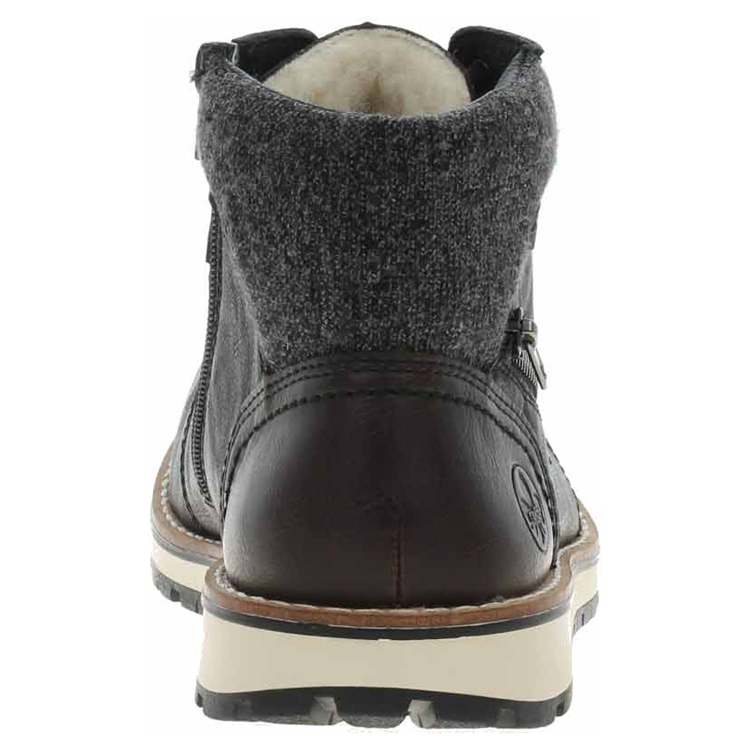 Boty Rieker - lepená pánská kotníková obuv se svrškem ze syntetiky a s textilním lemem kolem kotníku má textilní stélku, je vyteplená podšívkou z střižní ovčí vlny a je vybavená vodoodpudivou membránou RiekerTex. Pohodlné nazouvání zajišťuje šněrování a zip na vnitřní straně. Zip na vnější straně má pouze ozdobnou funkci. Klínek je vysoký 3,- cm. Podešev je flexibilní a díky systému Antistress skvěle tlumí nárazy a otřesy. Lepená obuv - pevnost lepeného spoje může být negativně ovlivněna promáčením nebo propocením, event. opakovaným používáním nedostatečně vysušené obuvi. Při neopatrné chůzi může dojít k mechanickému uvolnění lepeného spoje - ukopnutí.