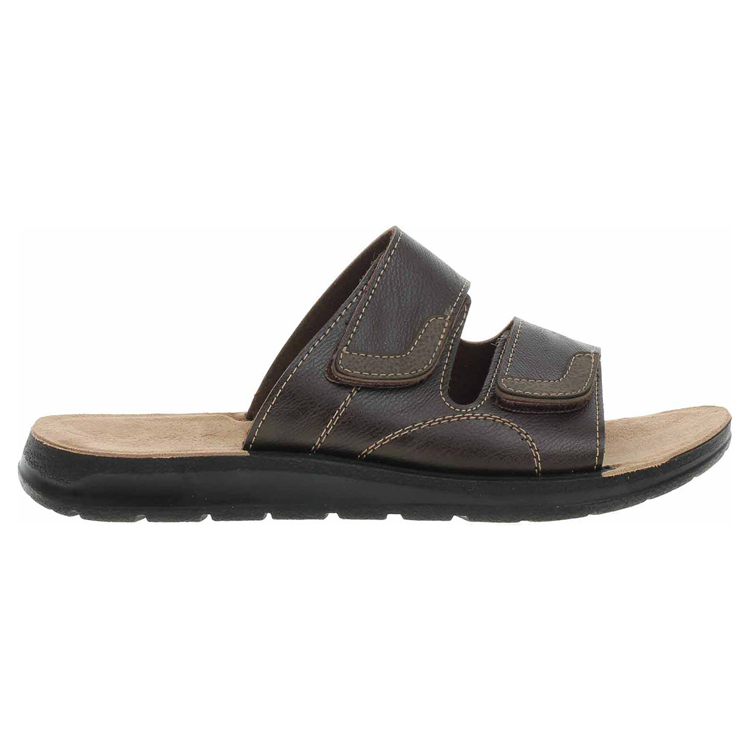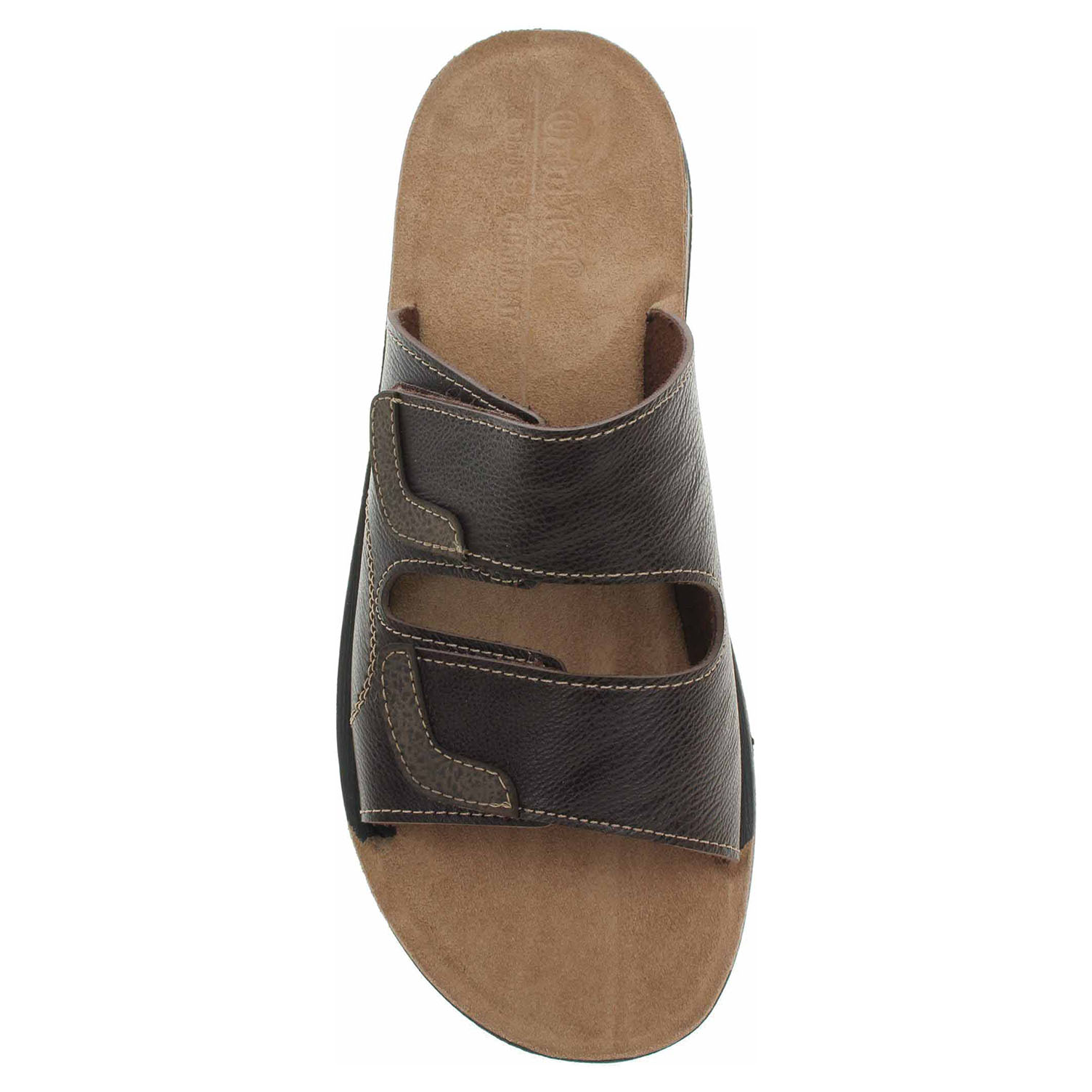 Boty Orto Med - pánské domácí pantofle s pásky přes nárt mají svršek i podšívku ze syntetiky a jsou vybavené vyměkčenou stélkou z usně. Pásky přes nárt je možno regulovat pomocí suchých zipů. Klínek je vysoký 2,5 cm.